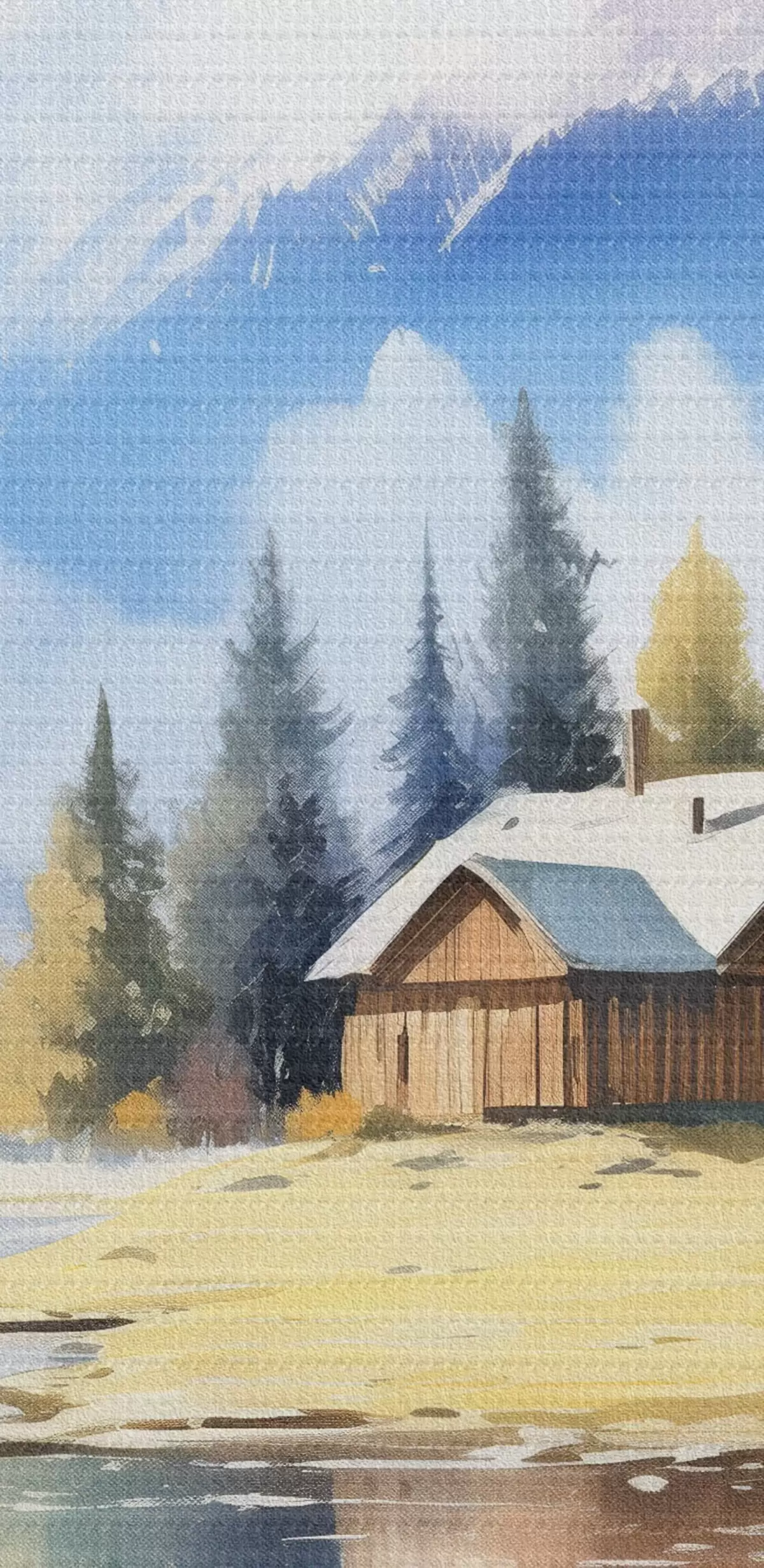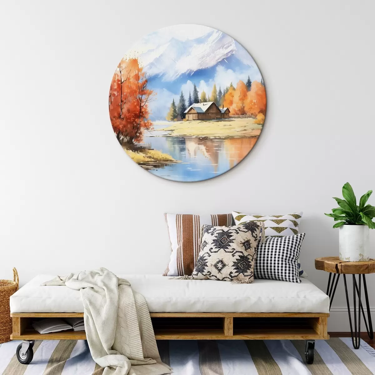 Ronde schilderijen Herfstlandschap aan het meer met een huis en bergen Nr r46184