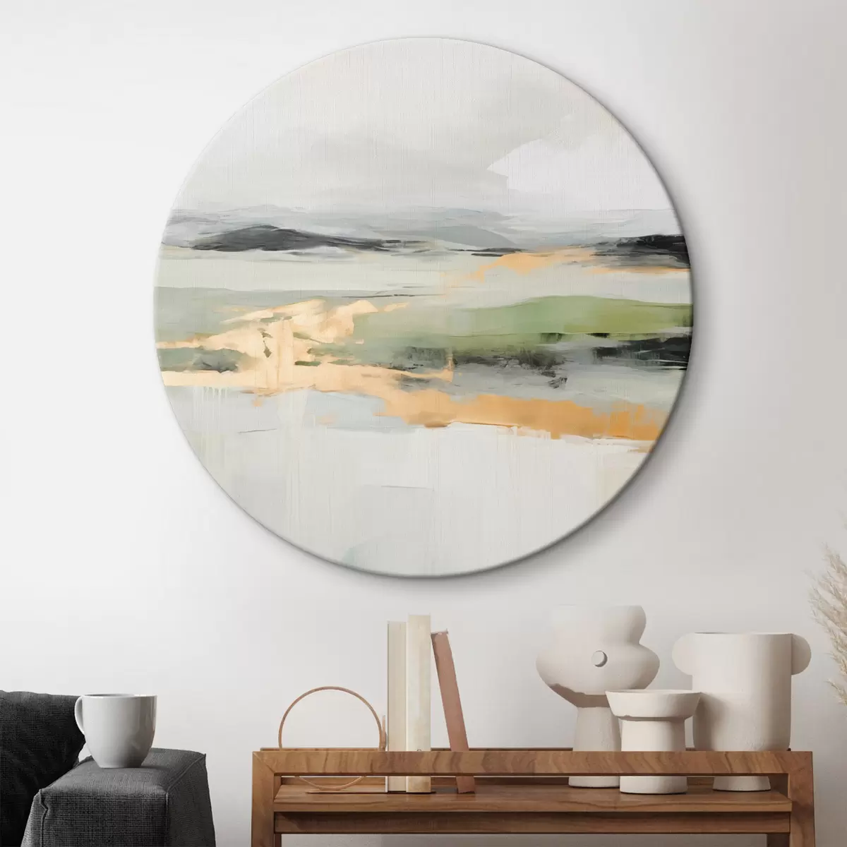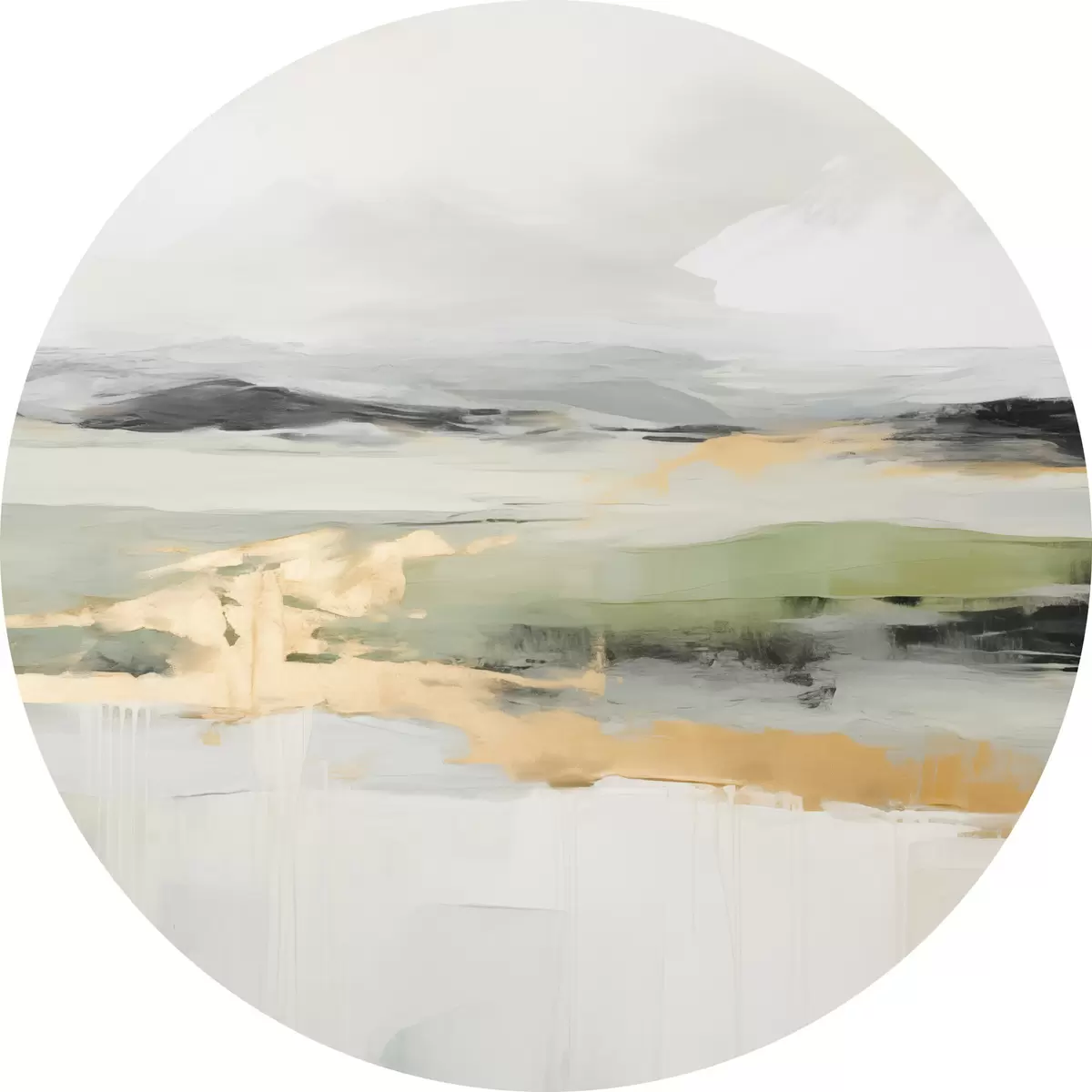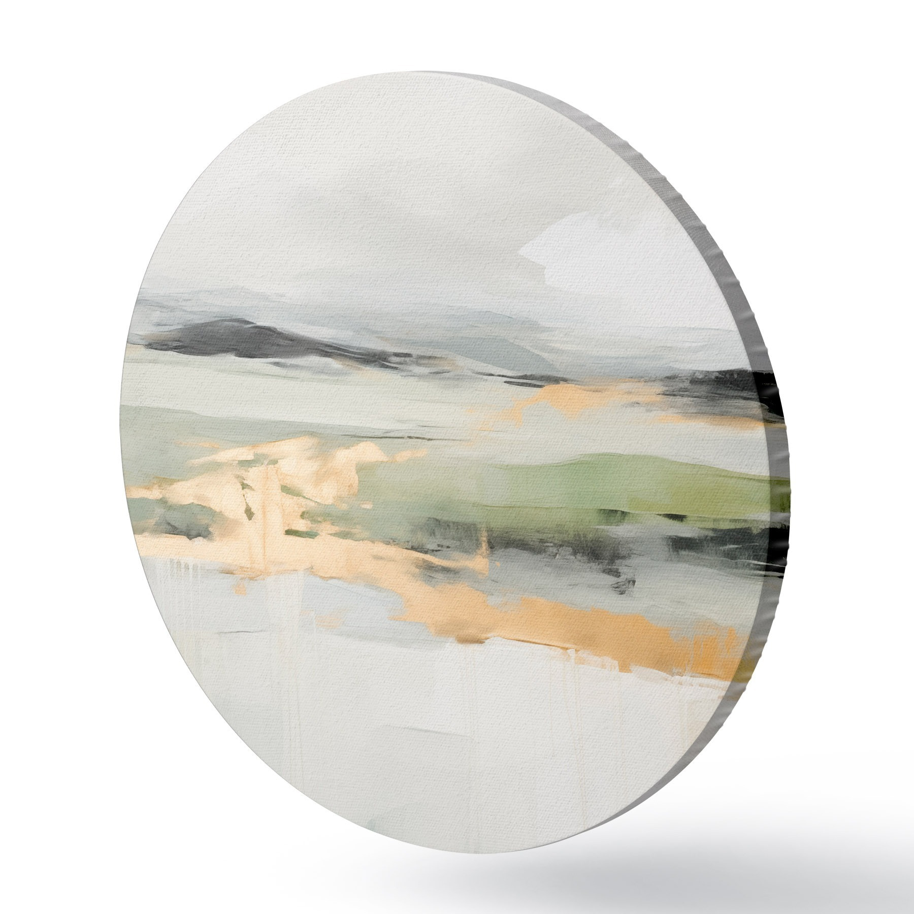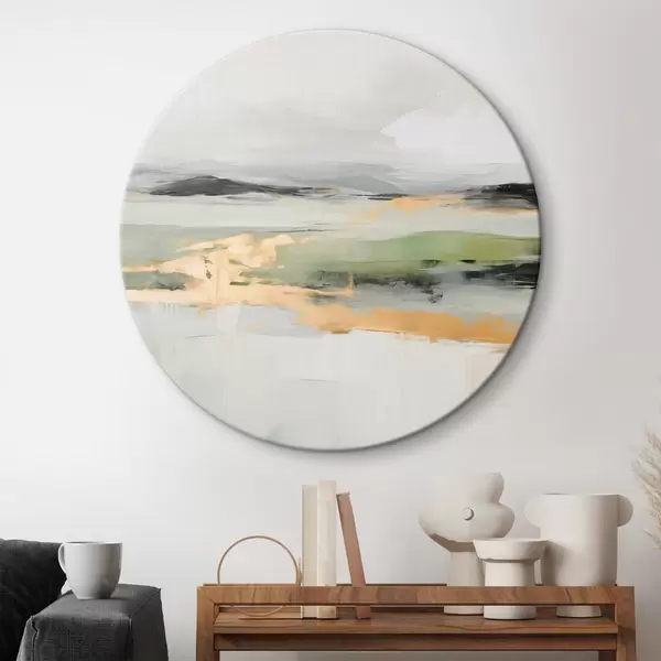 Ronde schilderijen Abstract landschap met gele accenten, een minimalistische compositie van land, water en lucht, met gedempte kleuren Nr r46269