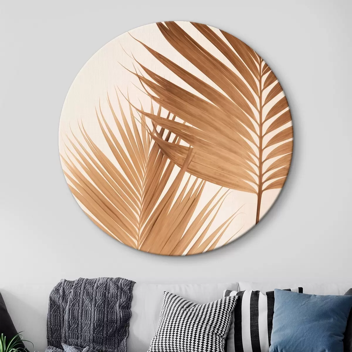 Ronde schilderijen Palmbladeren in bruine tinten, neutrale achtergrond, minimalistische stijl, natuurlijke belichting, tropische sfeer Nr r46274
