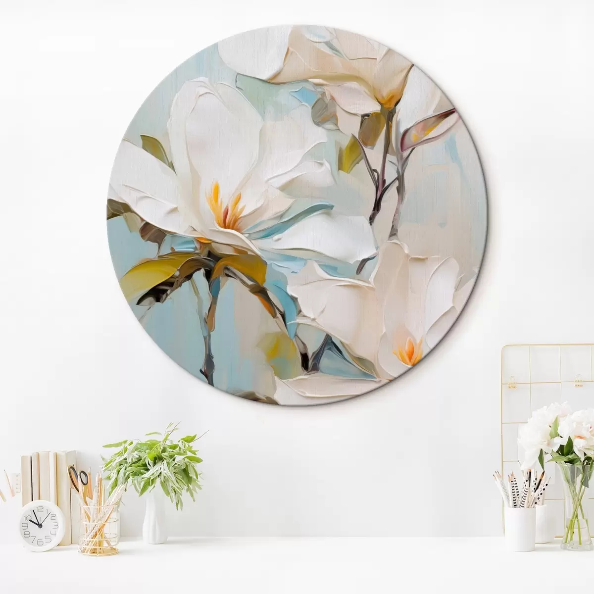 Ronde schilderijen Witte magnoliabloemen, lichtblauwe achtergrond met zachte penseelstreken, olieverfstijl, impasto-textuur Nr r46276