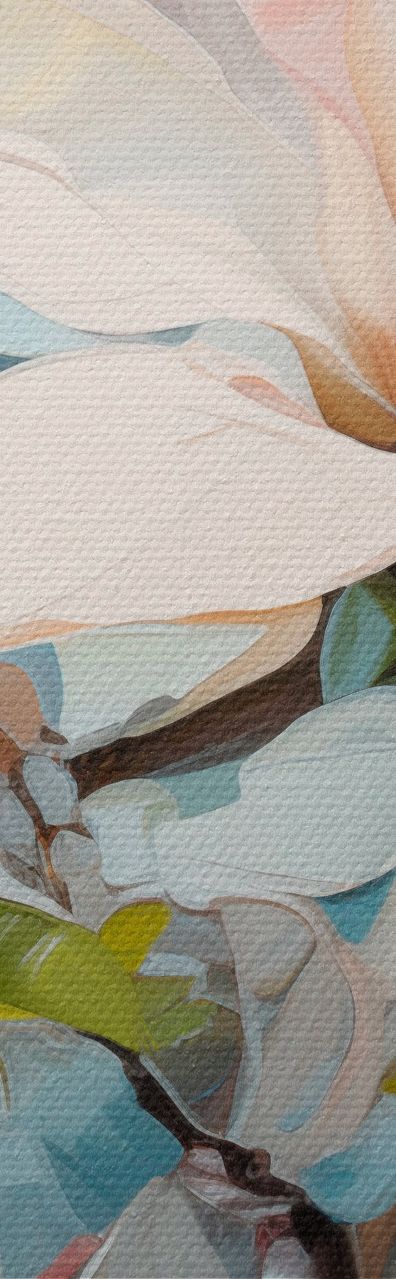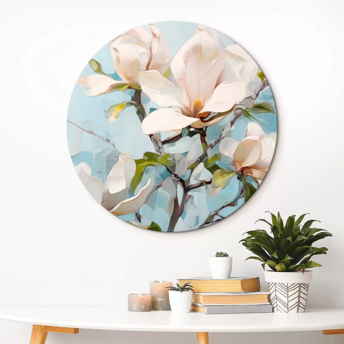 Ronde schilderijen Witte magnoliabloemen, lichtblauwe achtergrond met zachte penseelstreken, olieverfstijl, impasto-textuur r46277