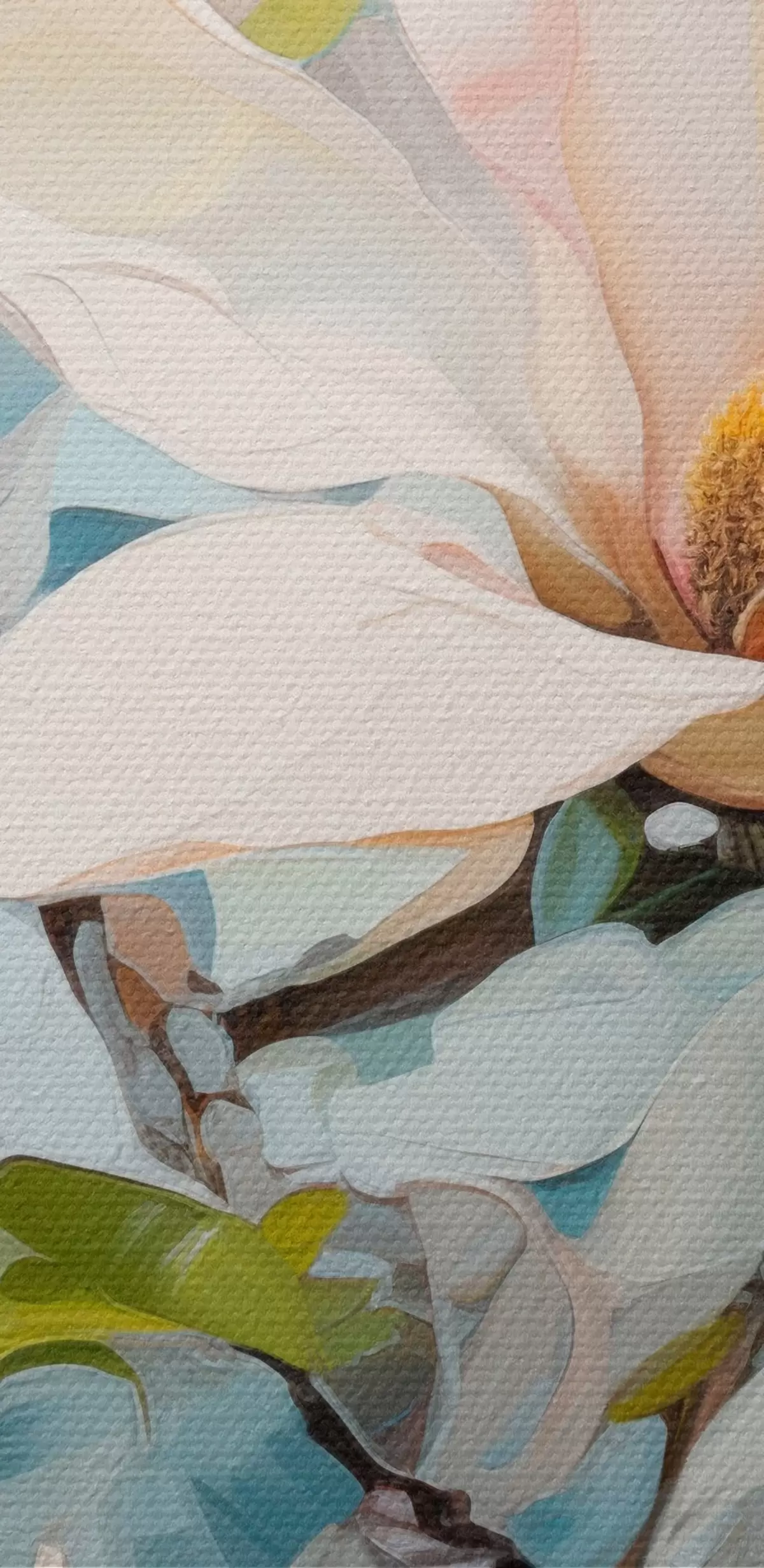 Ronde schilderijen Witte magnoliabloemen, lichtblauwe achtergrond met zachte penseelstreken, olieverfstijl, impasto-textuur Nr r46277