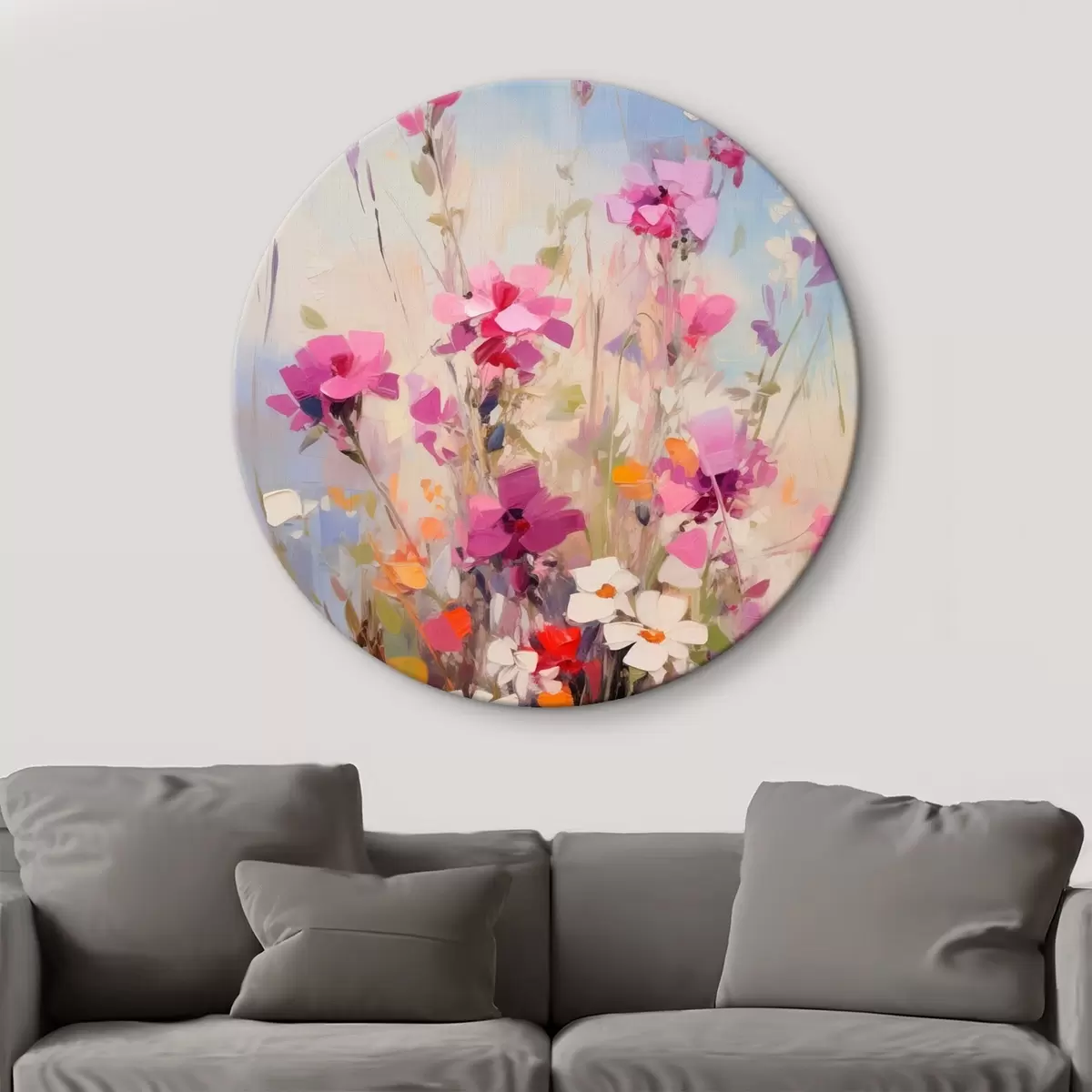Ronde schilderijen Levendige roze, witte en groene bloemen tegen een zachte, pastelkleurige achtergrond Nr r46278