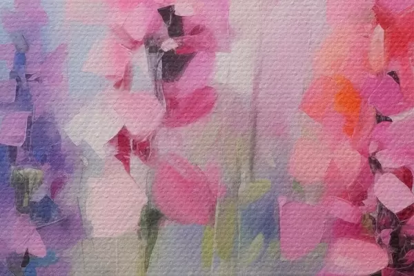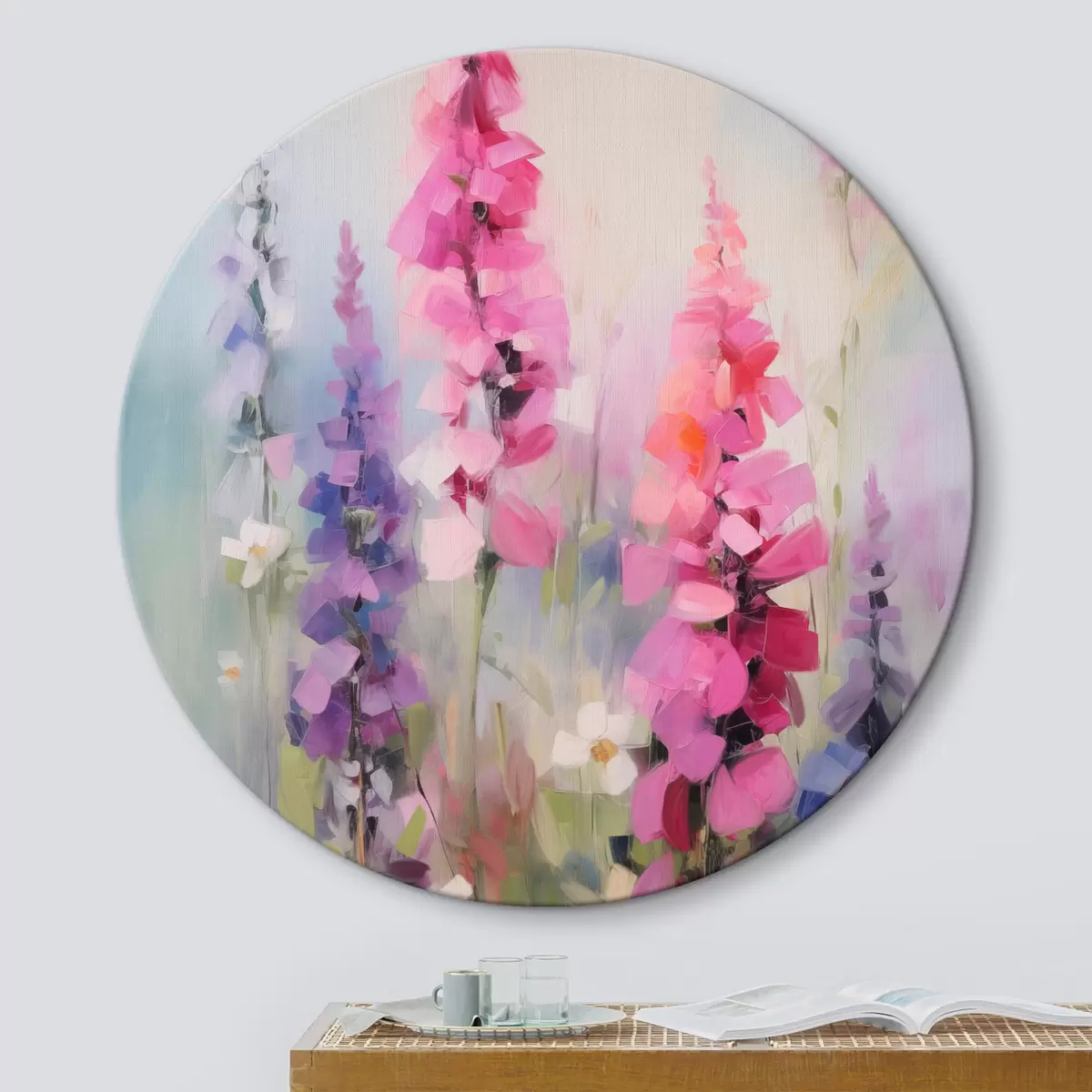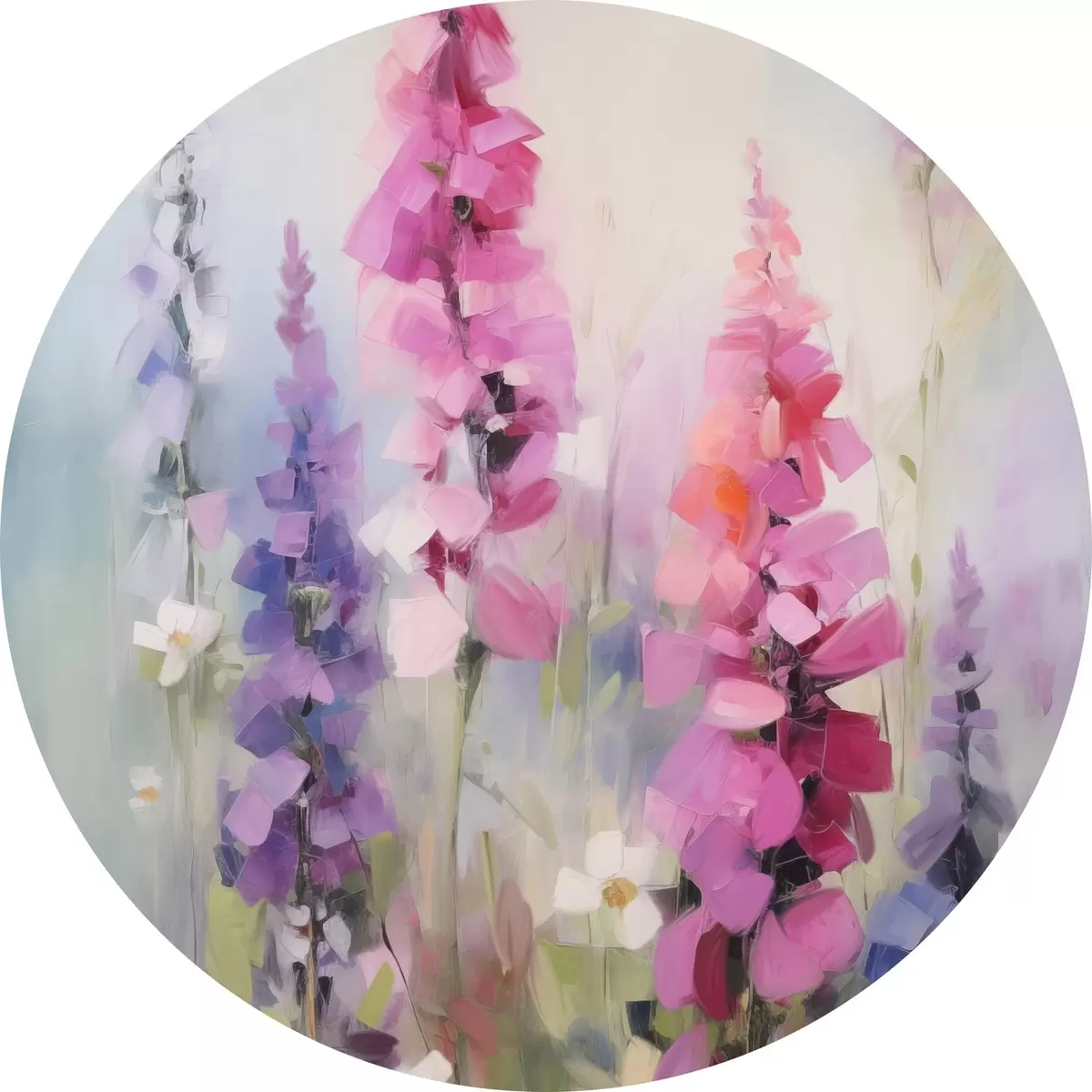 Ronde schilderijen Roze en paarse bloemen met witte madeliefjes in een veld, zachte penseelstreken, pastelkleuren, impressionistische stijl Nr r46279