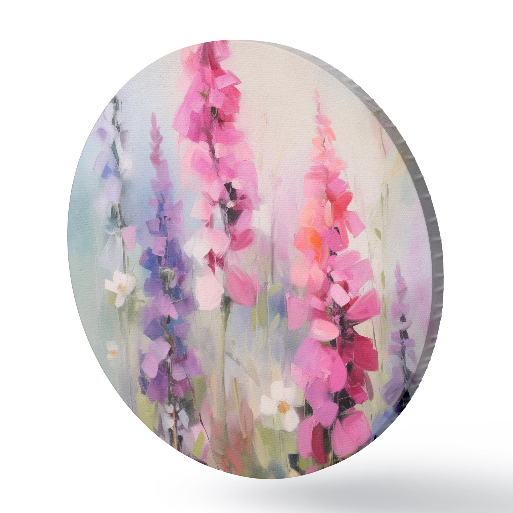 Ronde schilderijen Roze en paarse bloemen met witte madeliefjes in een veld, zachte penseelstreken, pastelkleuren, impressionistische stijl r46279