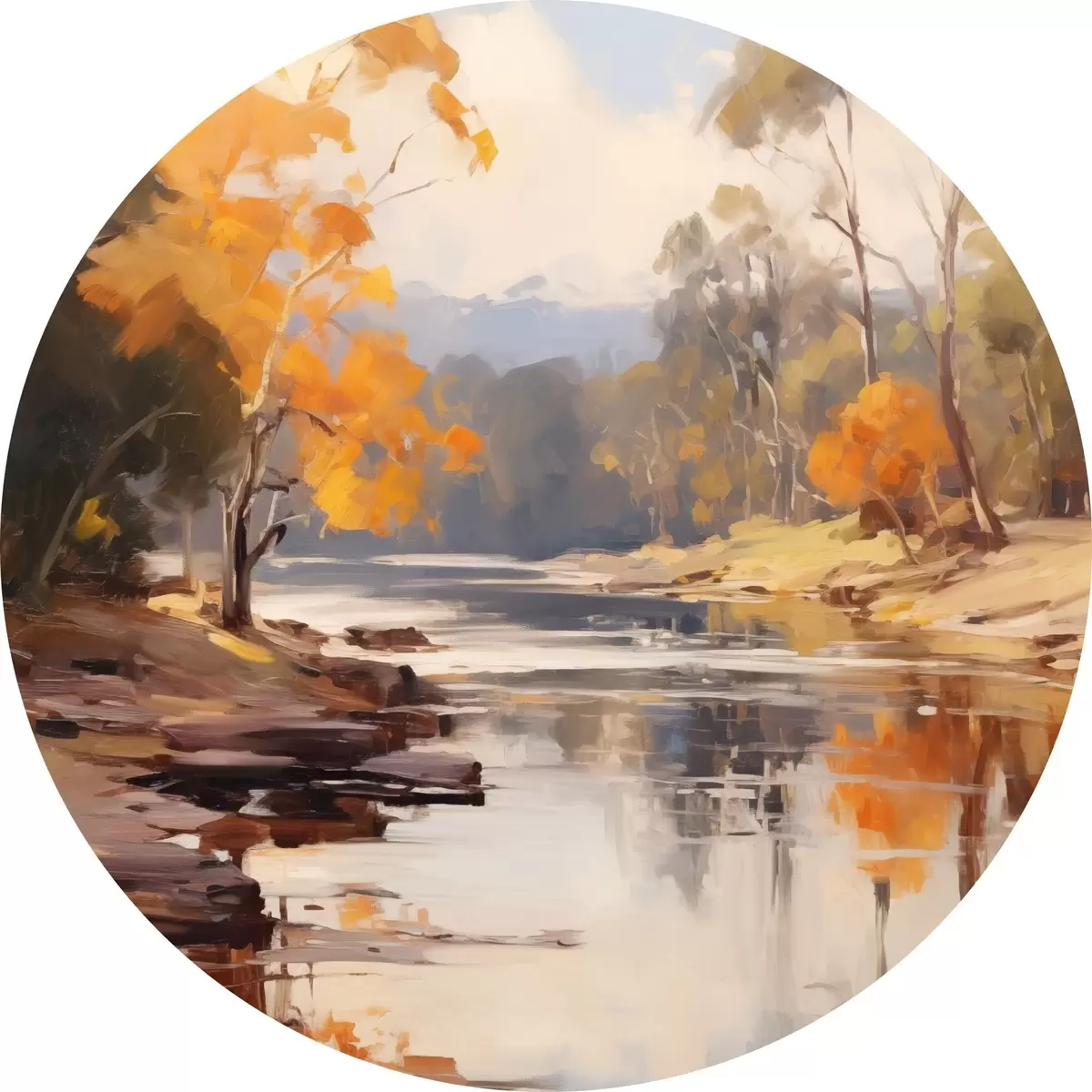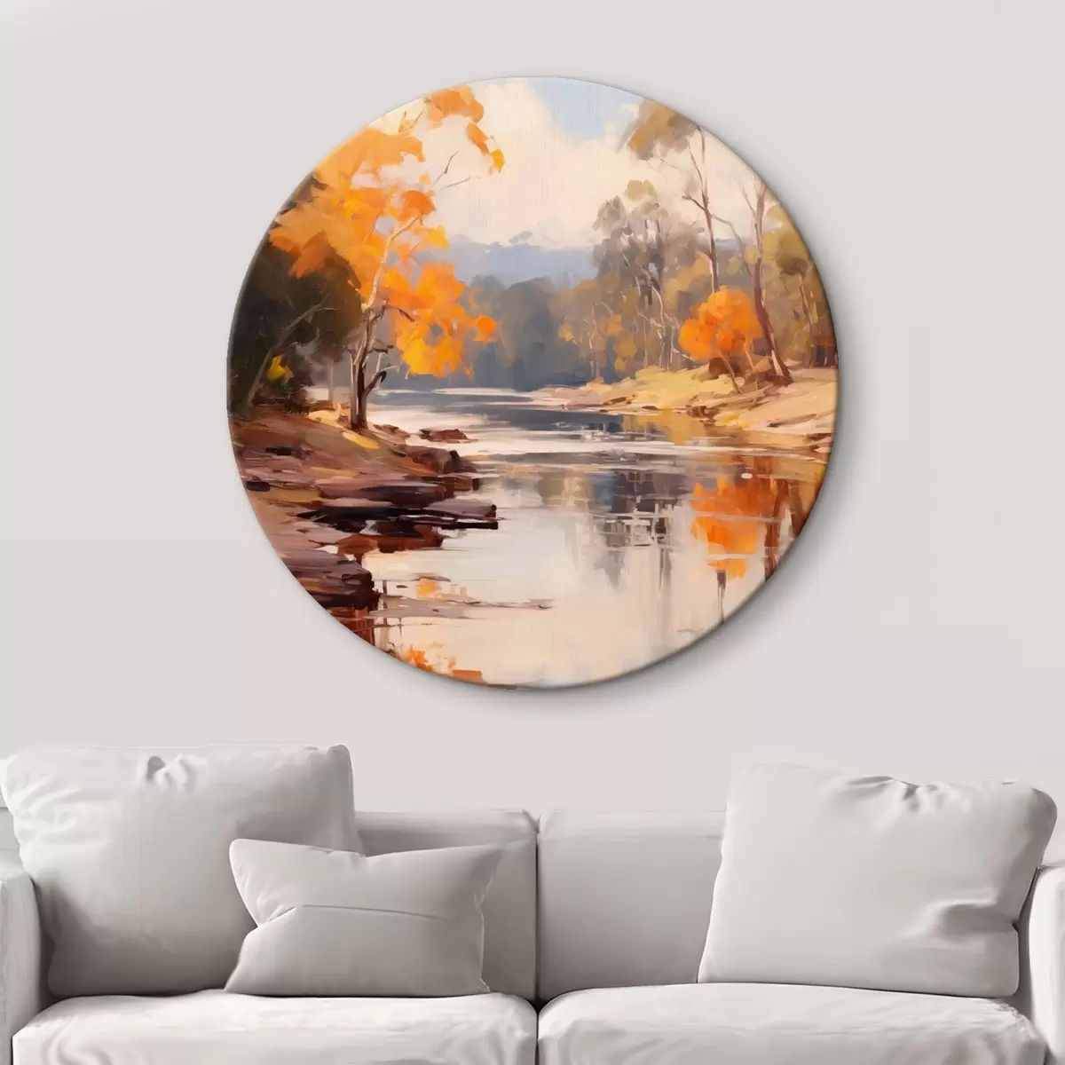 Ronde schilderijen Herfstlandschap, rivier met bomen aan de oever, bos op de achtergrond, weerspiegelingen op het water Nr r46280