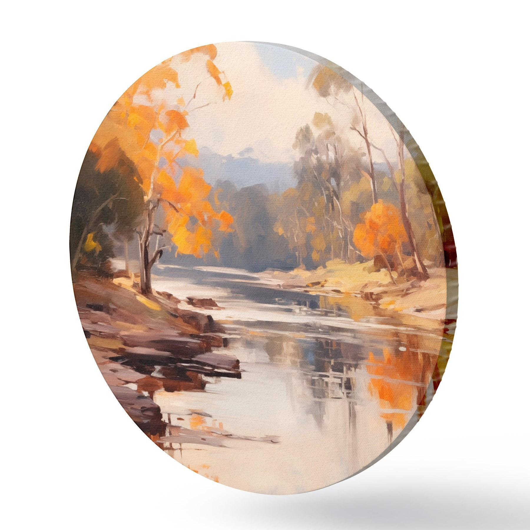 Ronde schilderijen Herfstlandschap, rivier met bomen aan de oever, bos op de achtergrond, weerspiegelingen op het water r46280