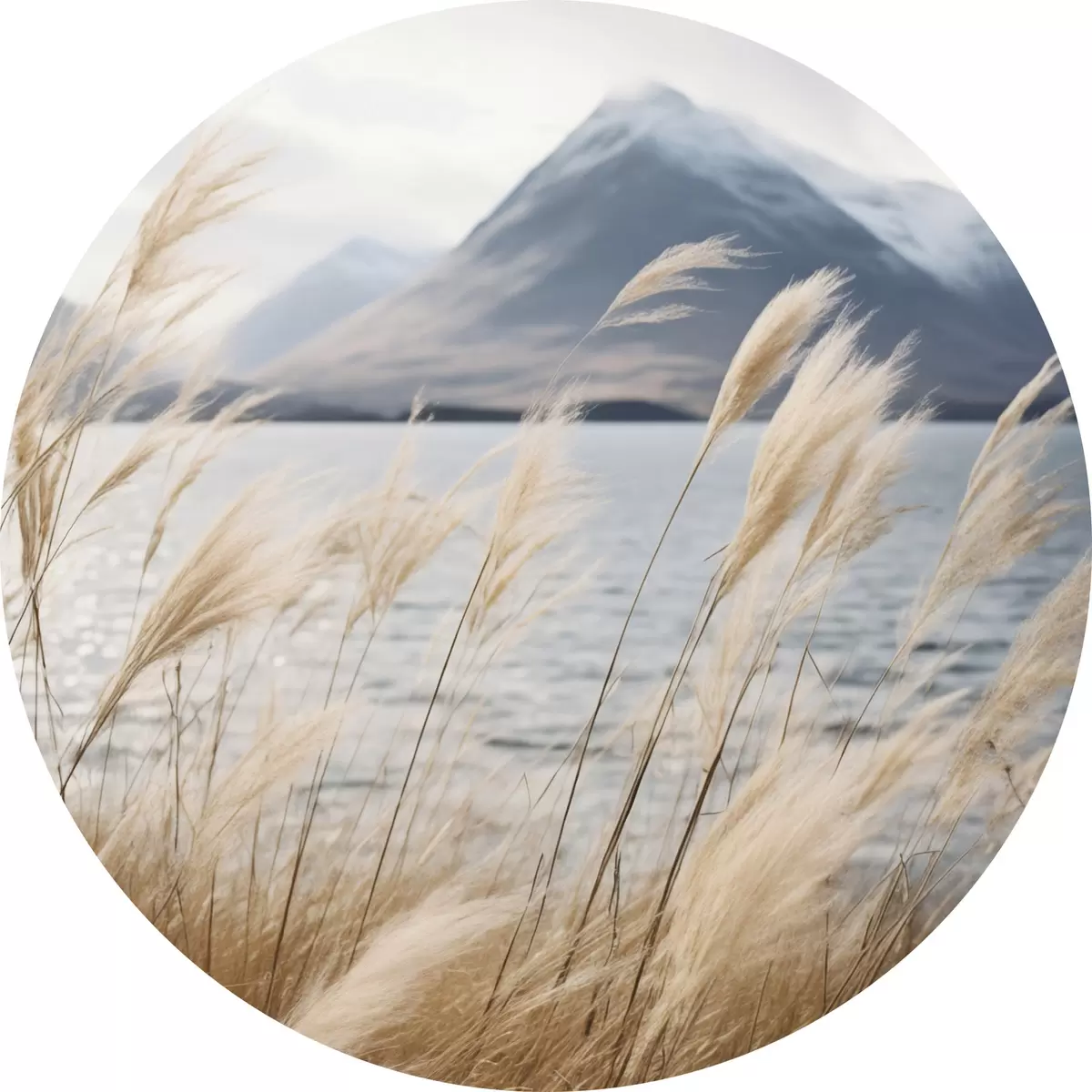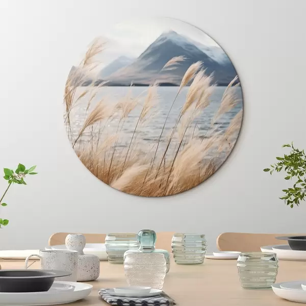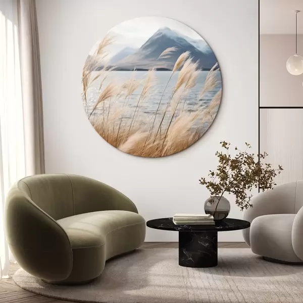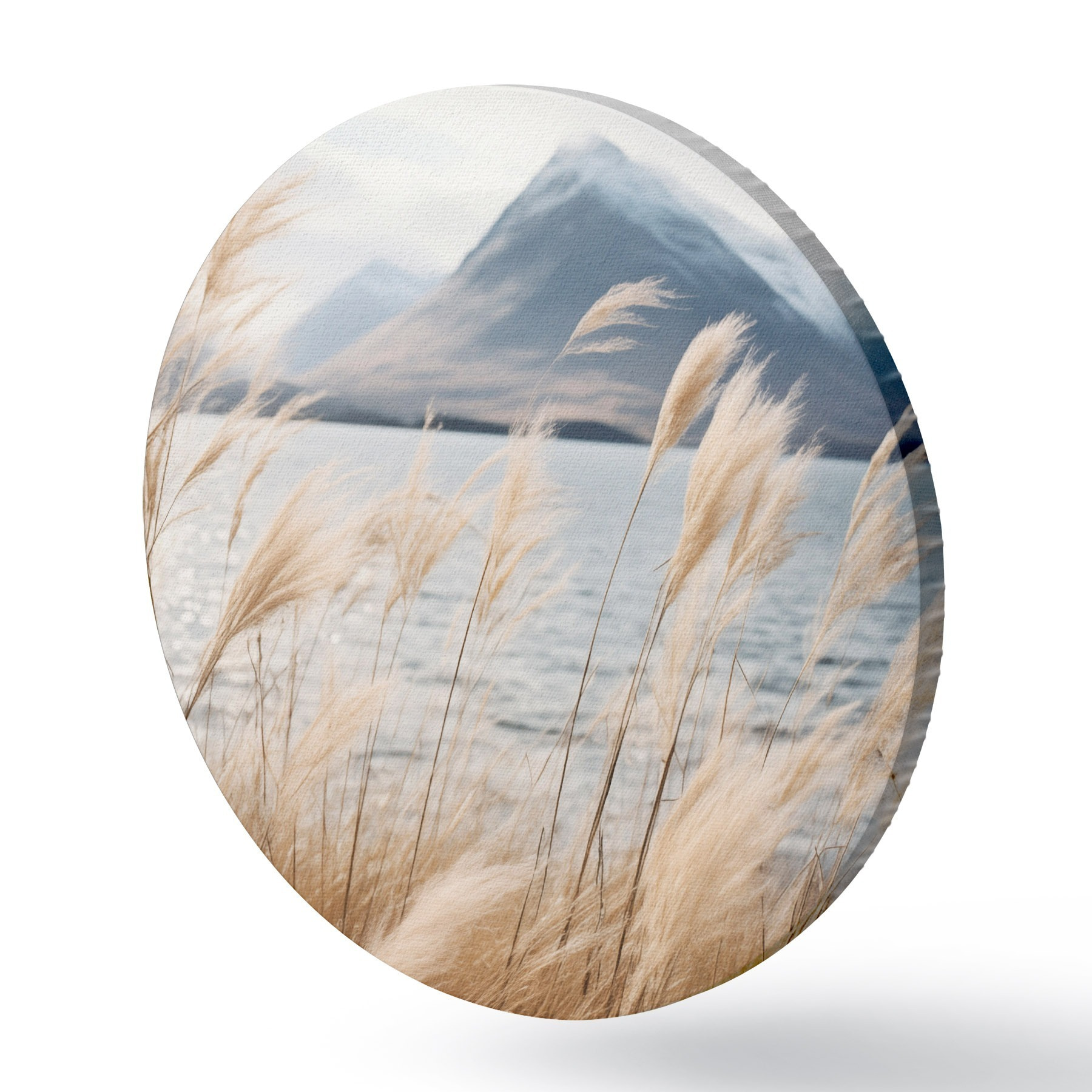 Ronde schilderijen Pampagras met een meer en bergen op de achtergrond, zachte belichting, gedempte kleuren, naturalistische stijl r46283