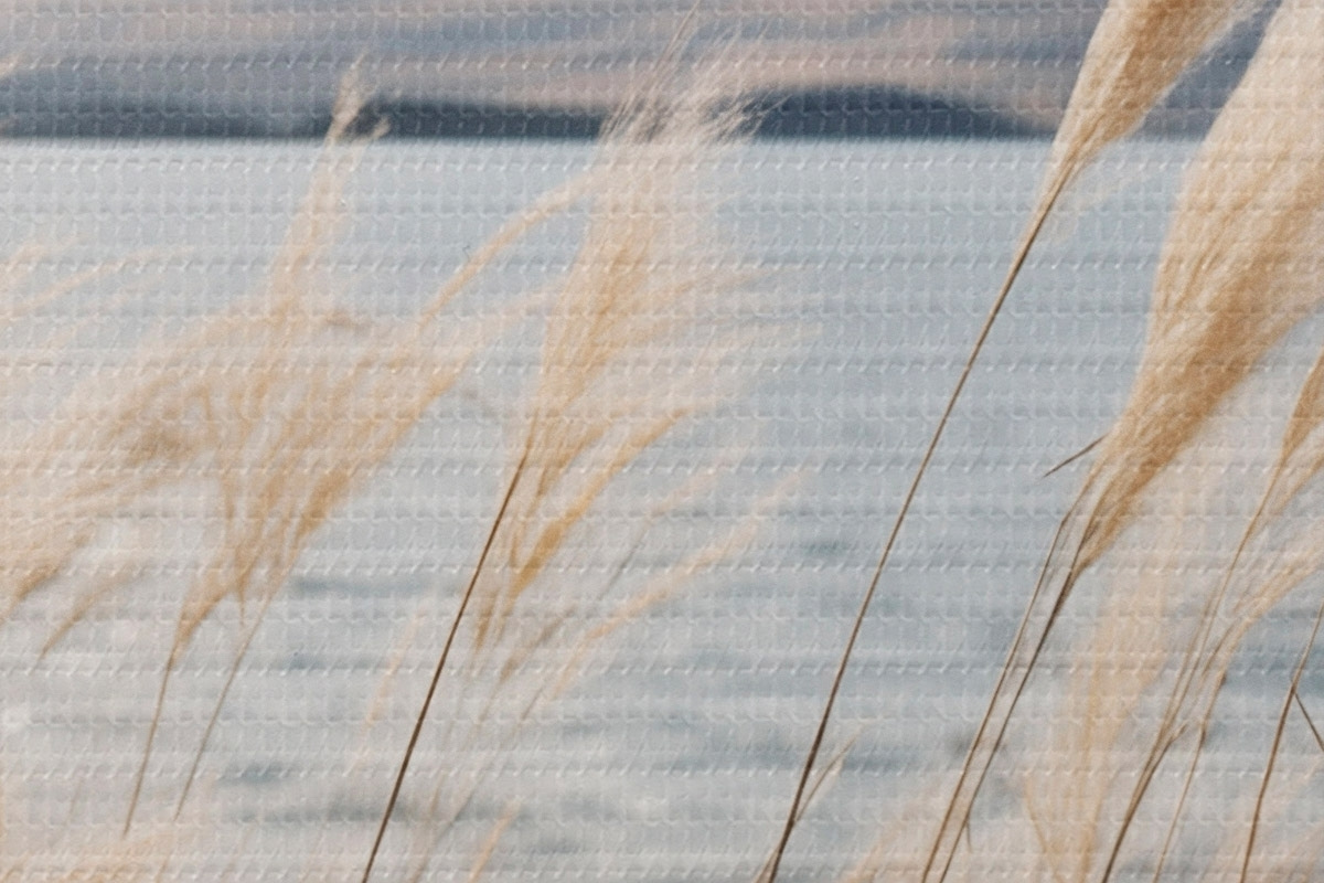 Ronde schilderijen Pampagras met een meer en bergen op de achtergrond, zachte belichting, gedempte kleuren, naturalistische stijl r46283