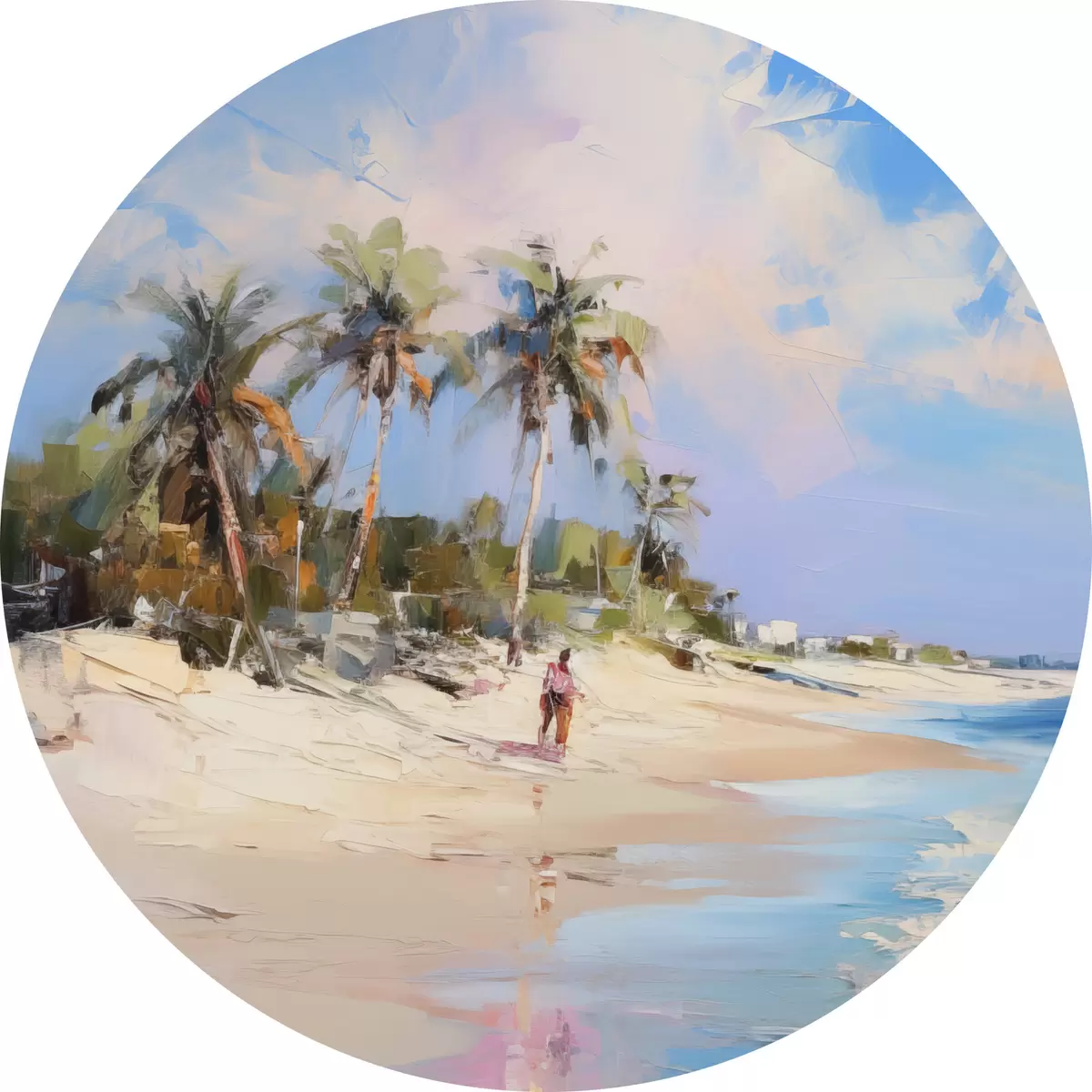 Ronde schilderijen Abstract landschap, een strand met palmbomen, heldere zonnige dag met een blauwe lucht en enkele wolken Nr r46284
