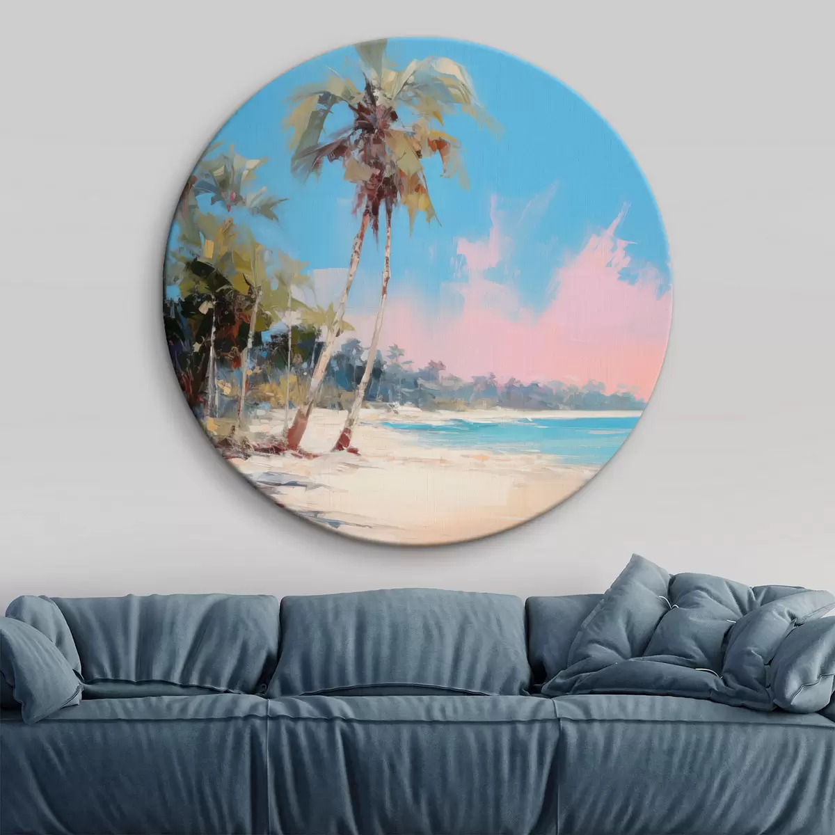 Ronde schilderijen Abstract tropisch strand met wit zand en palmbomen, blauwe lucht met witte wolken Nr r46285