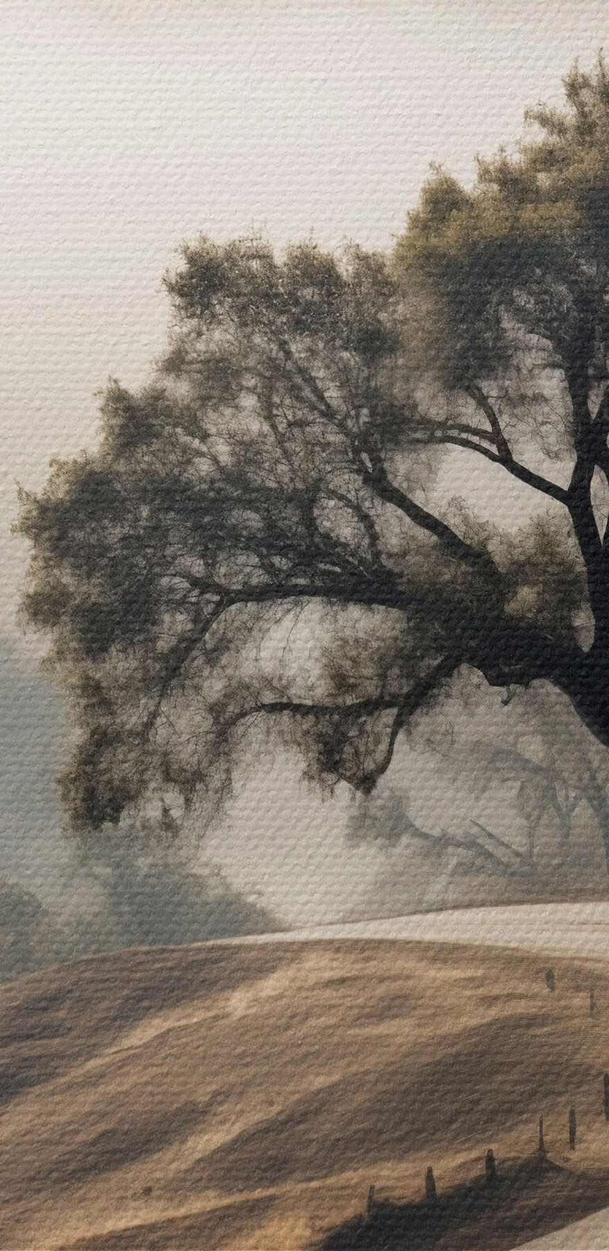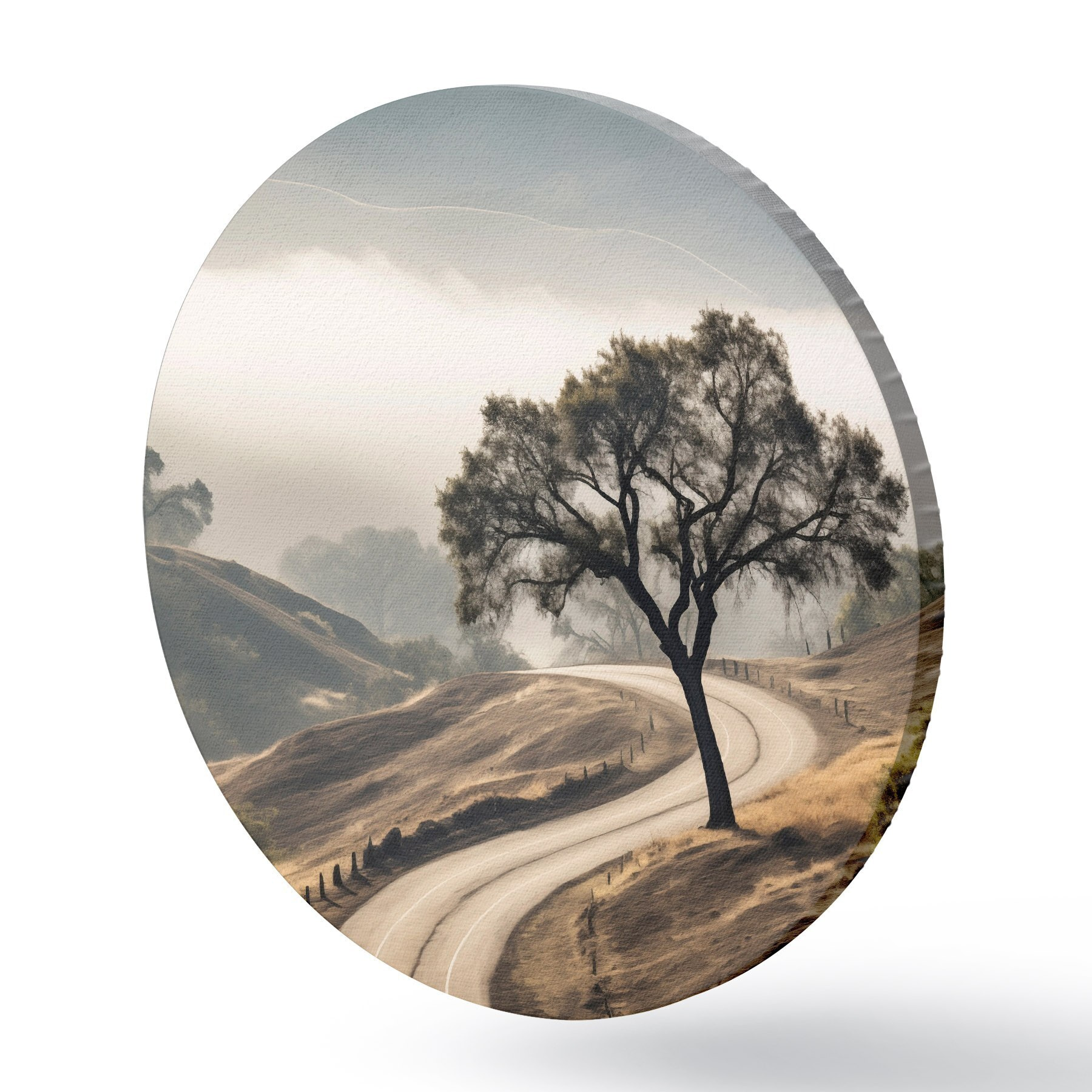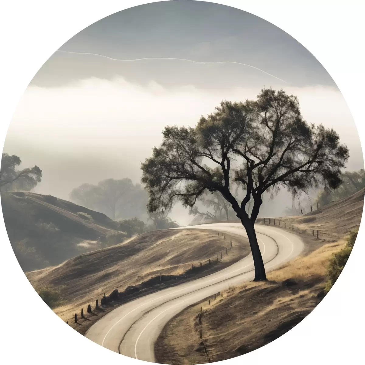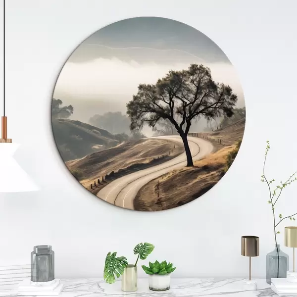 Ronde schilderijen Een kronkelende weg door glooiende heuvels met een boom op de voorgrond, de achtergrond met mist en bergen Nr r46288