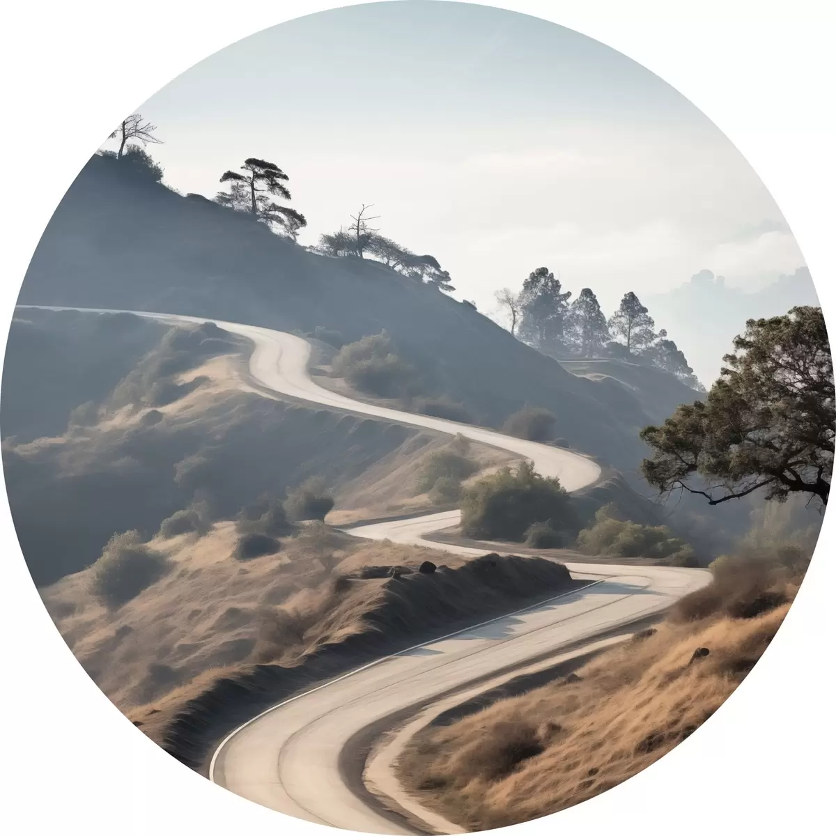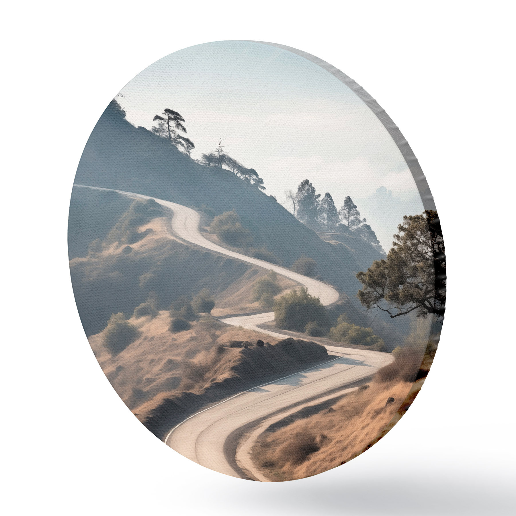 Ronde schilderijen Een kronkelende weg door een heuvelachtig landschap met droog gras onder een heldere hemel en bergen in de verte Nr r46289