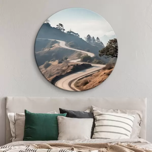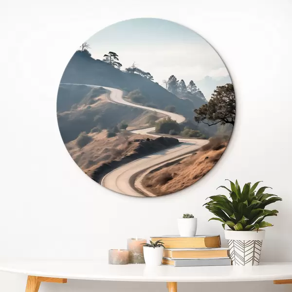 Ronde schilderijen Een kronkelende weg door een heuvelachtig landschap met droog gras onder een heldere hemel en bergen in de verte r46289