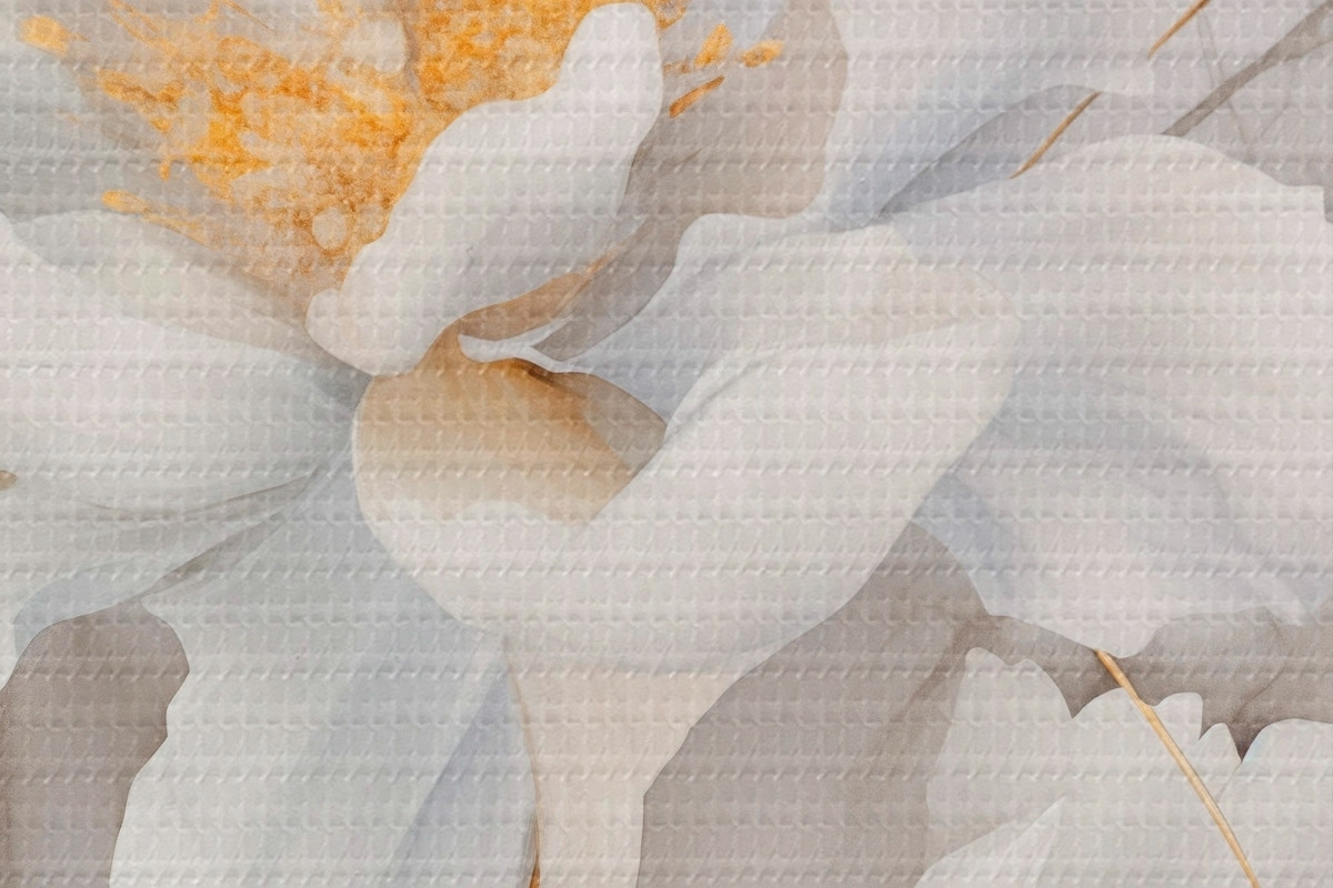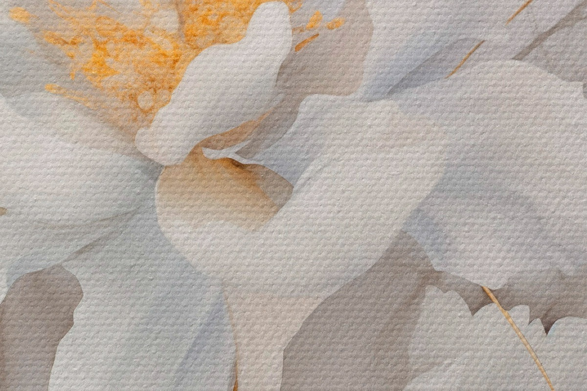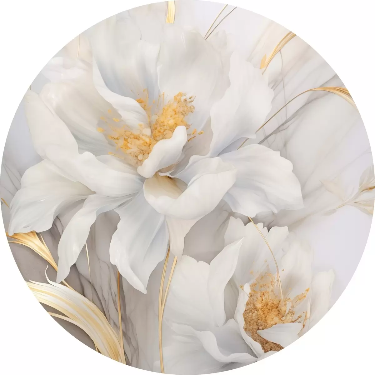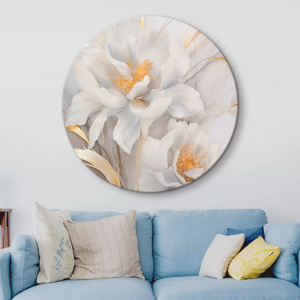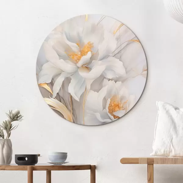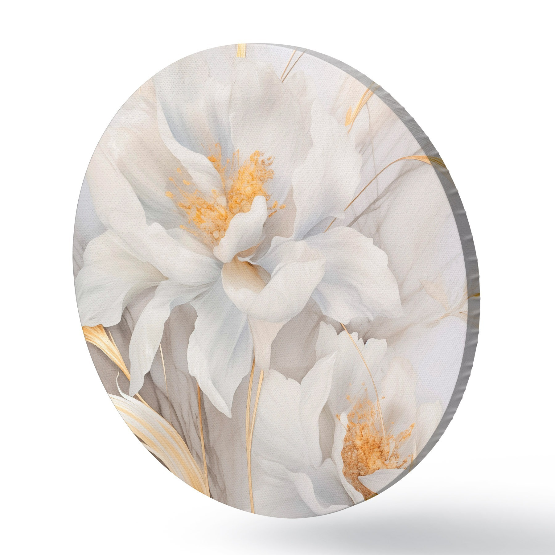 Ronde schilderijen Witte bloemen met gele stampers en stelen, delicate bloemblaadjes, elegante compositie, neutrale achtergrond Nr r46293