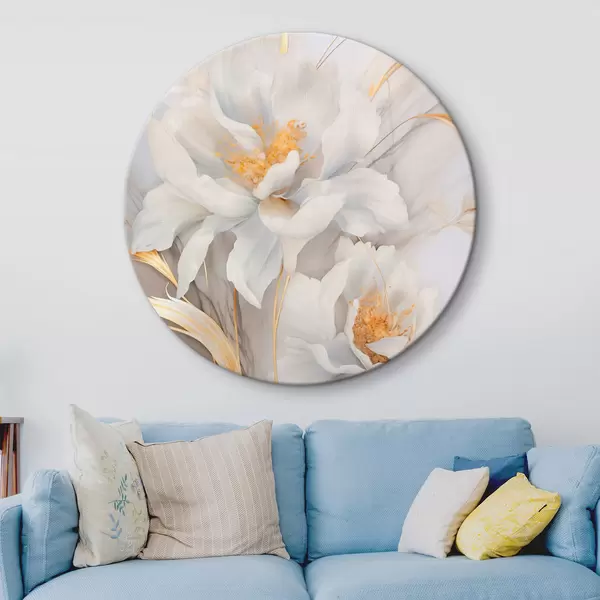 Ronde schilderijen Witte bloemen met gele stampers en stelen, delicate bloemblaadjes, elegante compositie, neutrale achtergrond r46293