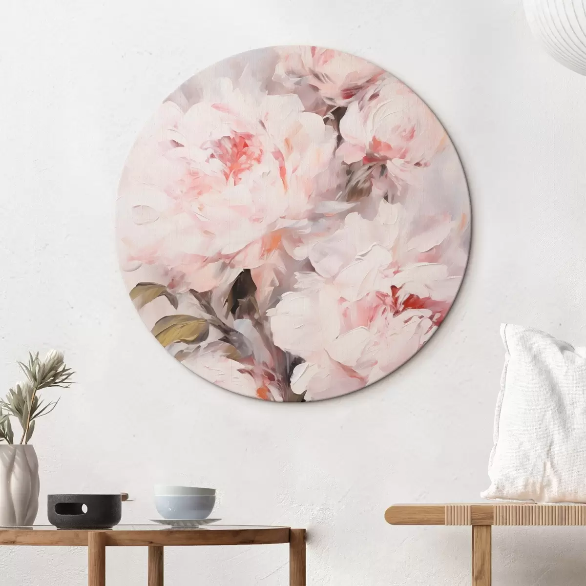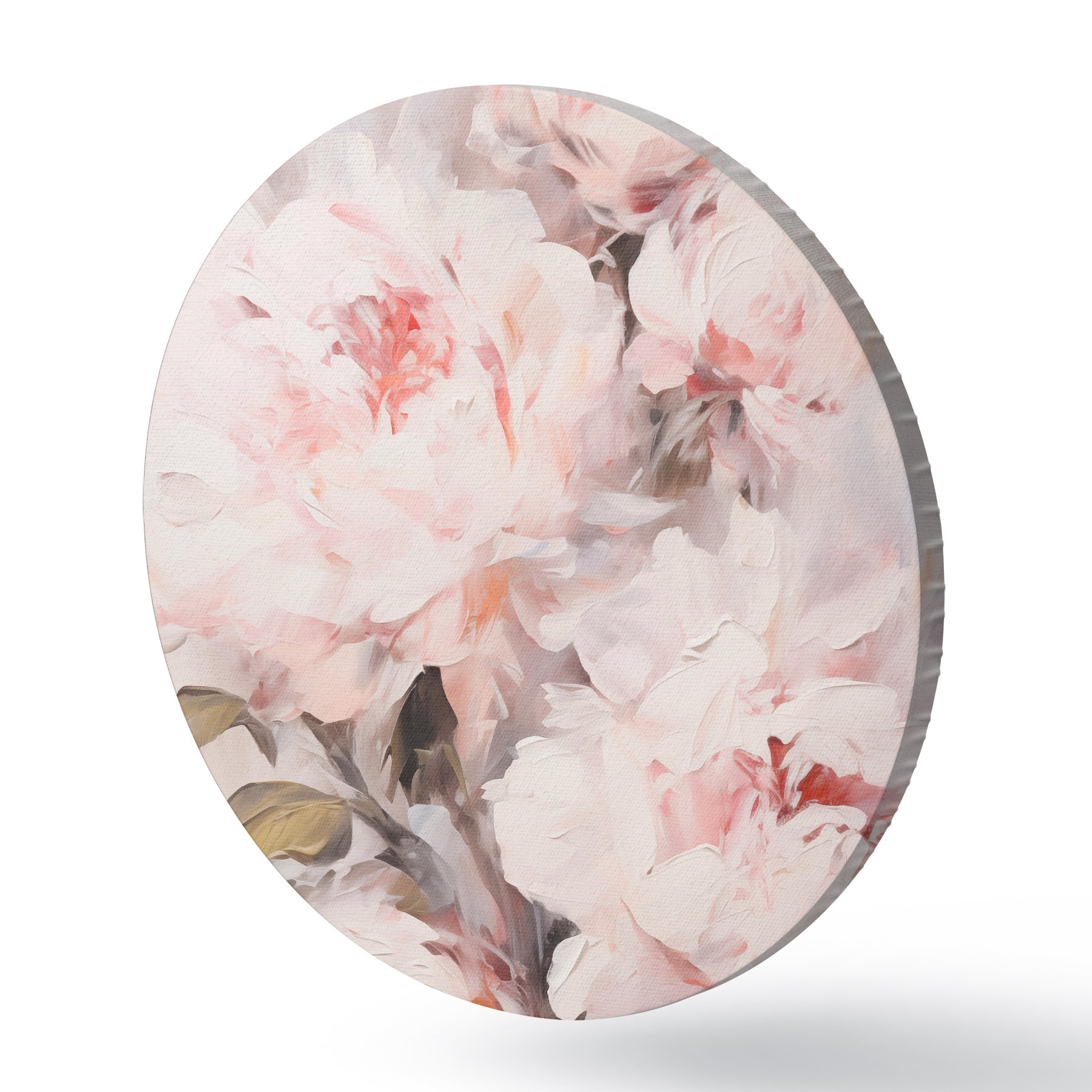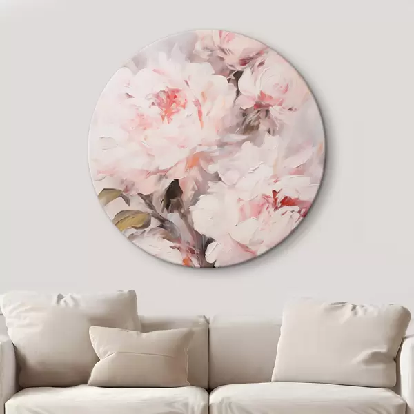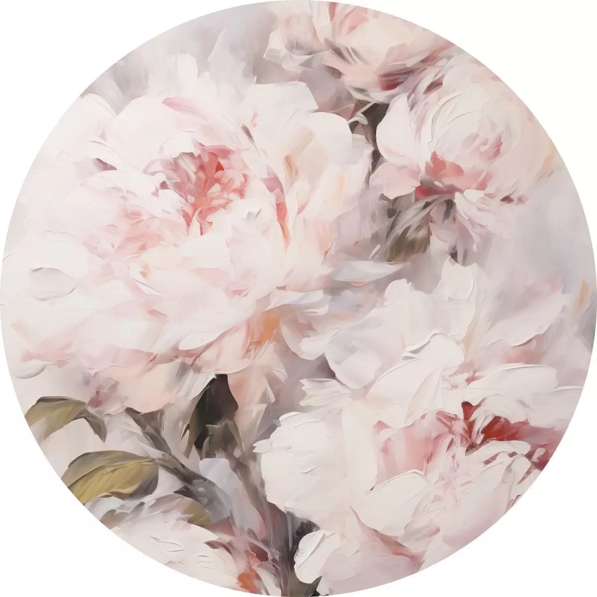 Ronde schilderijen Een boeket lichtroze pioenrozen met groene bladeren, zachte penseelstreken, pastelkleuren, op een lichte achtergrond Nr r46294