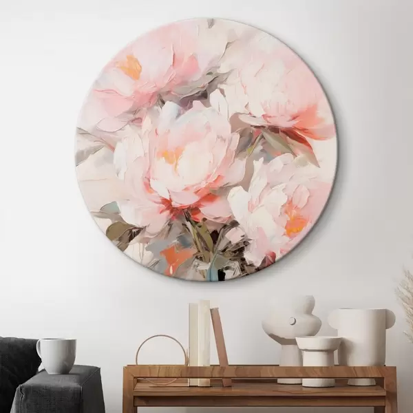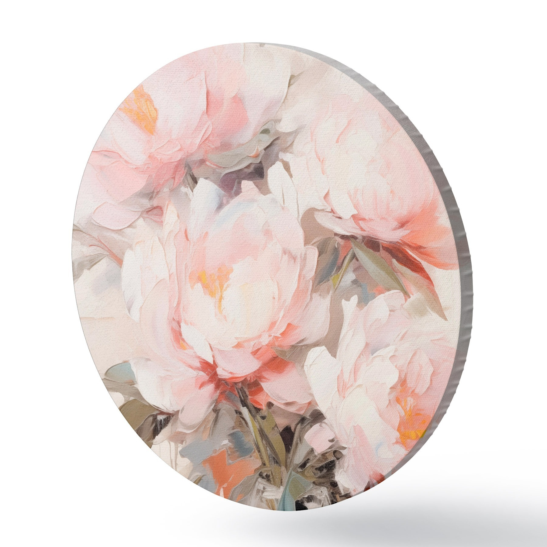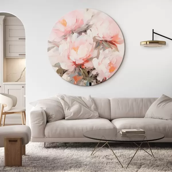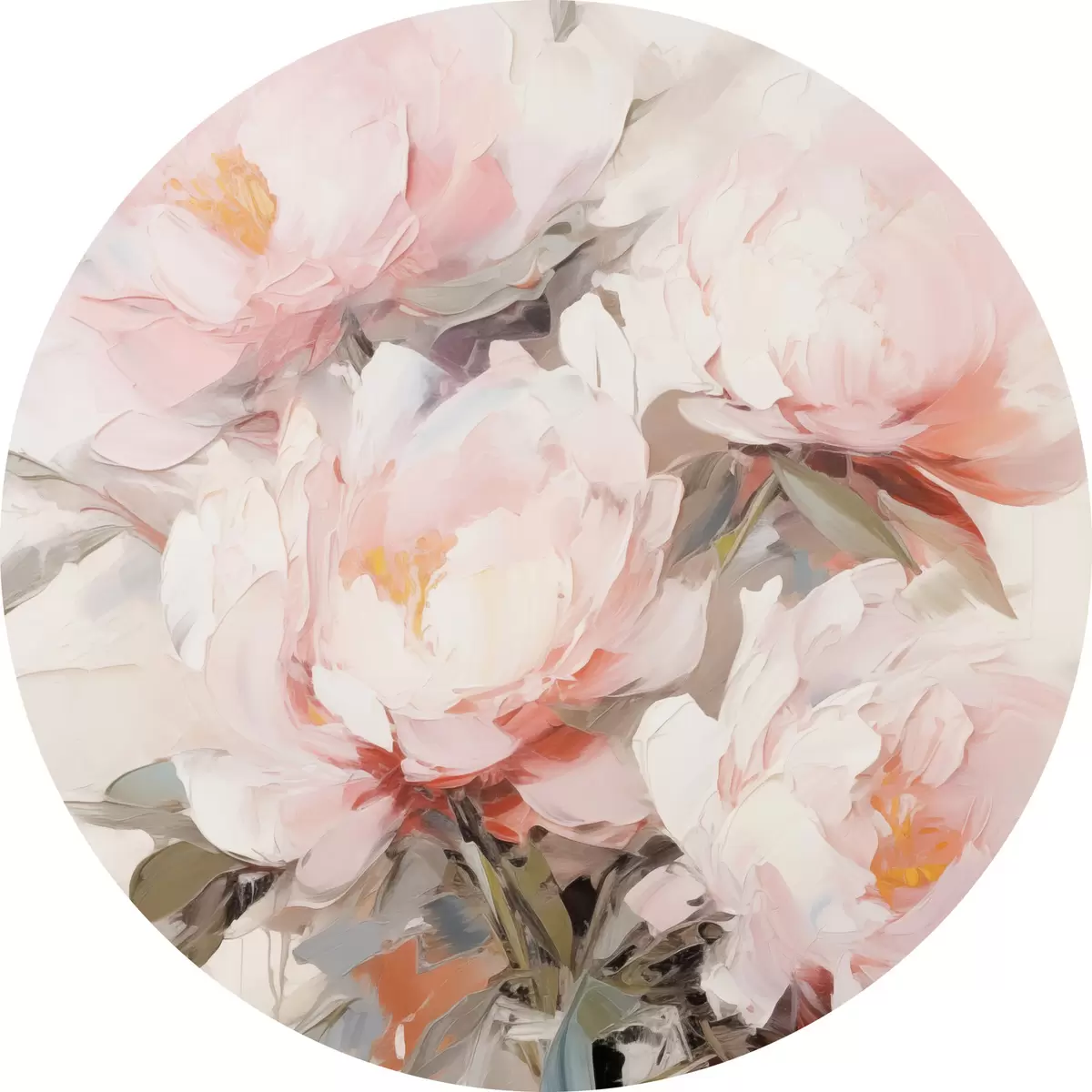 Ronde schilderijen Een boeket roze en witte pioenrozen in een glazen vaas, zachte penseelstreken, pastelkleuren, neutrale achtergrond Nr r46295