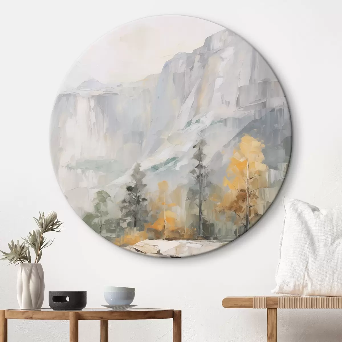 Ronde schilderijen Landschap van een bos voor de bergen, imitatie van een schilderij Nr r46299
