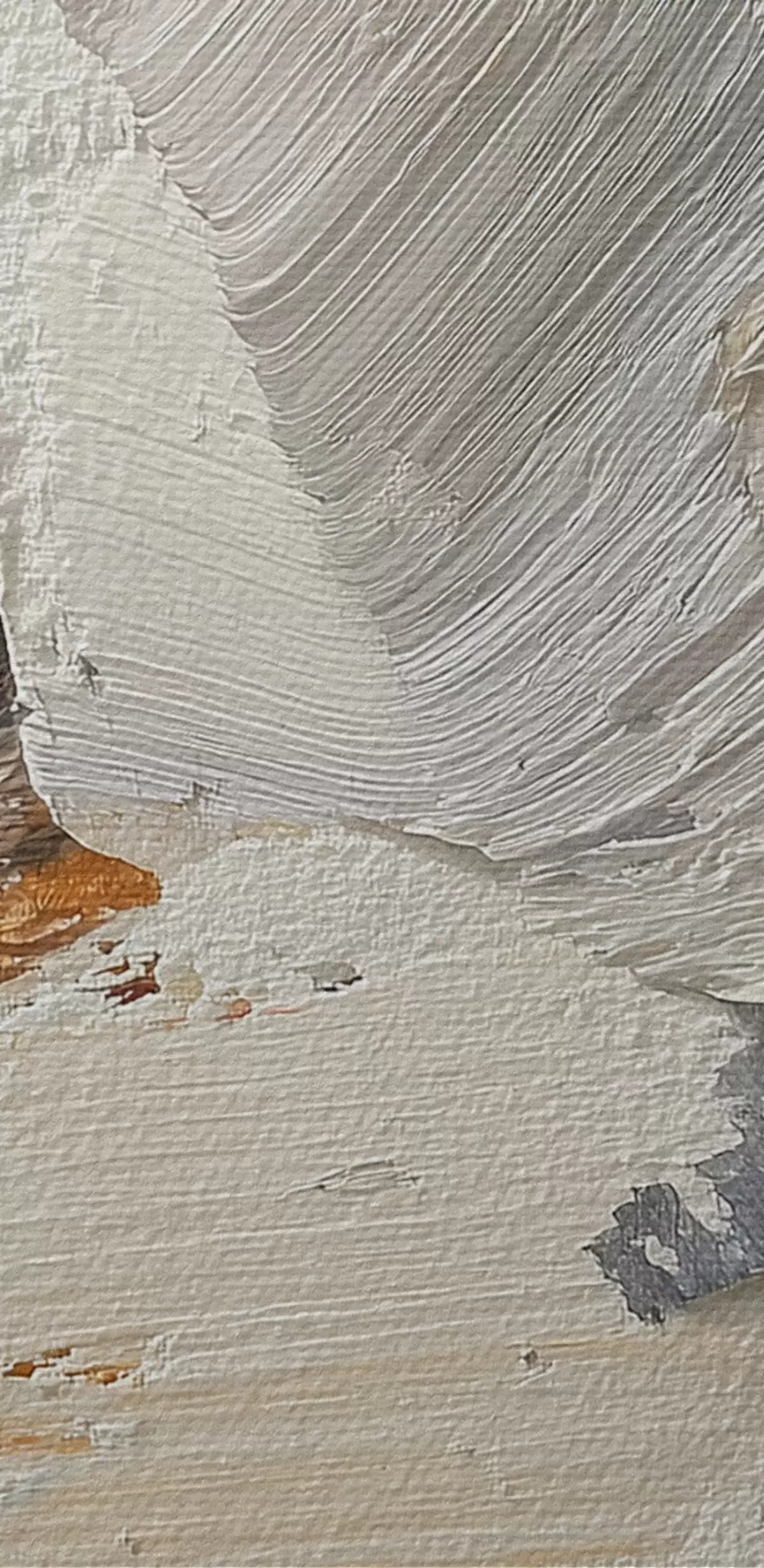 Het schilderij kan voorzichtig worden schoongeveegd met een droge zachte doek of spons; het wordt niet aanbevolen om natte producten te gebruiken. Het gebruik van een vochtige spons is alleen toegestaan als het schilderij gevernist is.