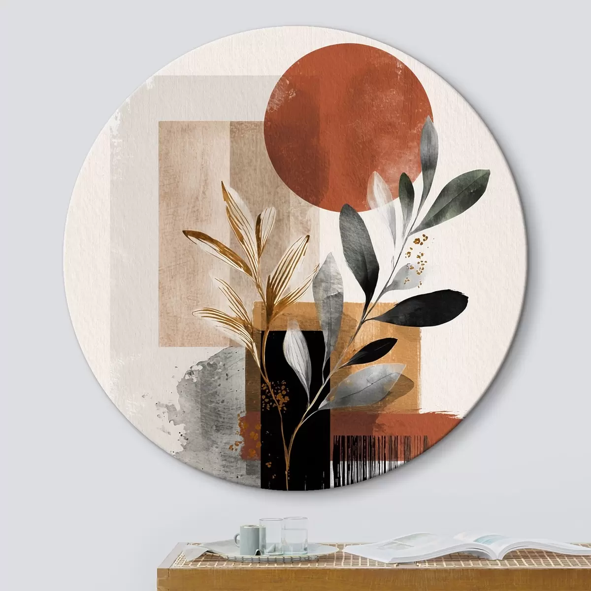 Ronde schilderijen Geometrie en bladeren abstractie r46388