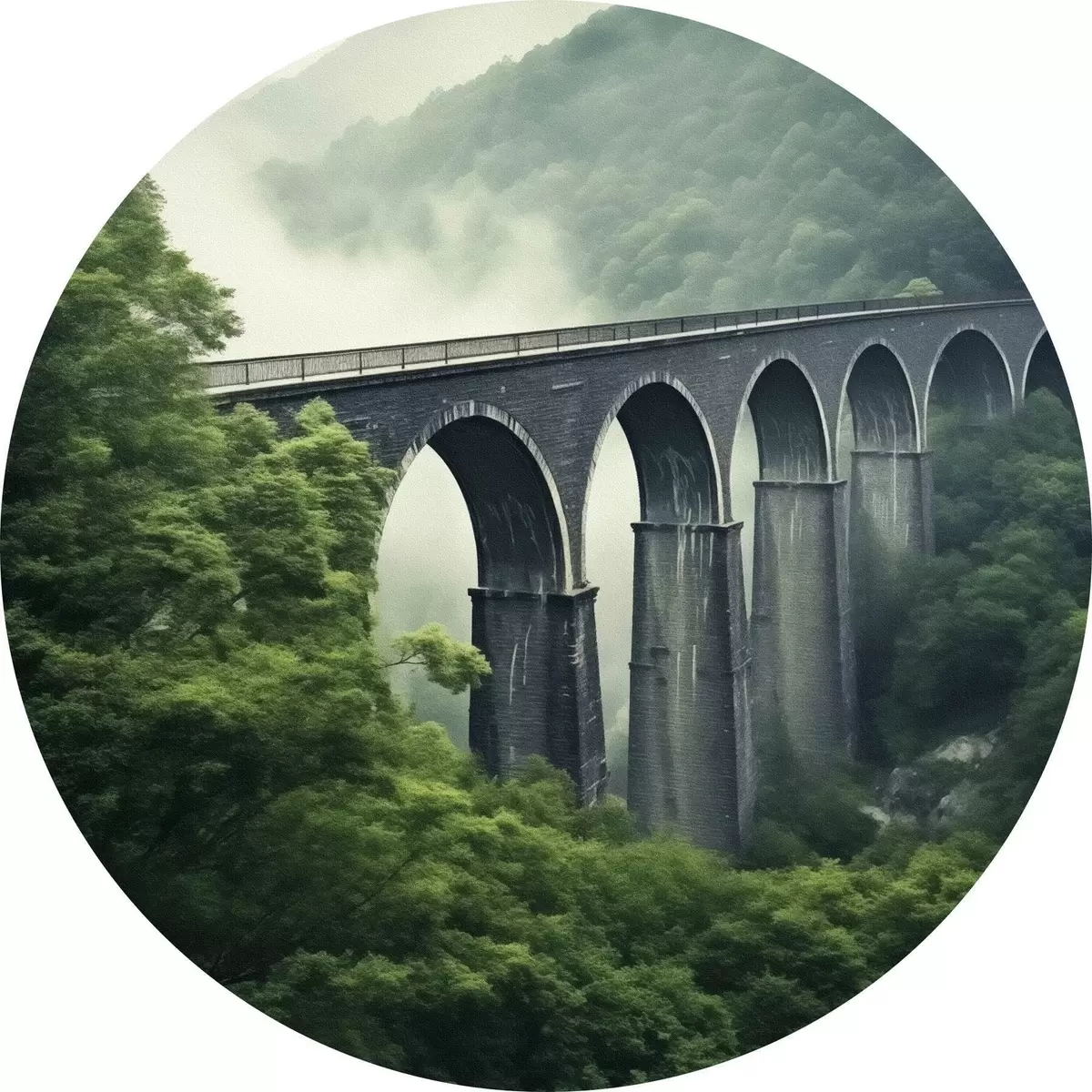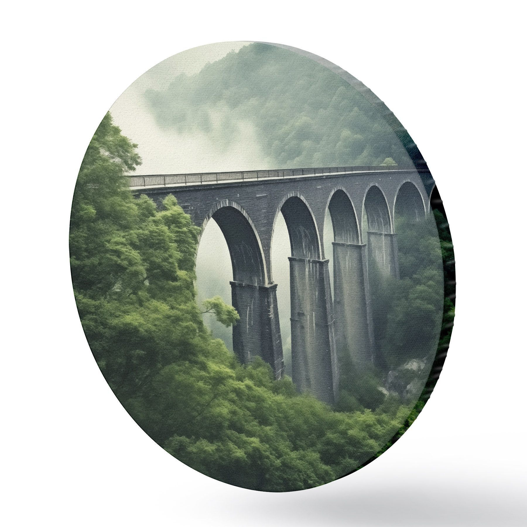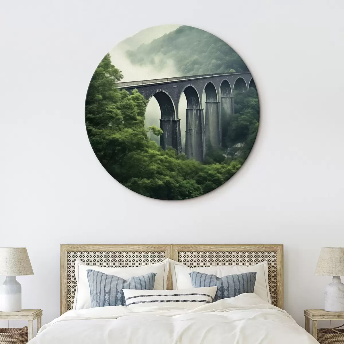 Ronde schilderijen Stenen viaduct boven mistige beboste vallei Nr r46483