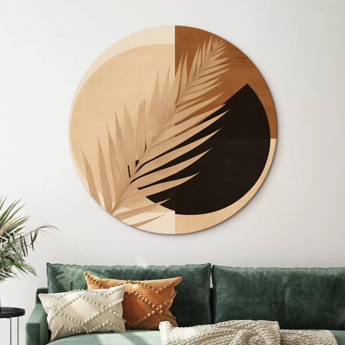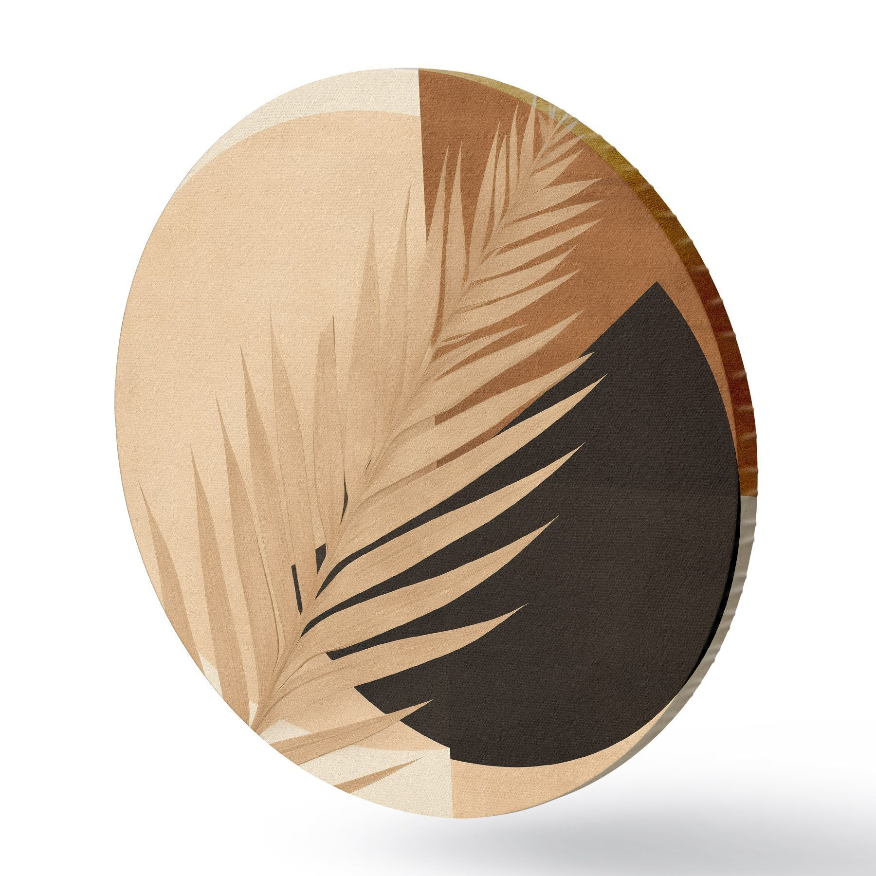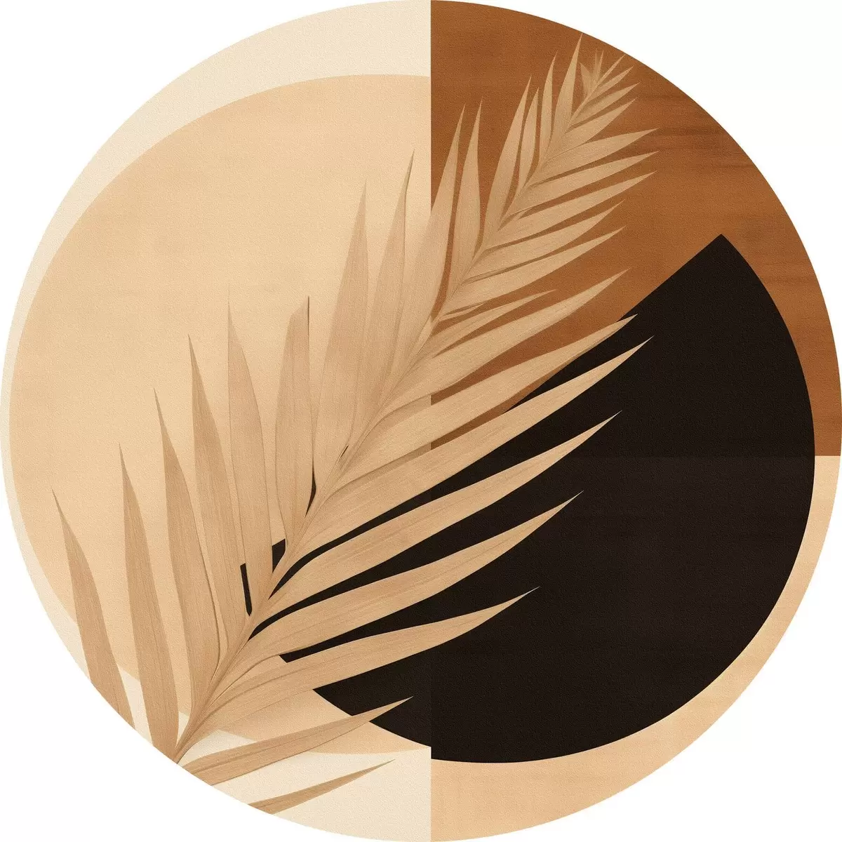 Ronde schilderijen Palmblad boven terracotta en crèmekleurige geometrie Nr r46490