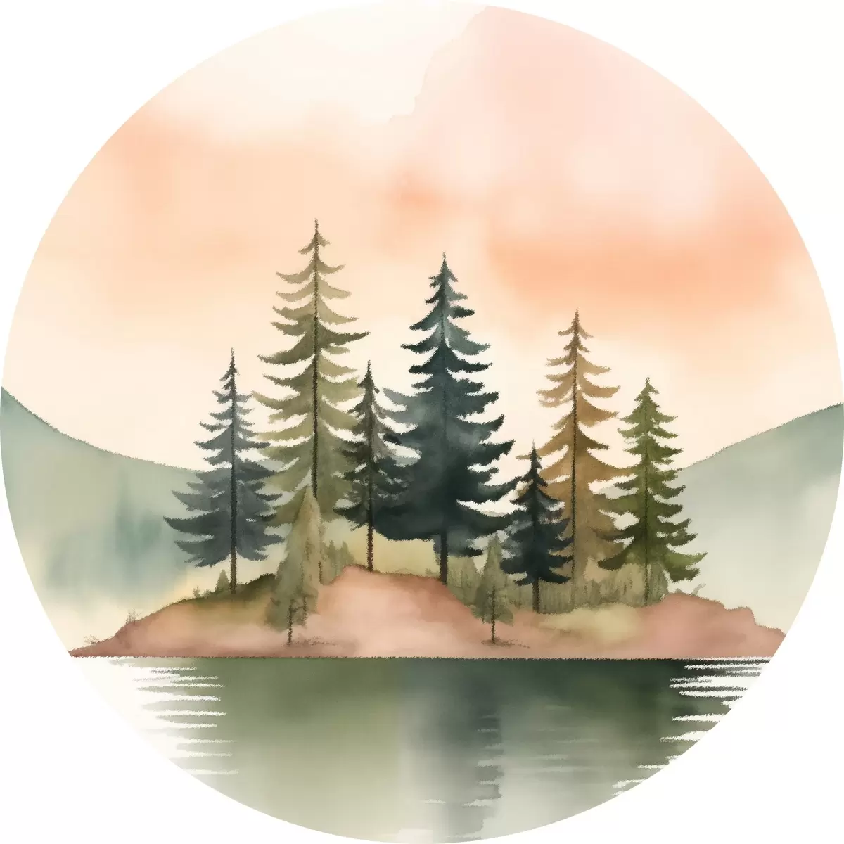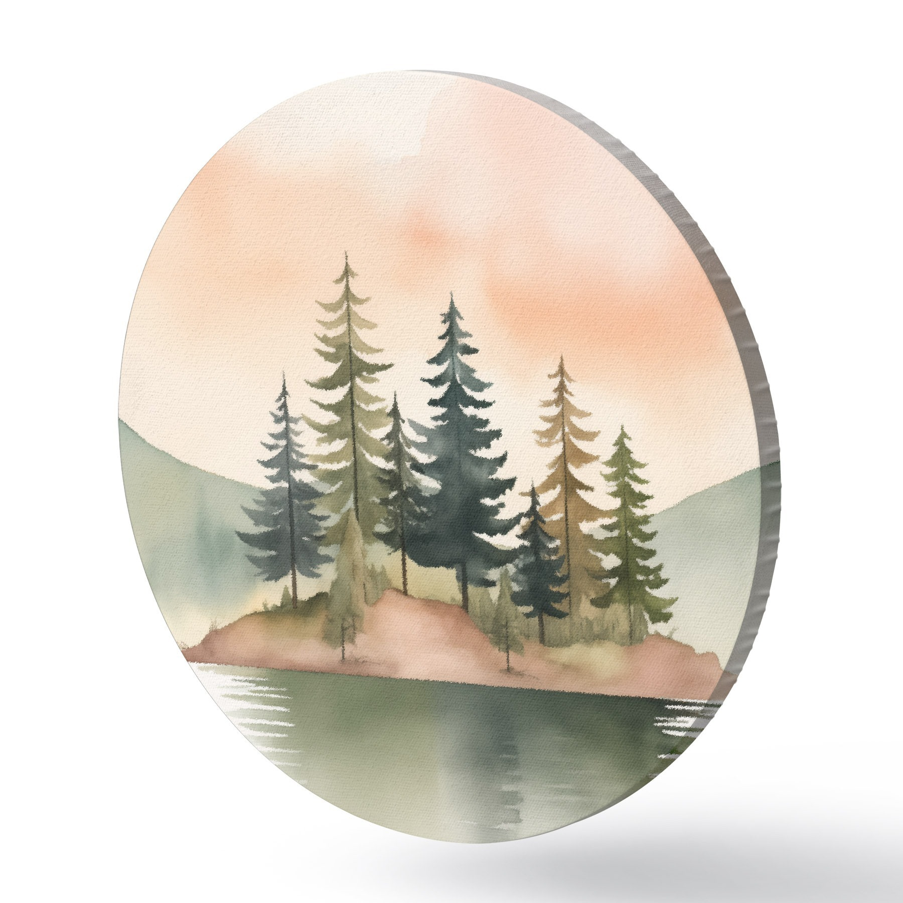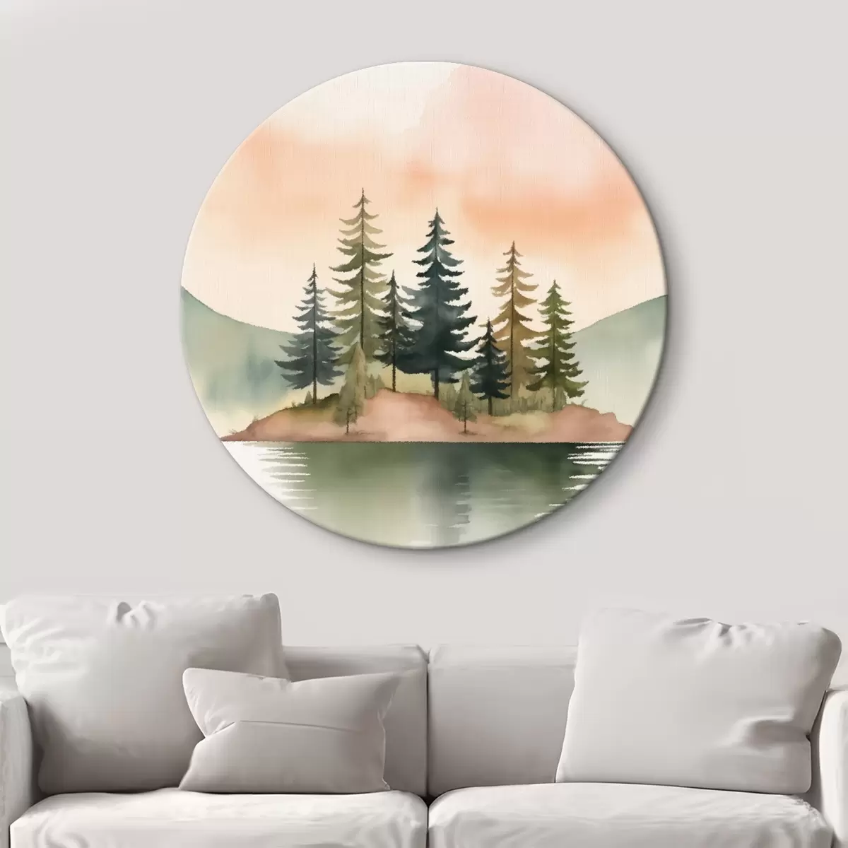 Ronde schilderijen Aquarel dennen op een mistig eilandje, zachte perzikkleurige lucht Nr r46505