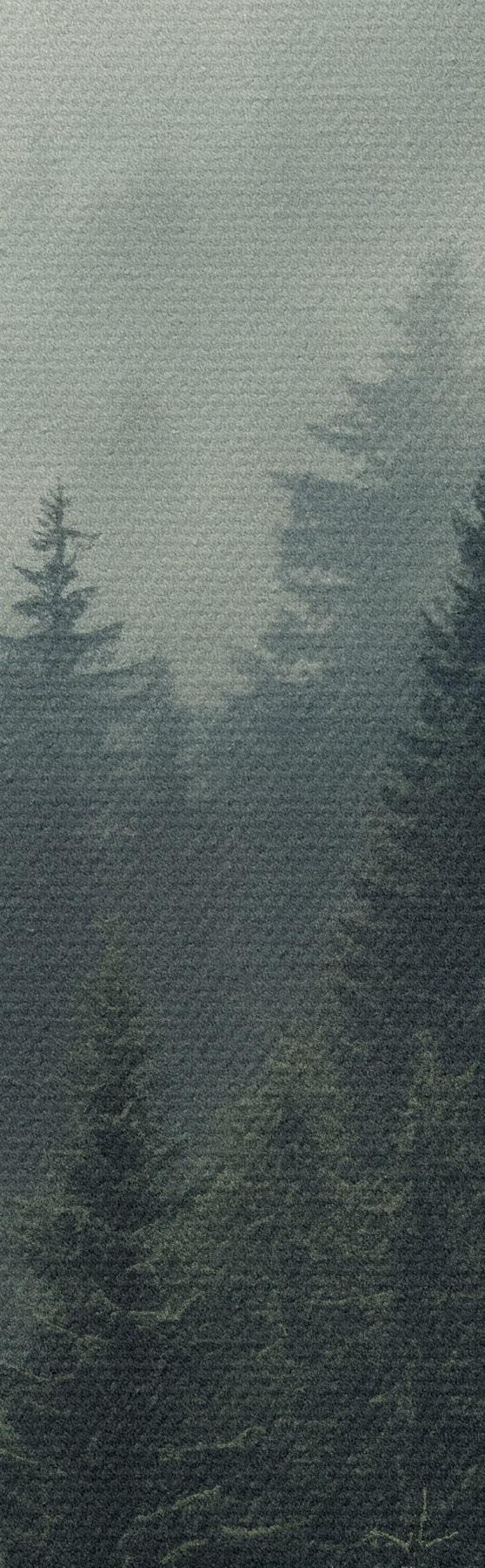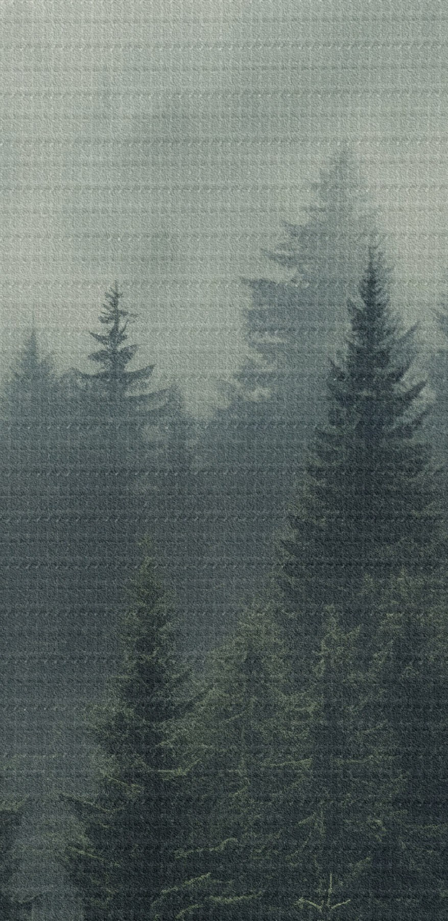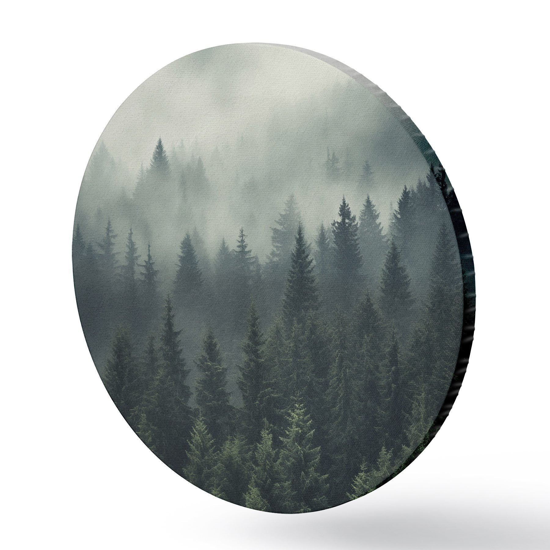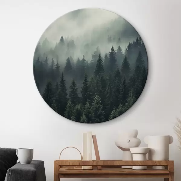 Ronde schilderijen Mist die over een dichtbegroeid groenblijvend bos trekt Nr r46512