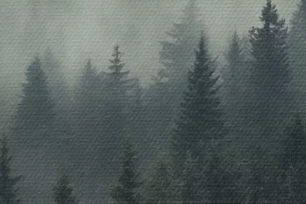 Ronde schilderijen Mist die over een dichtbegroeid groenblijvend bos trekt Nr r46512