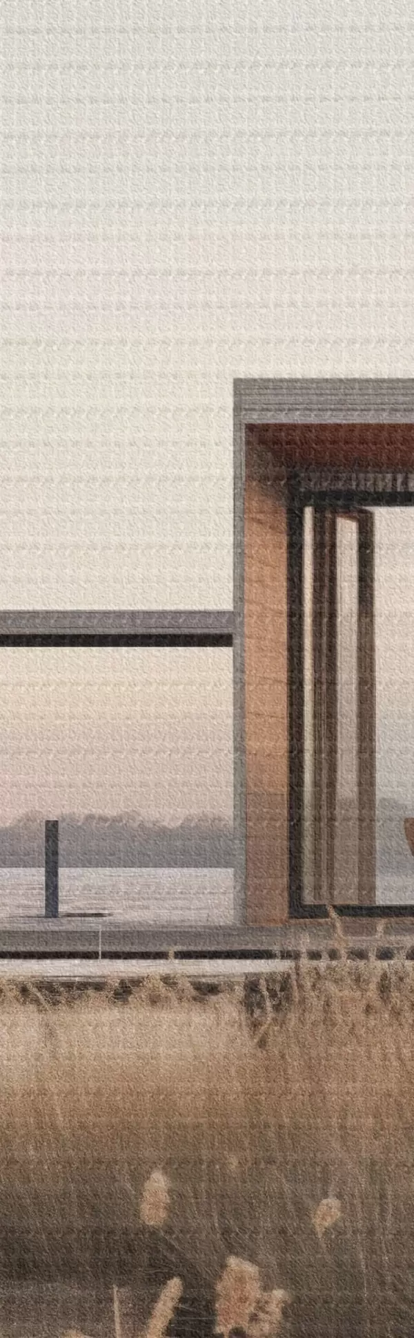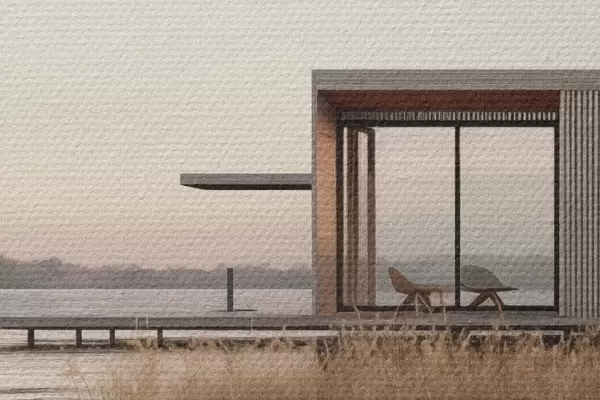 Ronde schilderijen Moderne hut aan het meer tussen het riet in de zachte schemering Nr r46513