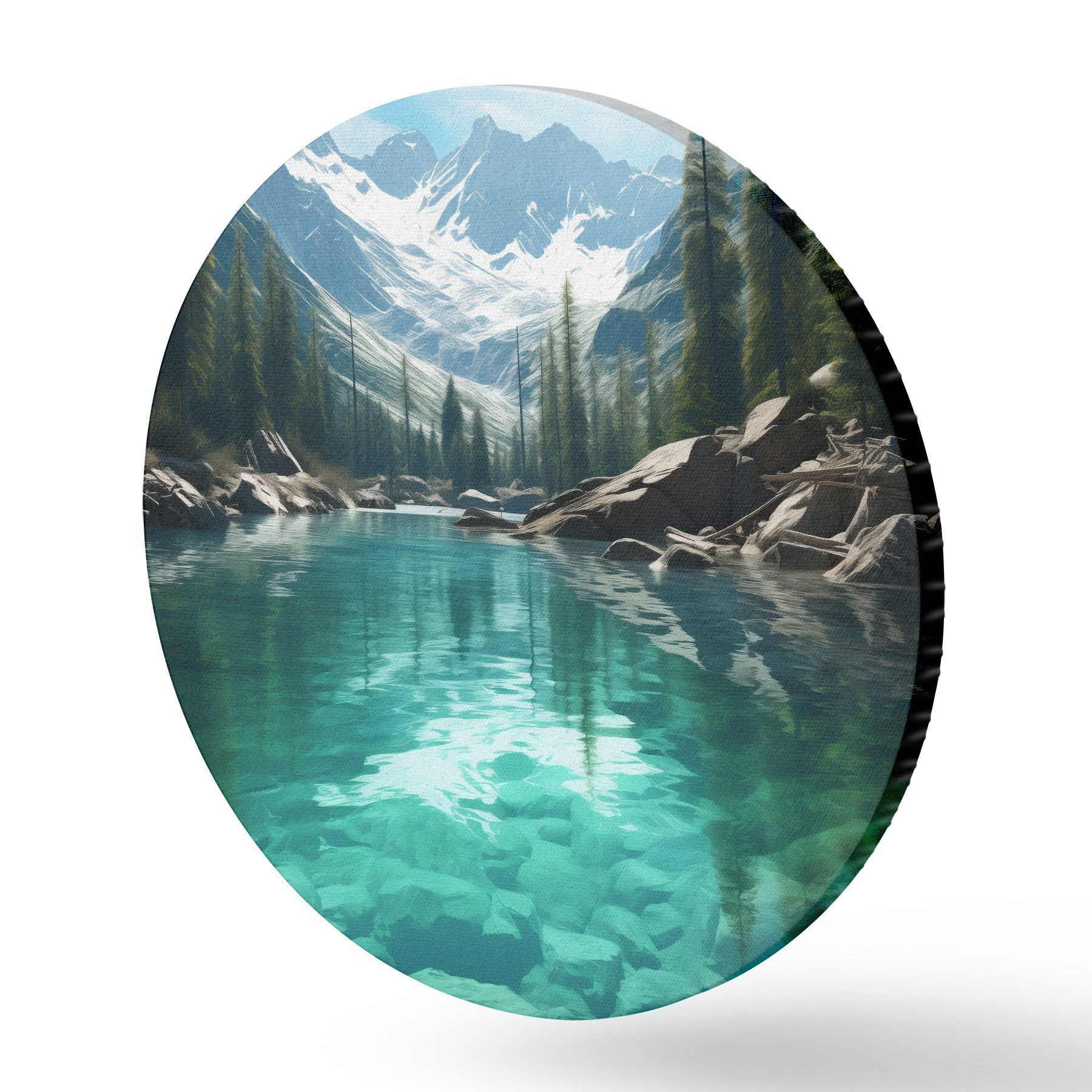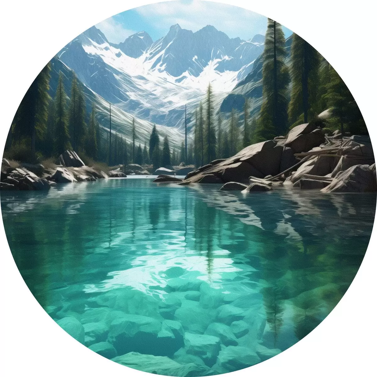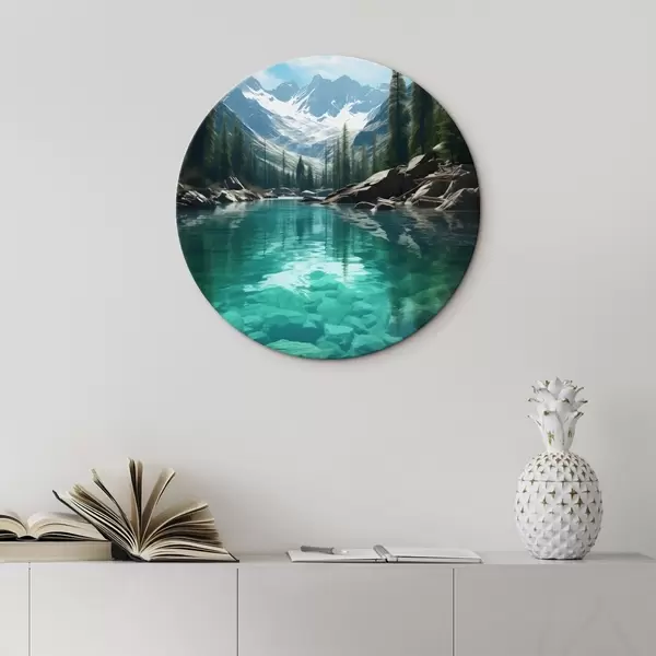 Ronde schilderijen Heldere bergbeek met rotsachtige bodem en besneeuwde bergtoppen Nr r46514