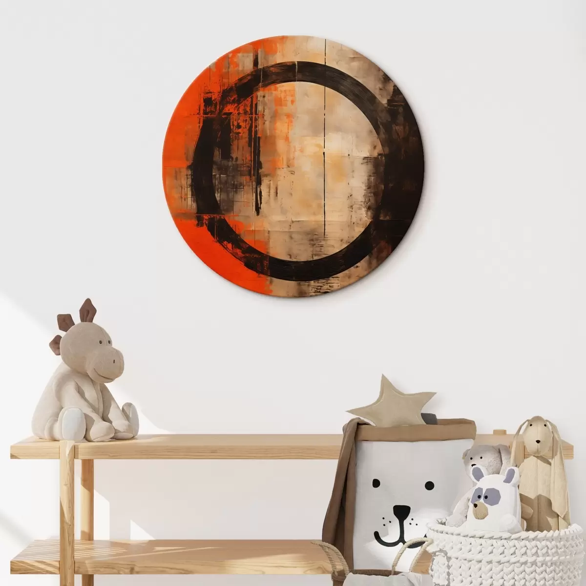 Ronde schilderijen Abstract met een grote zwarte cirkel en warme texturen r46528