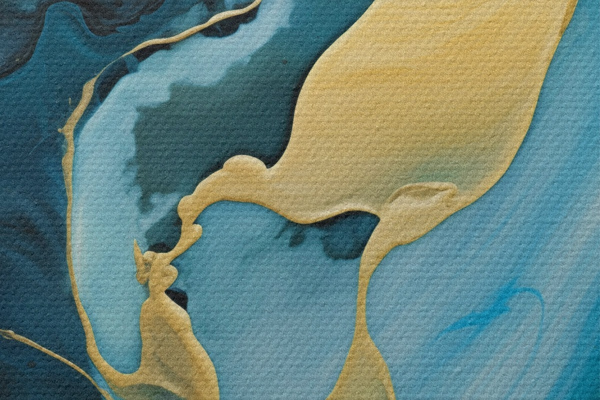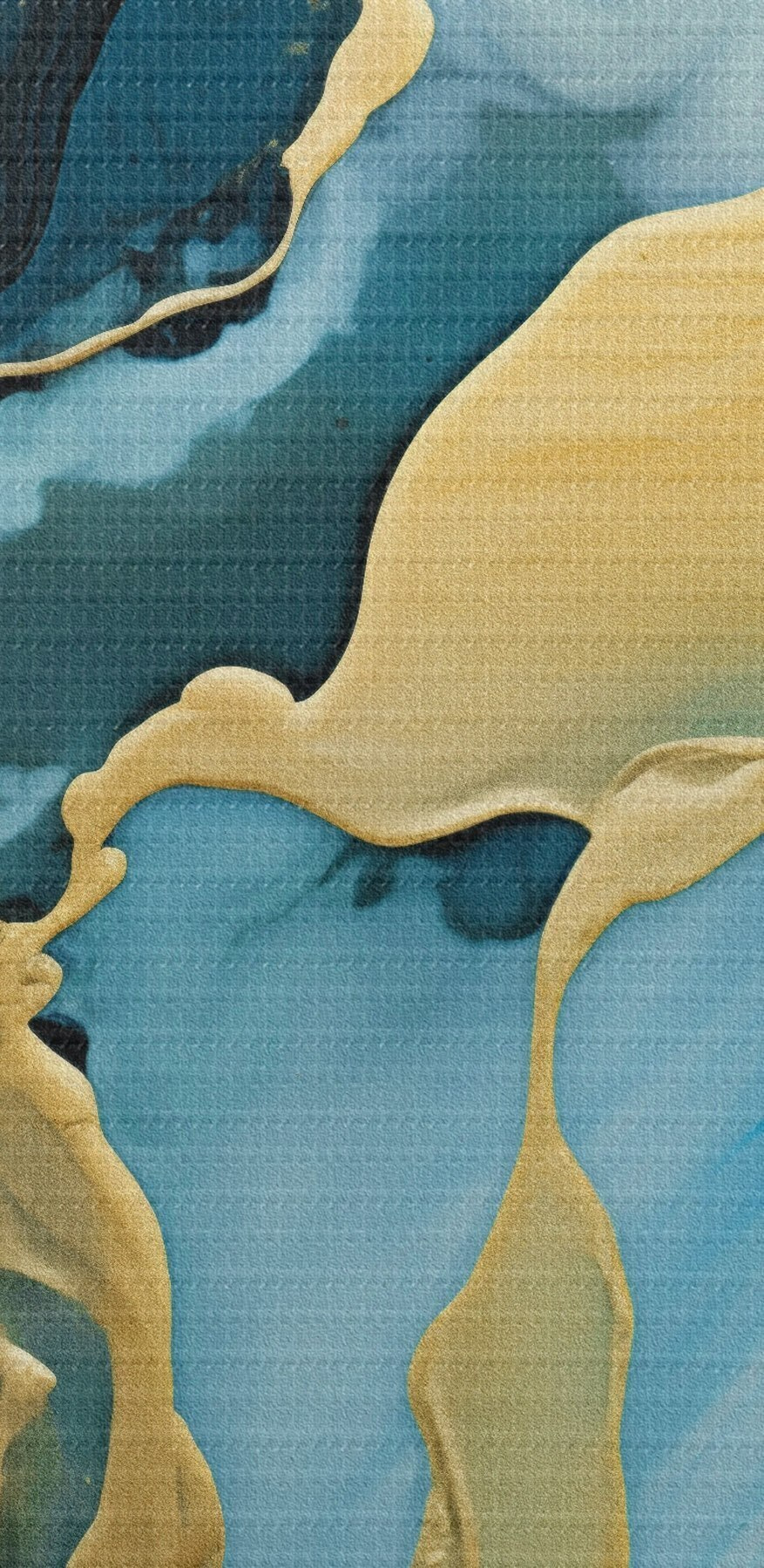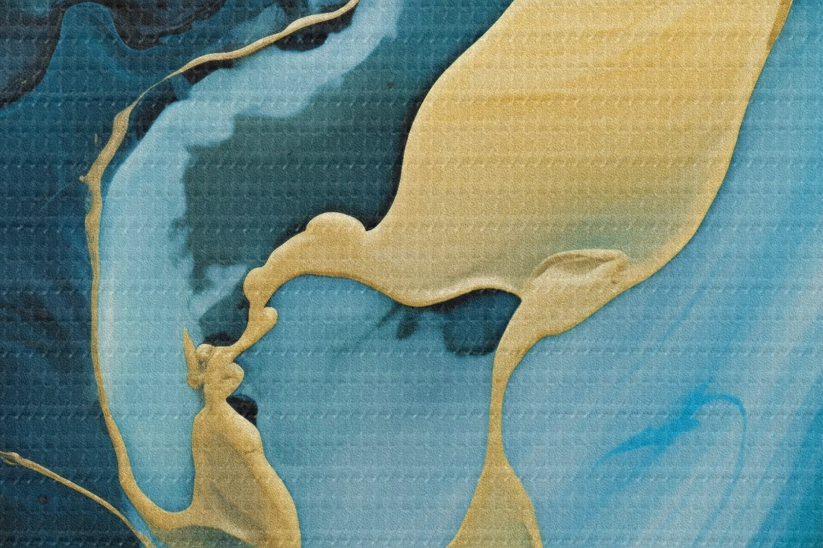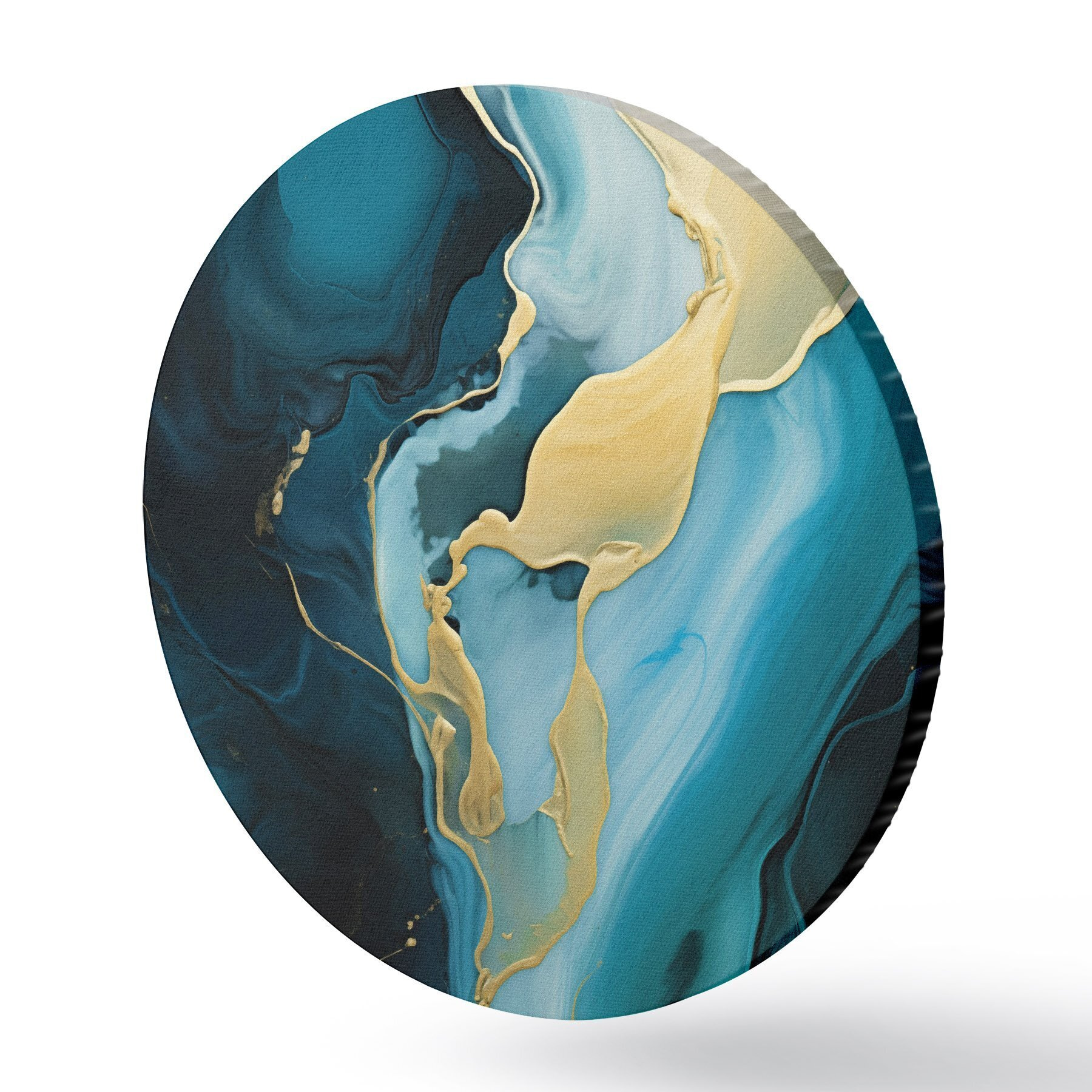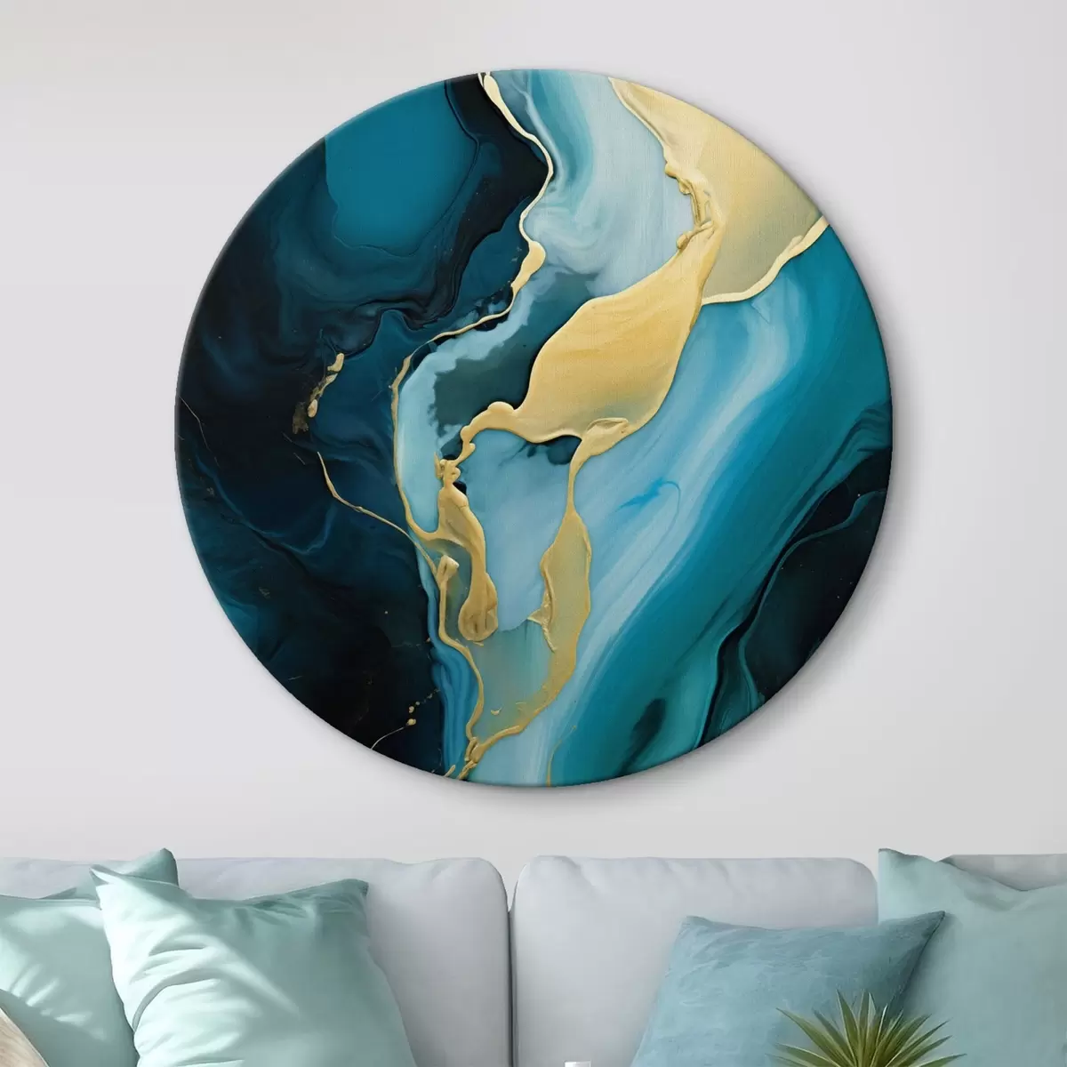 Ronde schilderijen Tealblauw abstract met een stroom oker r46530
