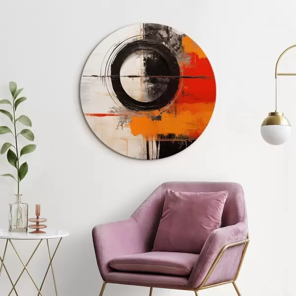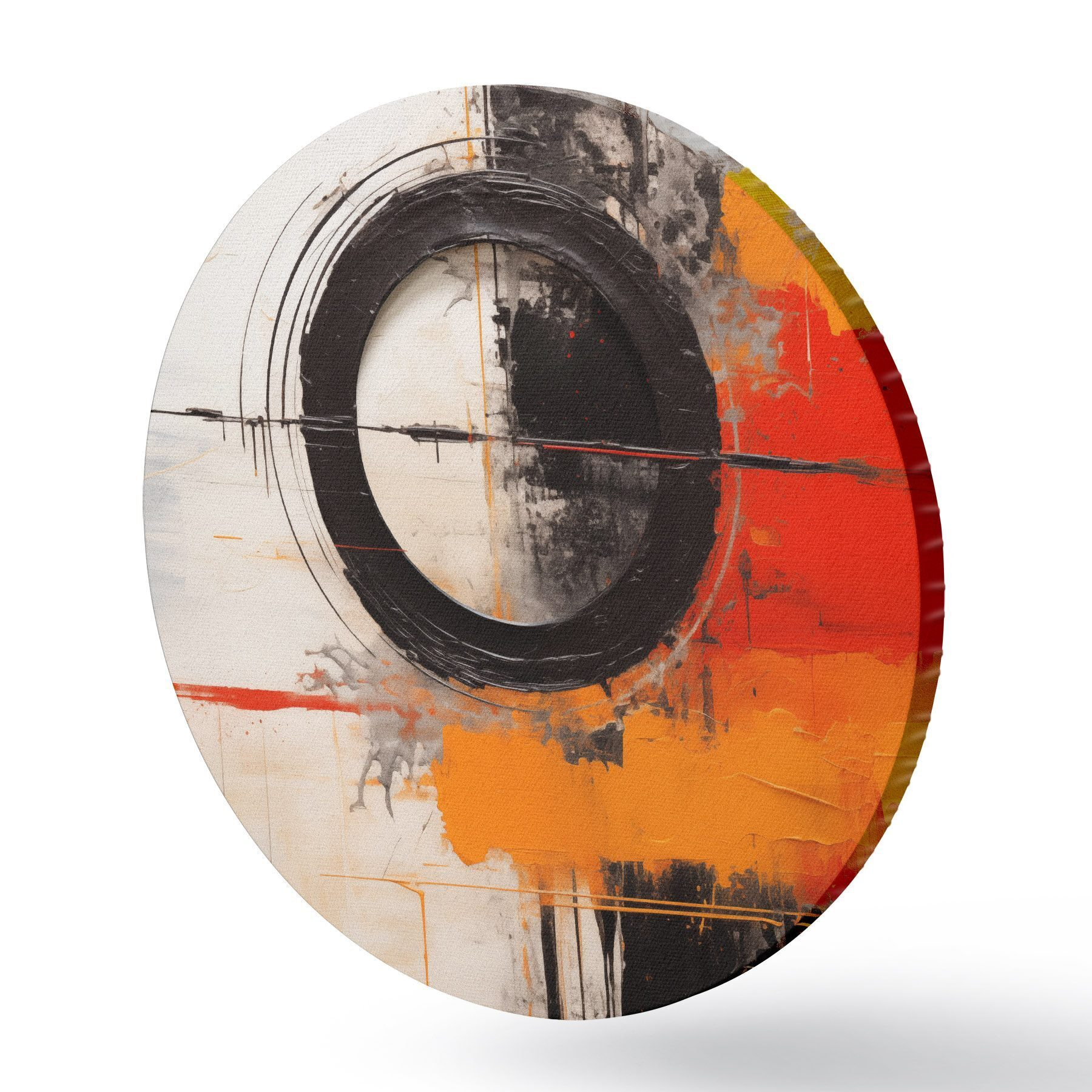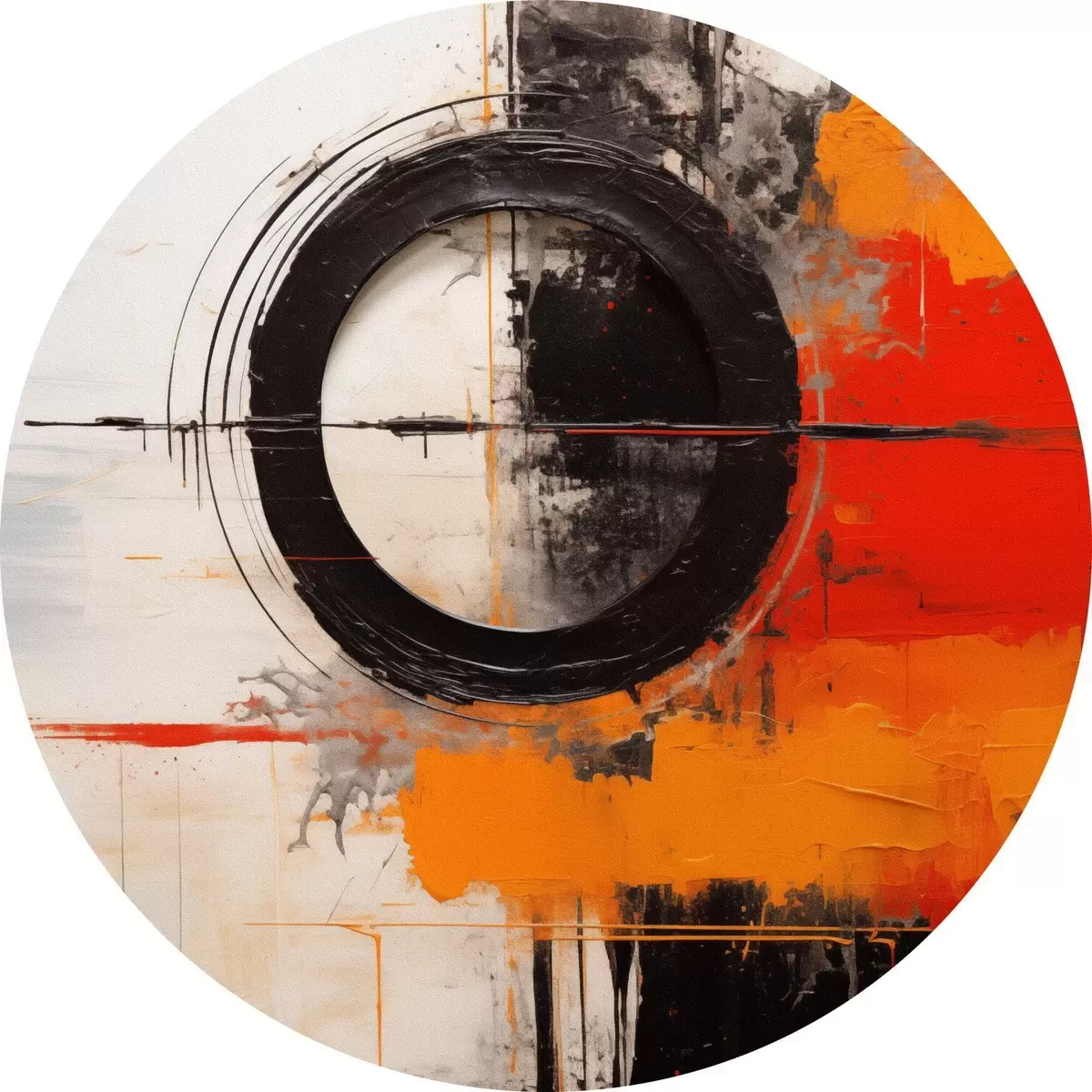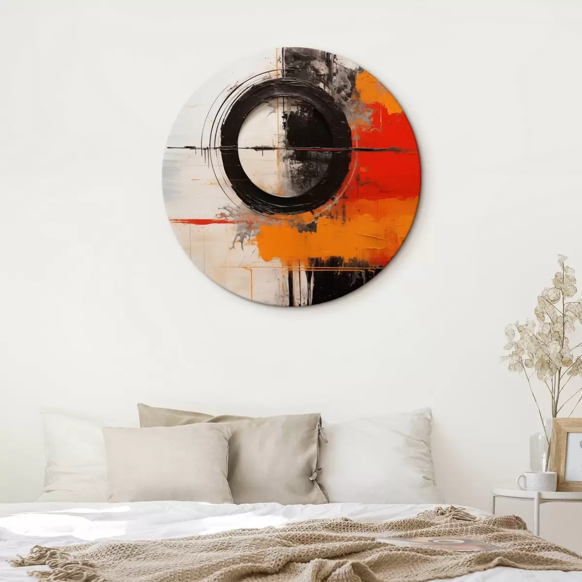 Ronde schilderijen Zwarte cirkel op wit, oranje strepen en spatten r46549