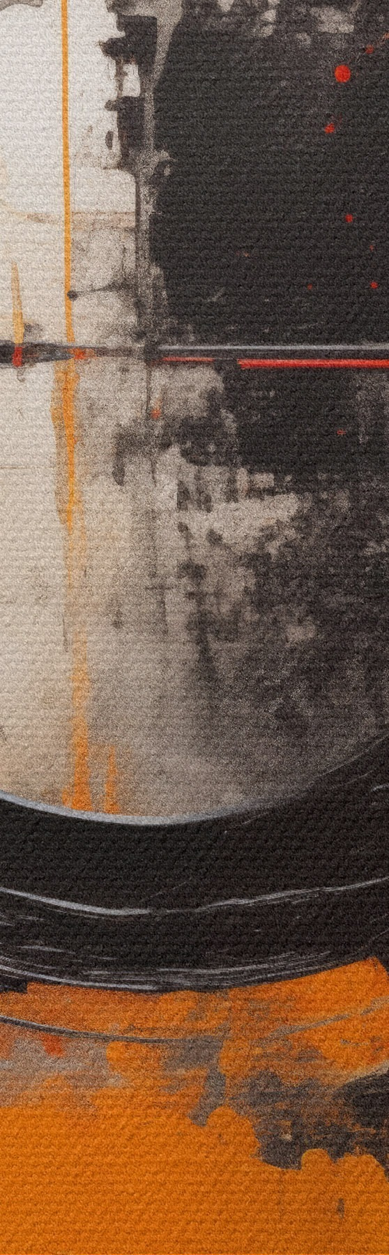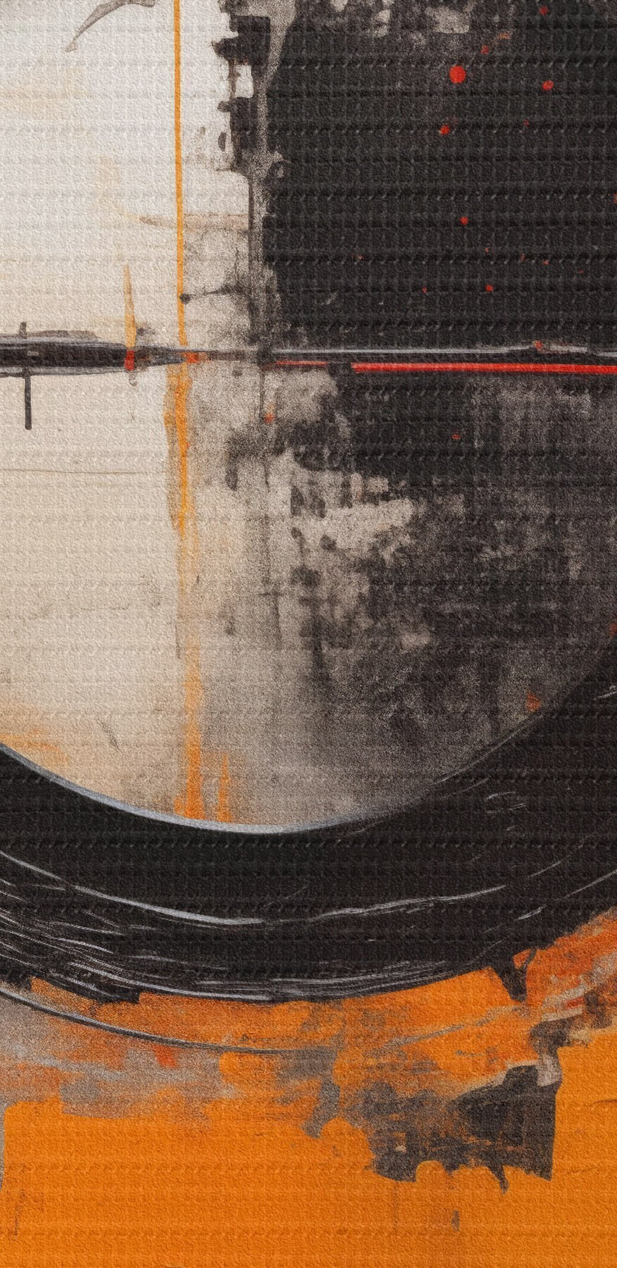 Ronde schilderijen Zwarte cirkel op wit, oranje strepen en spatten Nr r46549