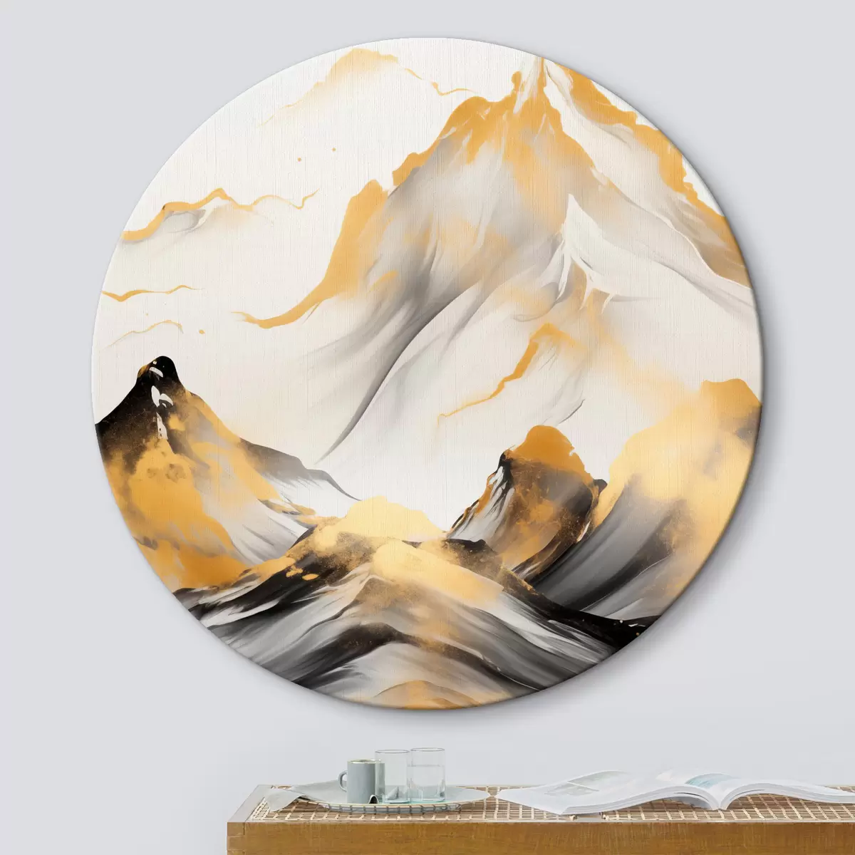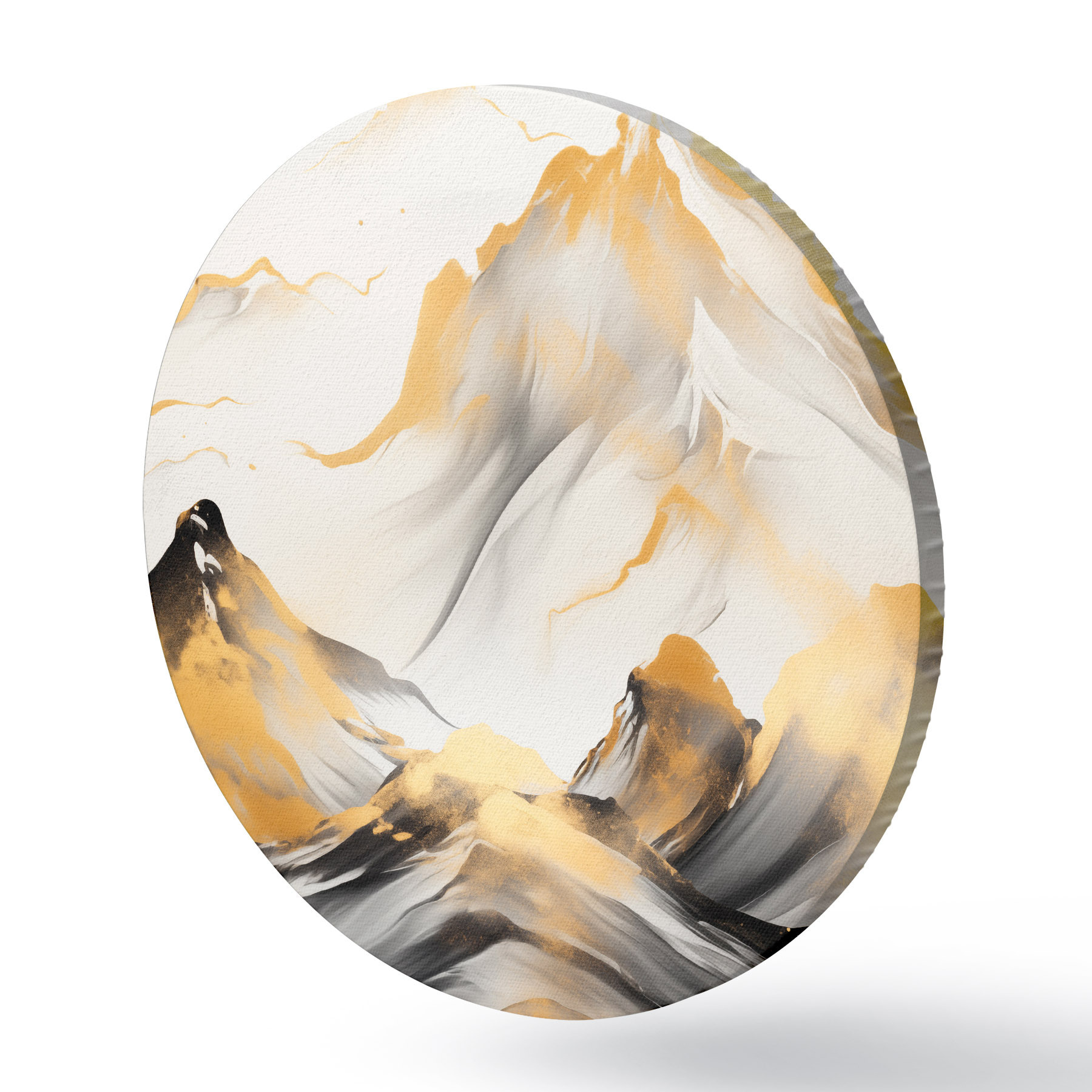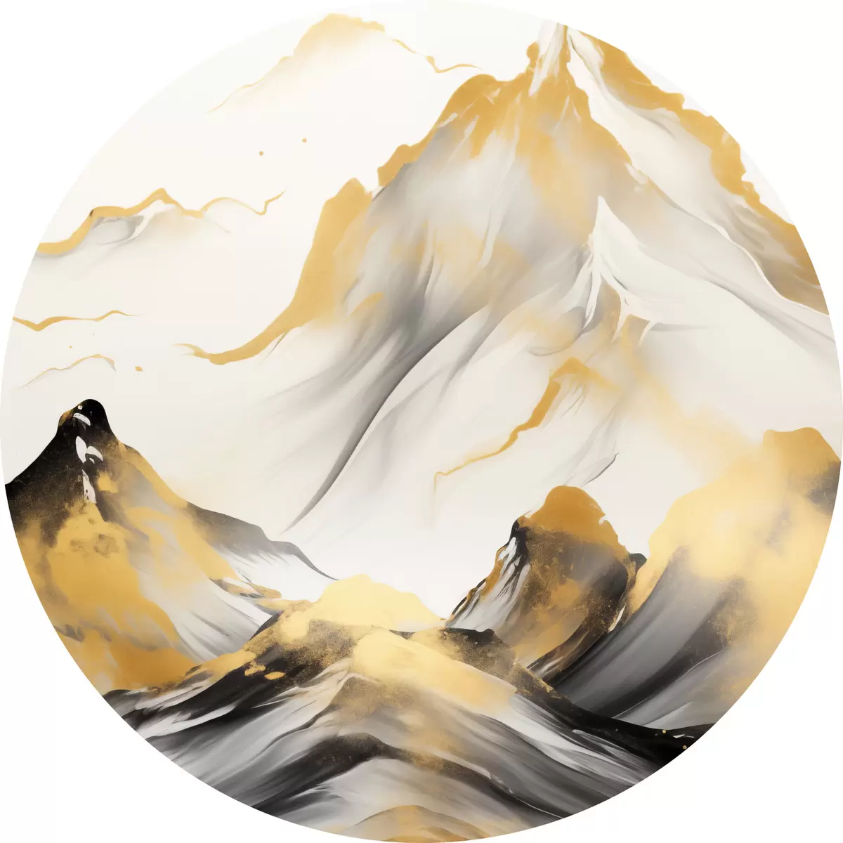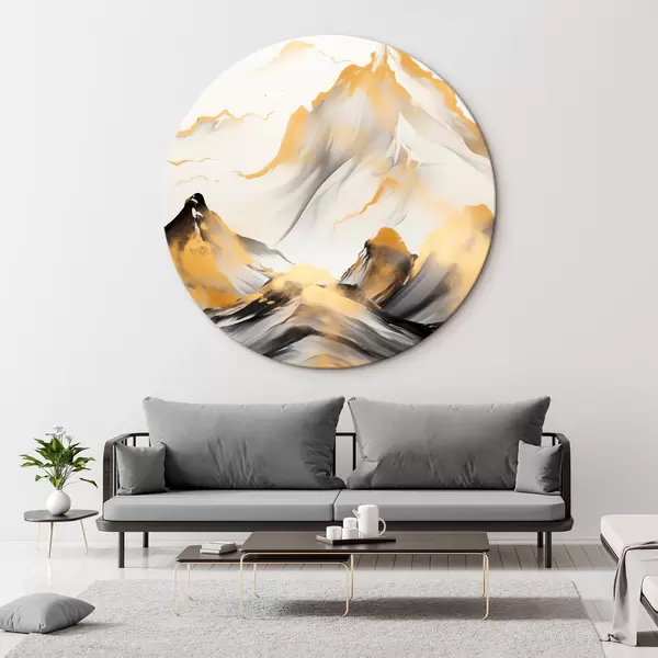 Ronde schilderijen Getextureerde gele en zwarte bergen met besneeuwde toppen, inktwasstijl, minimalistische bergketen Nr r46683