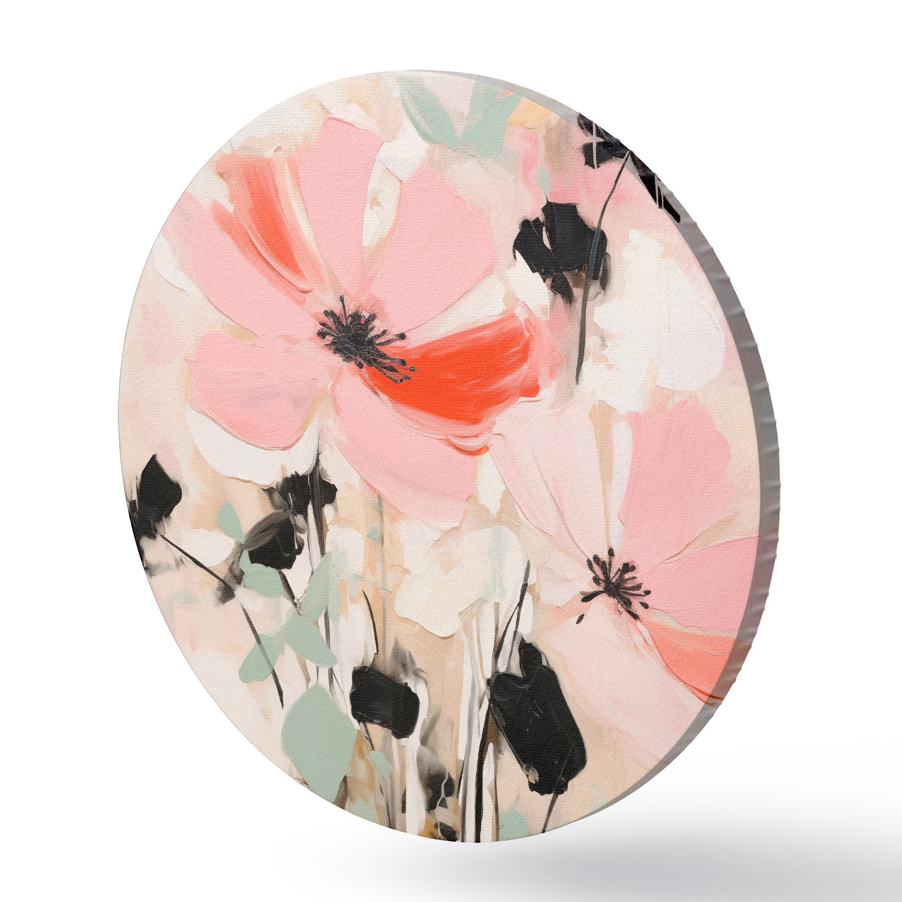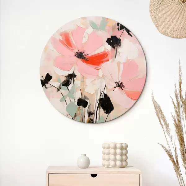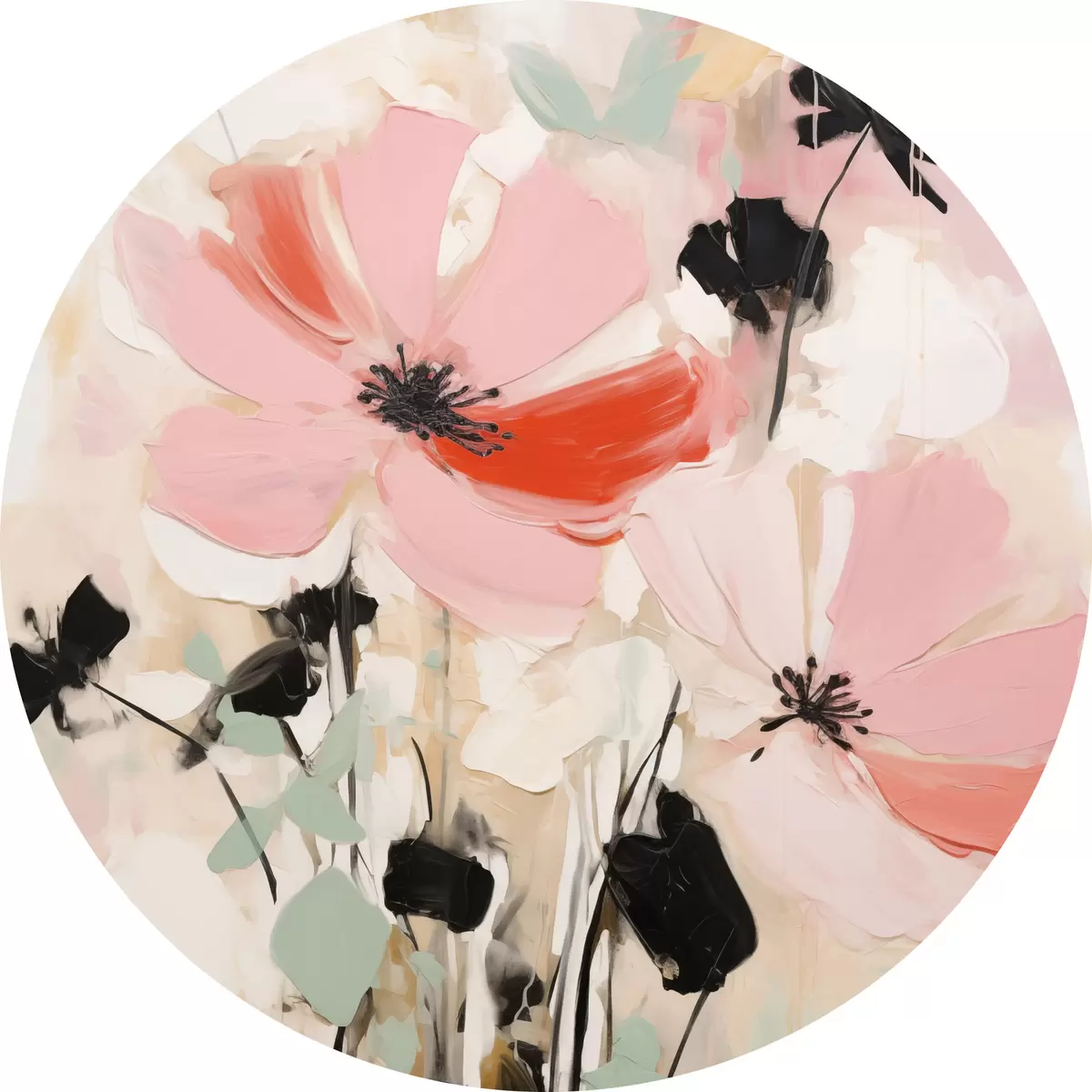 Ronde schilderijen Roze en zwarte bloemen met bladeren, zachte pastelkleuren, abstract bloemstuk, minimalistische kunst Nr r46687