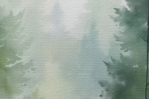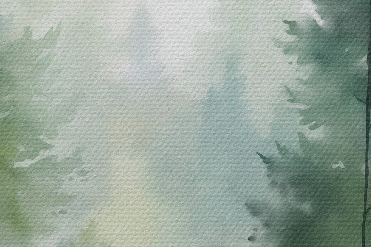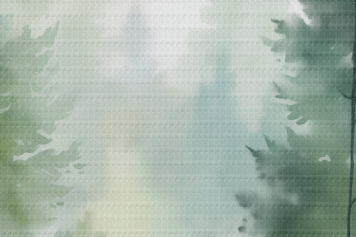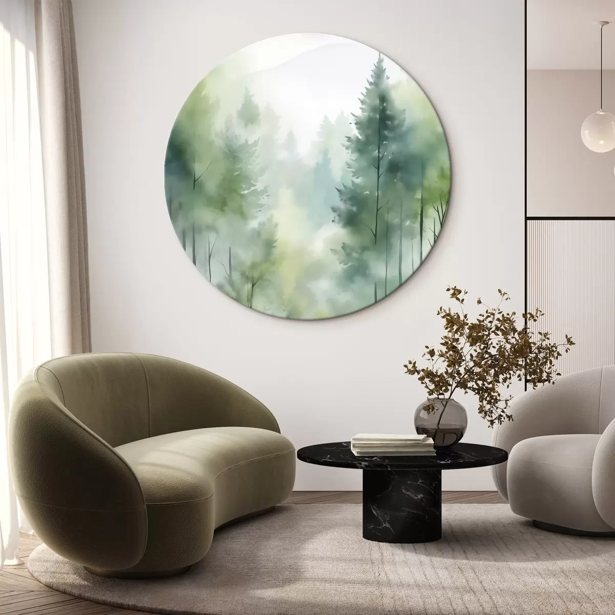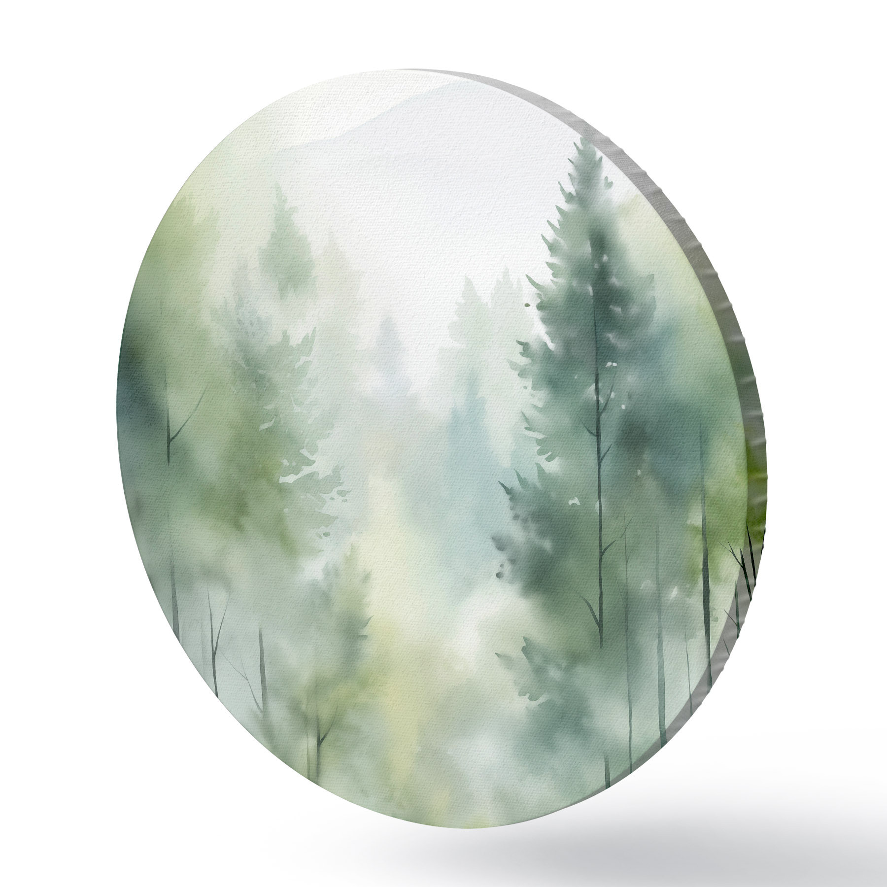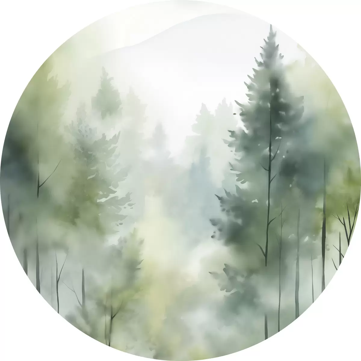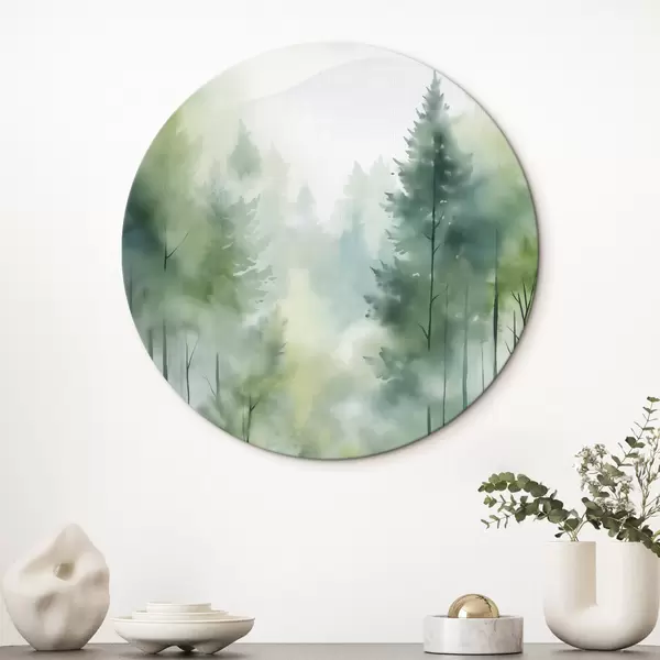 Ronde schilderijen Aquarelschilderij dat een mistig bos met hoge dennenbomen en bergen op de achtergrond imiteert Nr r46690