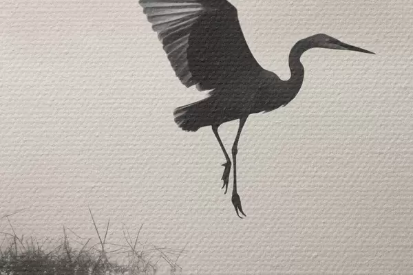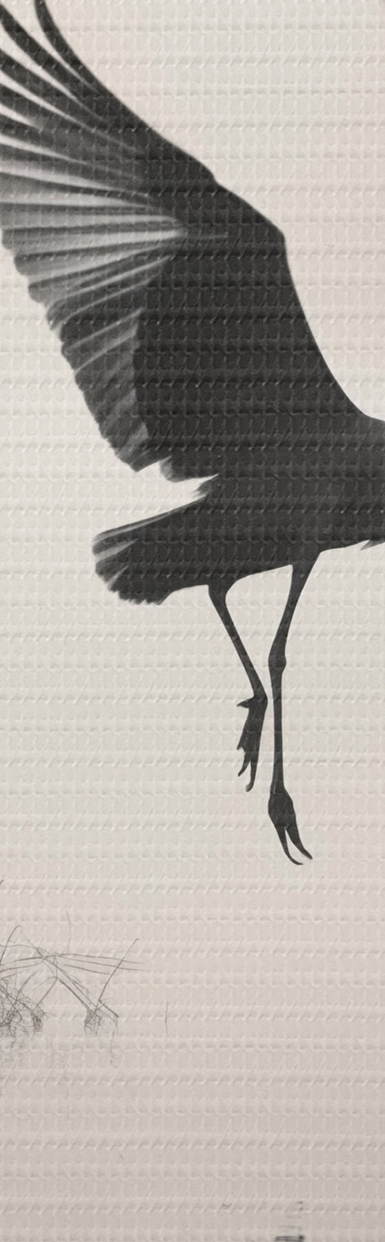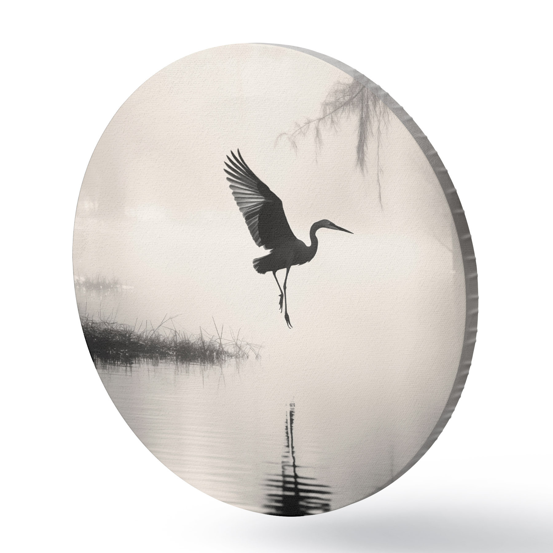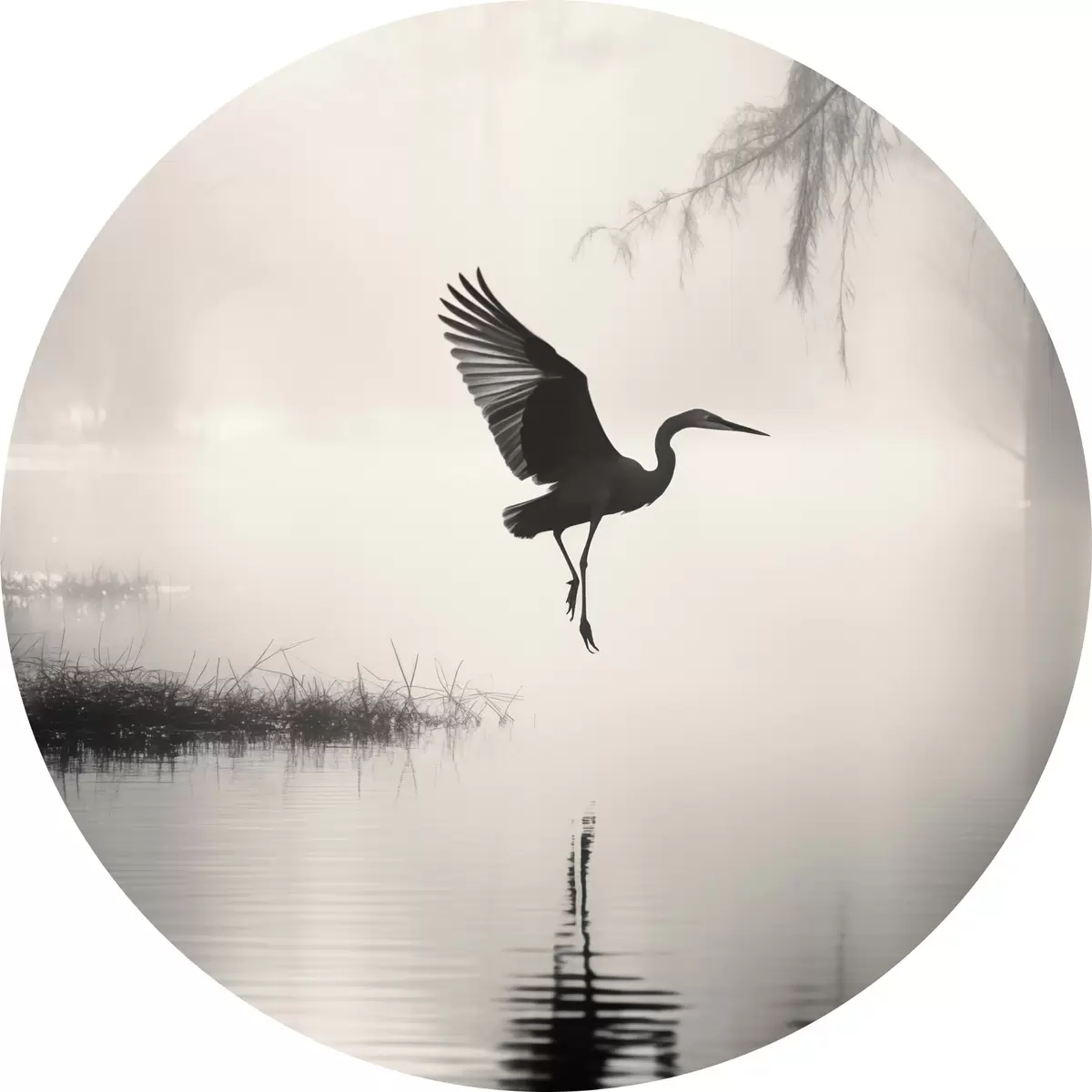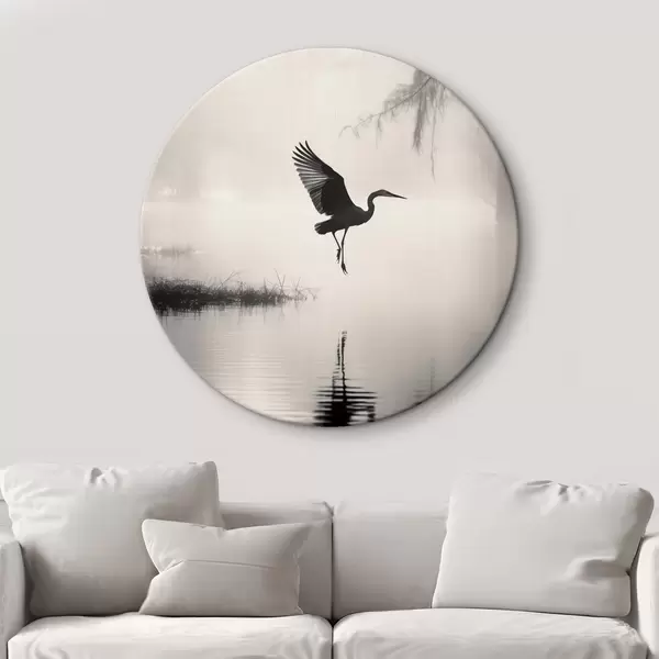Ronde schilderijen Een witte reiger met gespreide vleugels, vliegend in de buurt van hoog riet, zwart-witte minimalistische compositie Nr r46694