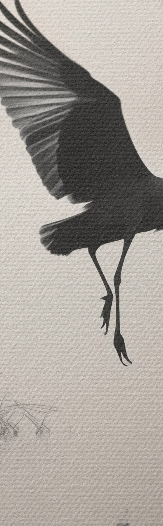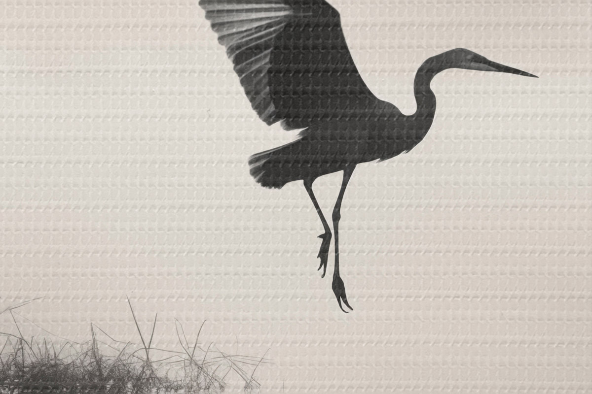 Ronde schilderijen Een witte reiger met gespreide vleugels, vliegend in de buurt van hoog riet, zwart-witte minimalistische compositie r46694