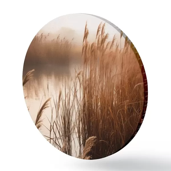 Ronde schilderijen Hoge rietstengels groeien in een watermassa, het water weerspiegelt het riet, mistige achtergrond, zacht licht, natuurtafereel Nr r46695