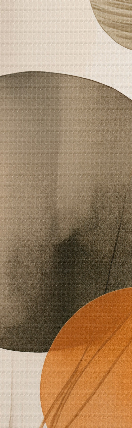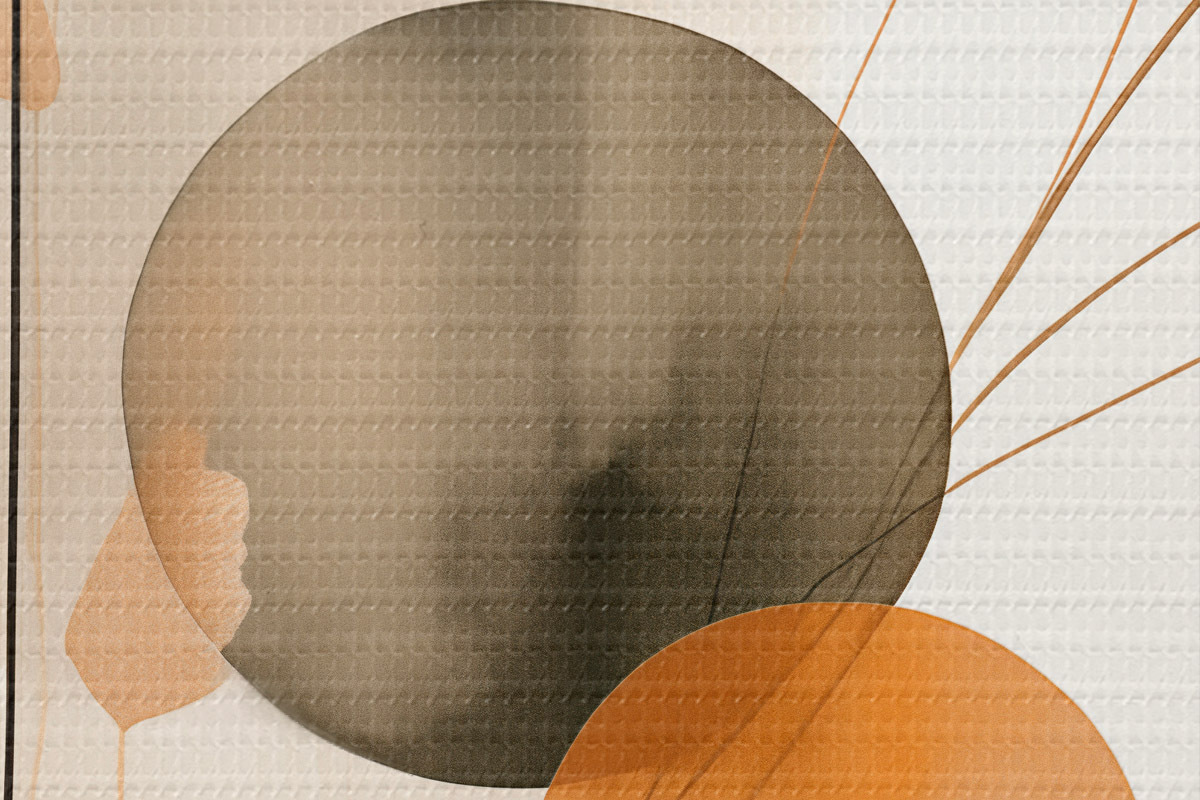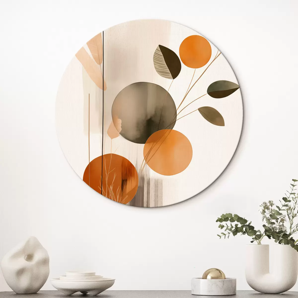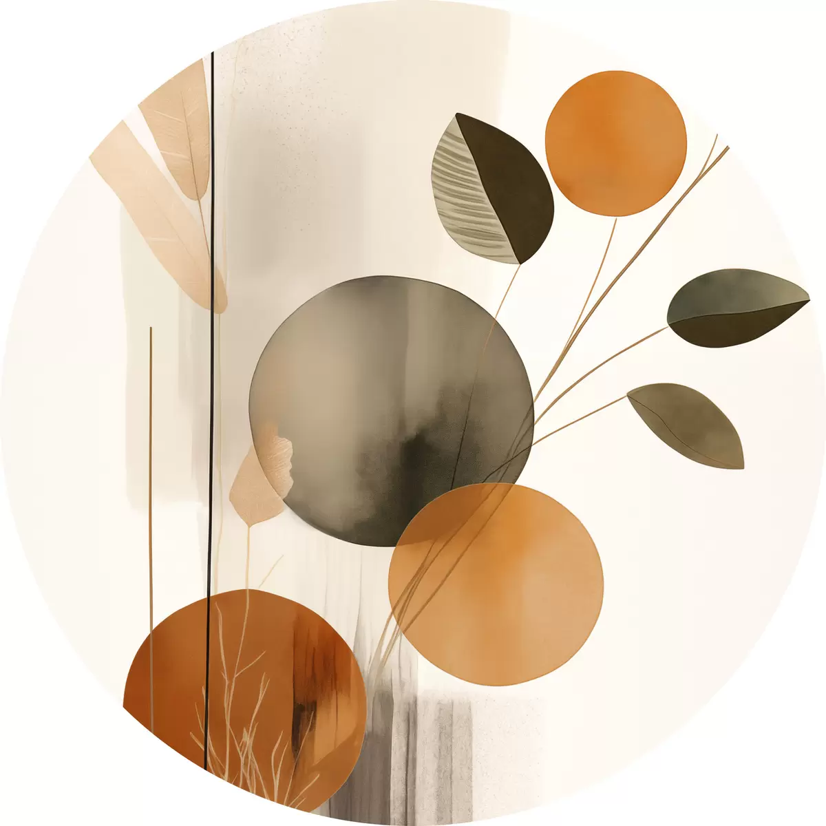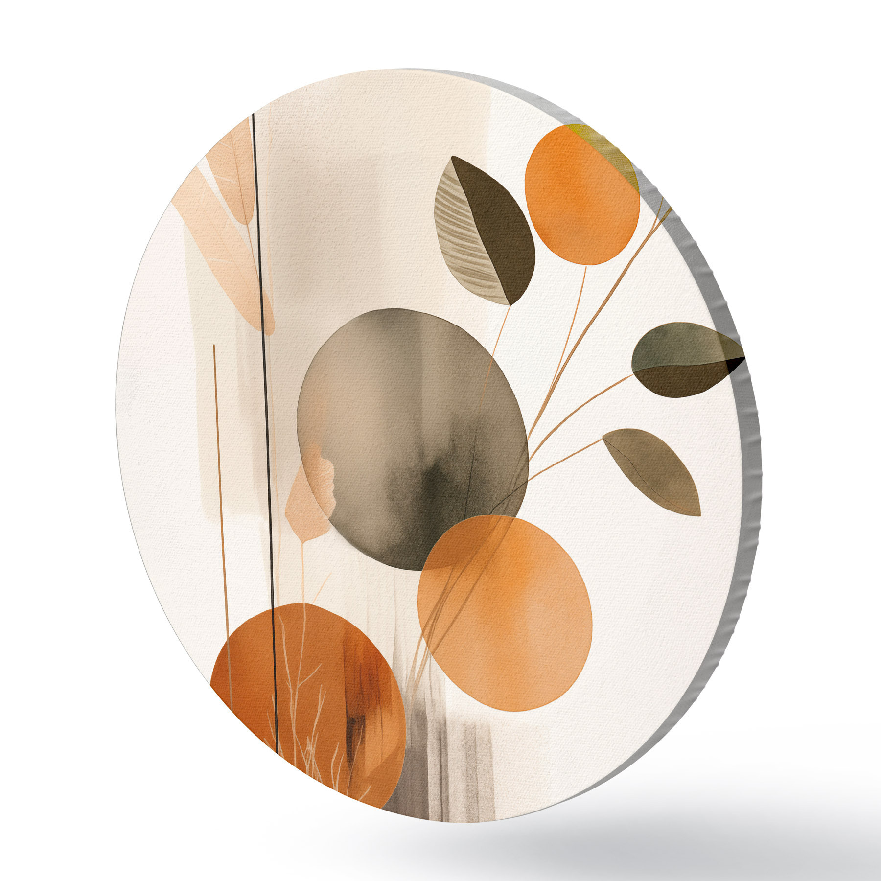 Ronde schilderijen Abstracte schilderijimitatie met oranje en grijze cirkels, bladeren en takken, moderne stijl, aquareleffect Nr r46697