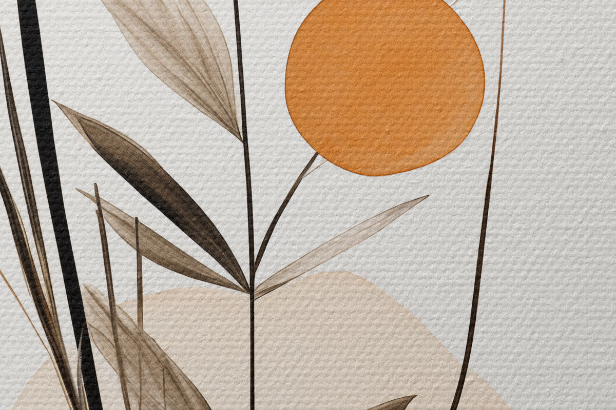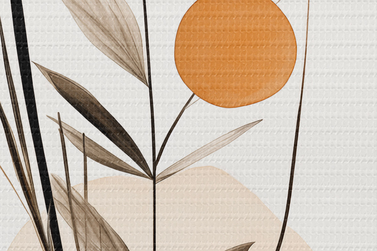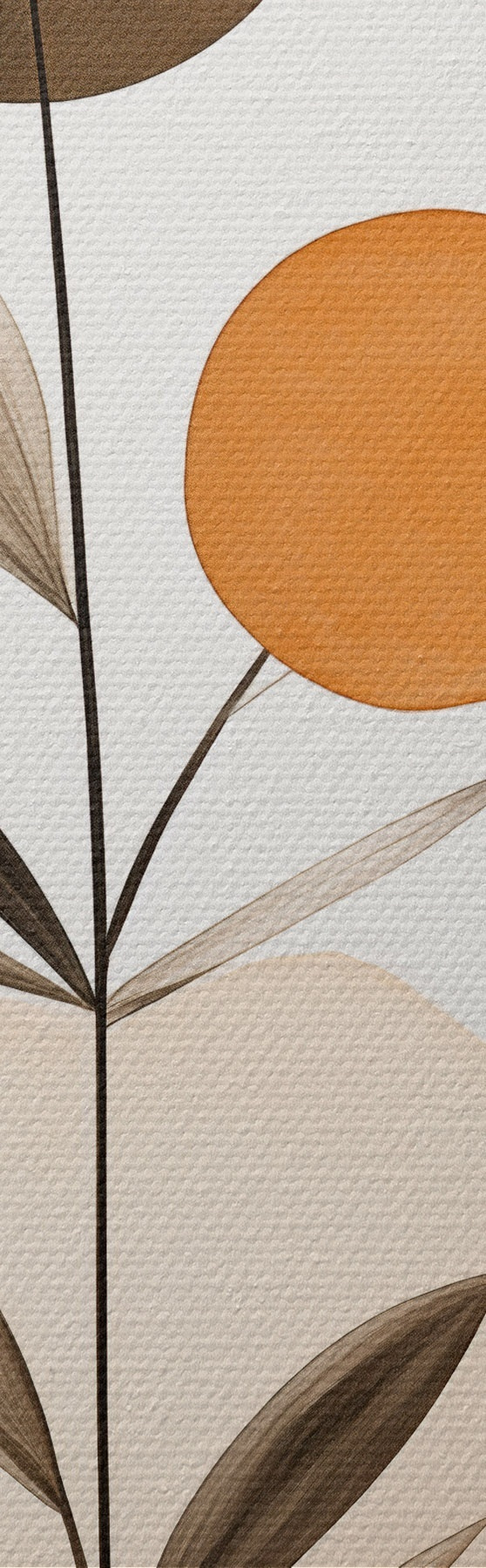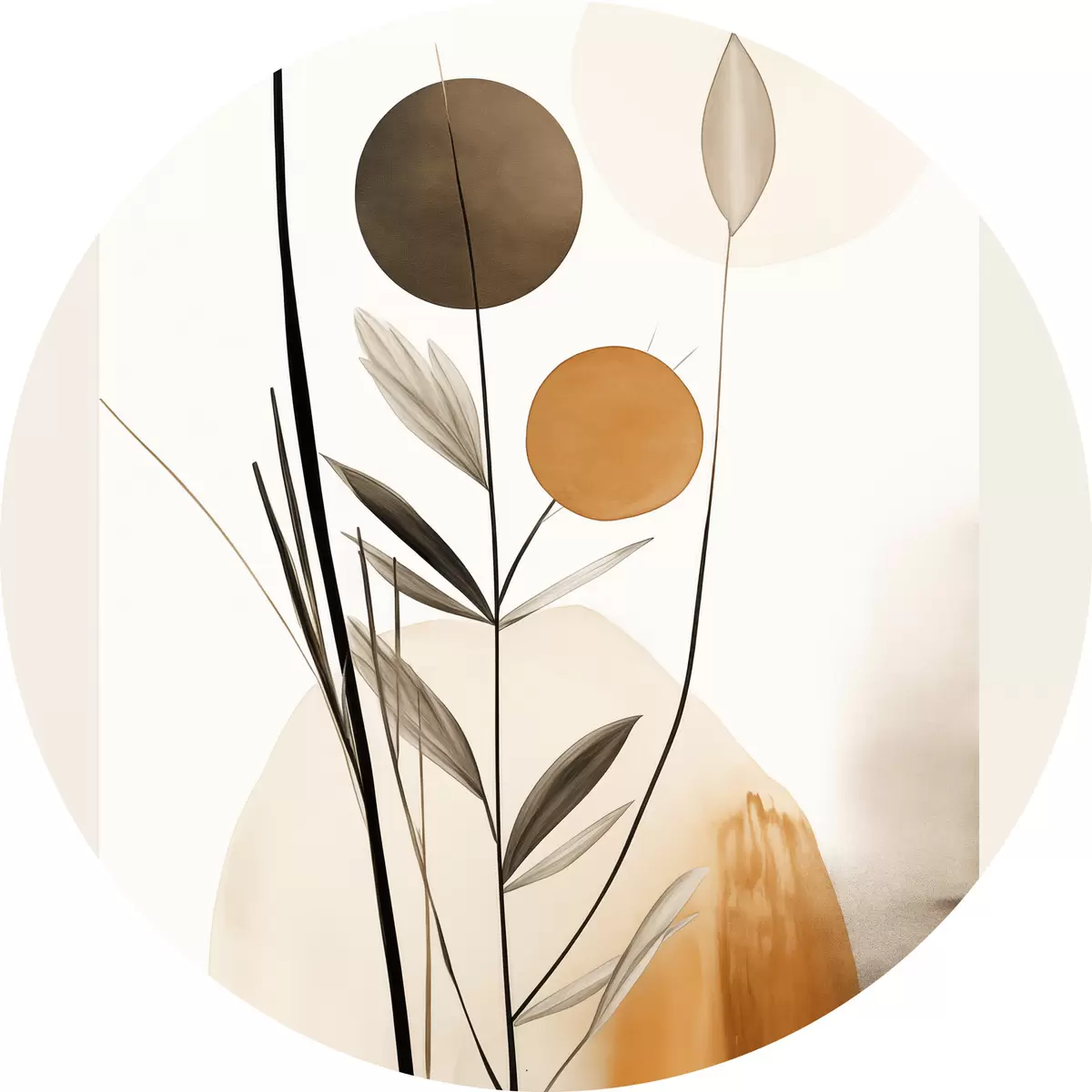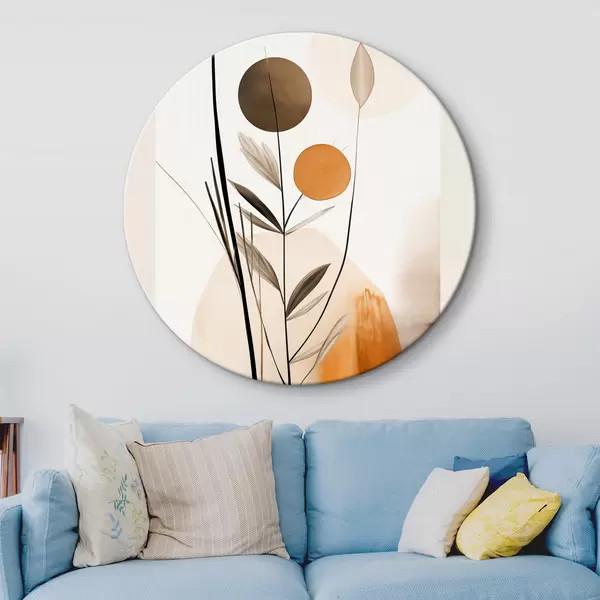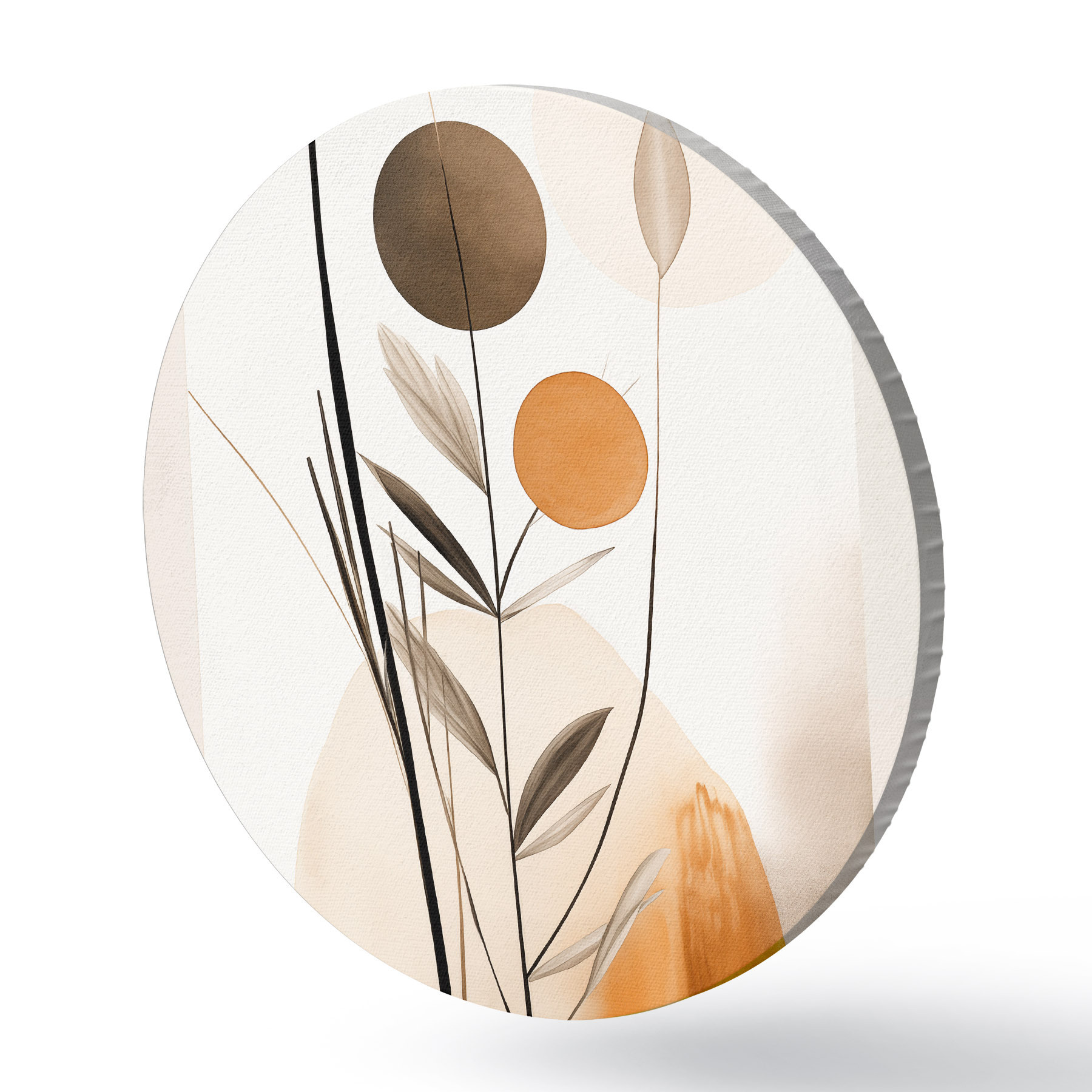 Ronde schilderijen Abstracte schilderijimitatie met oranje en grijze cirkels, bladeren en takken, moderne stijl, aquareleffect Nr r46698
