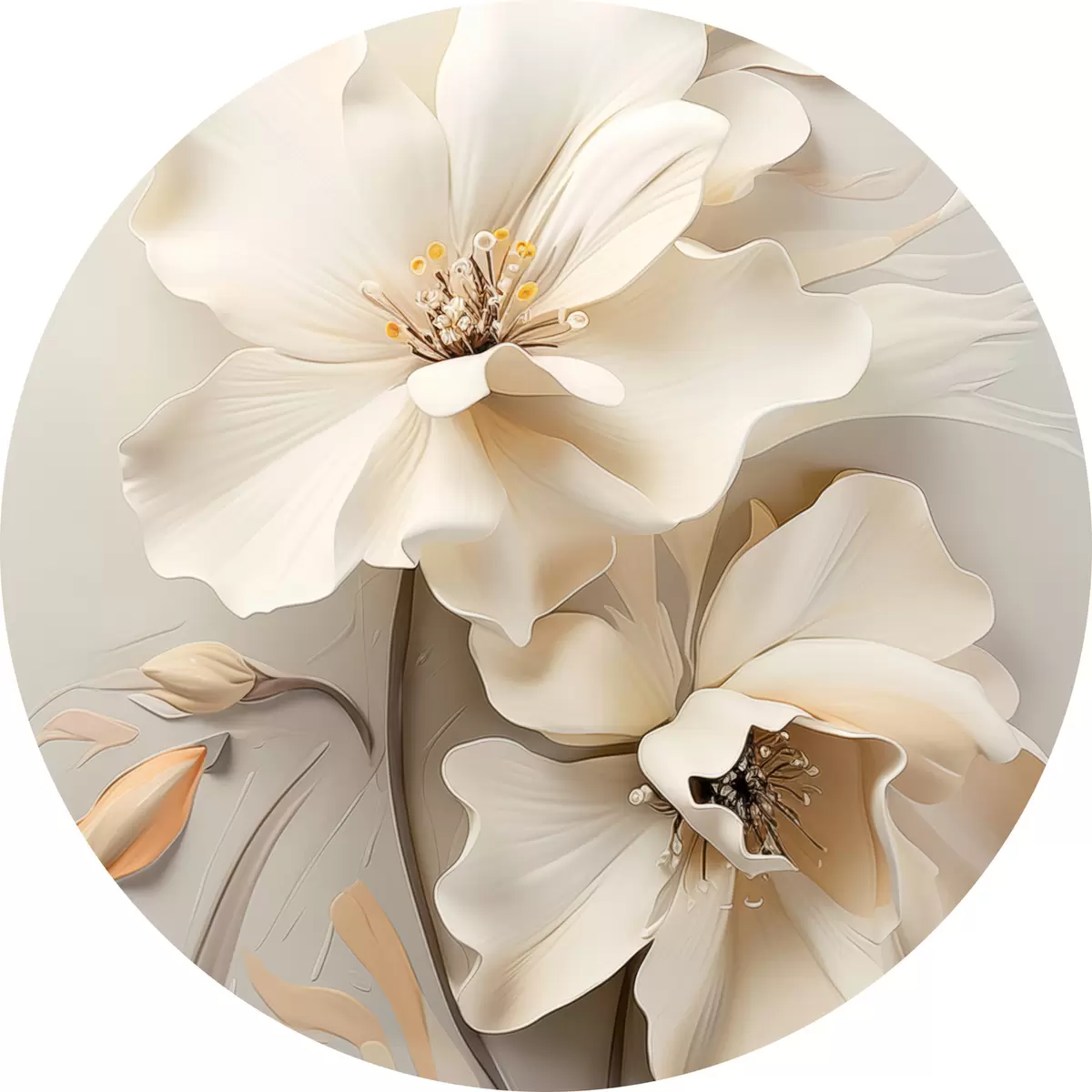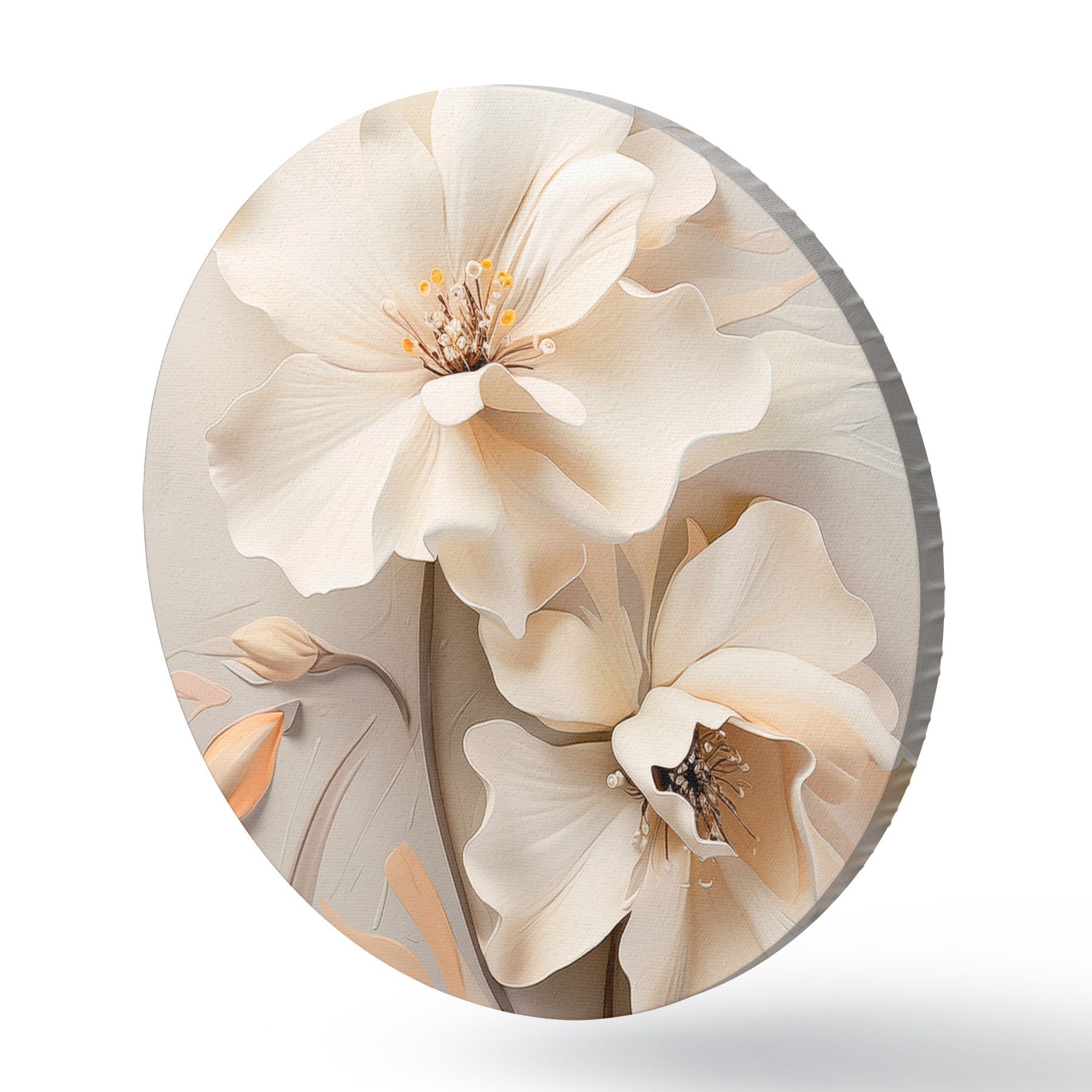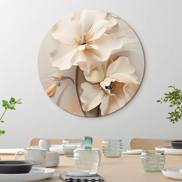 Ronde schilderijen Witte bloemen, bloemblaadjes met zachte schaduwen, lichtbeige achtergrond, elegante compositie, minimalistische stijl Nr r46700