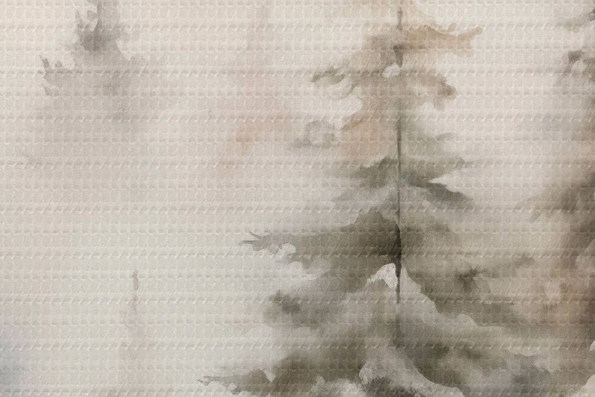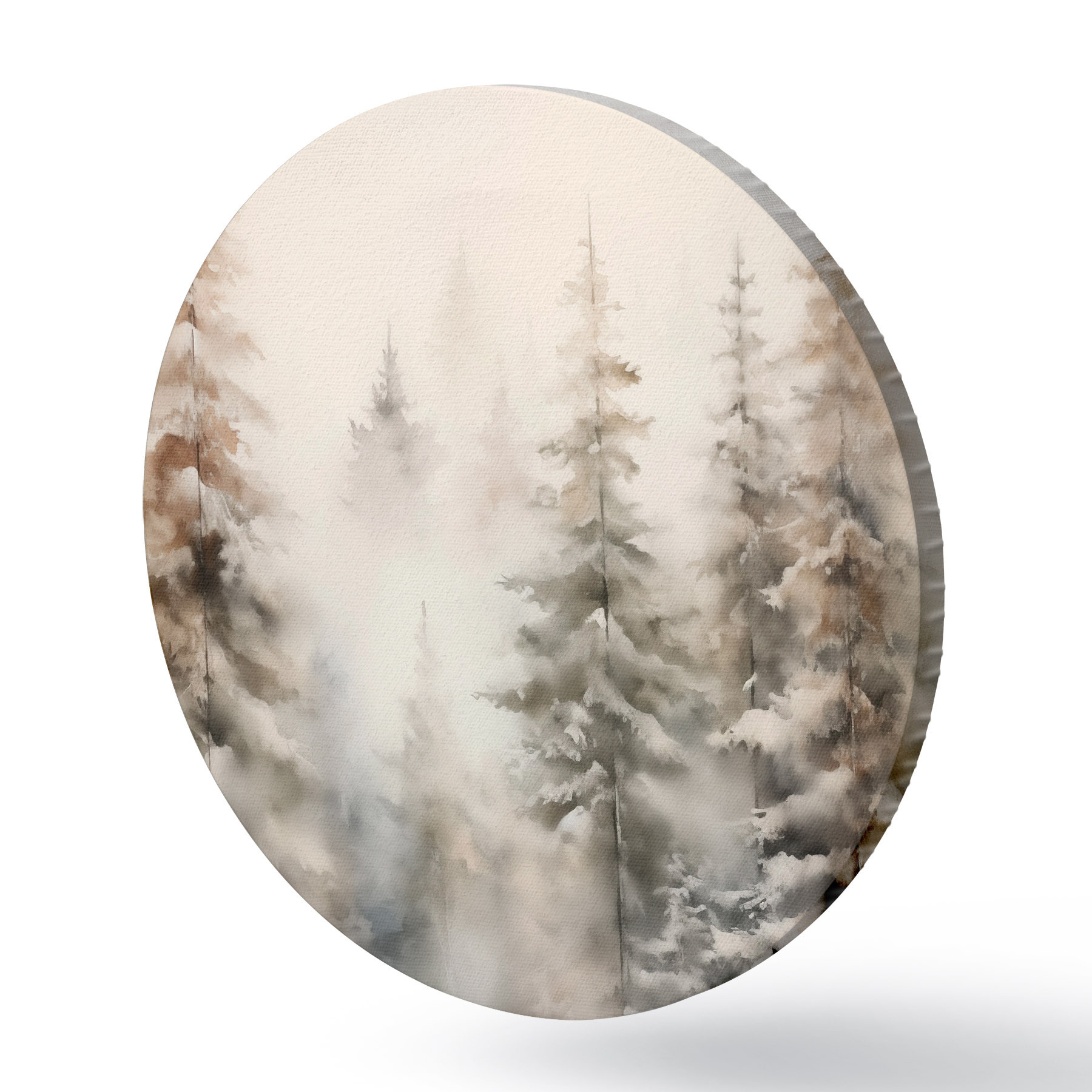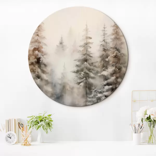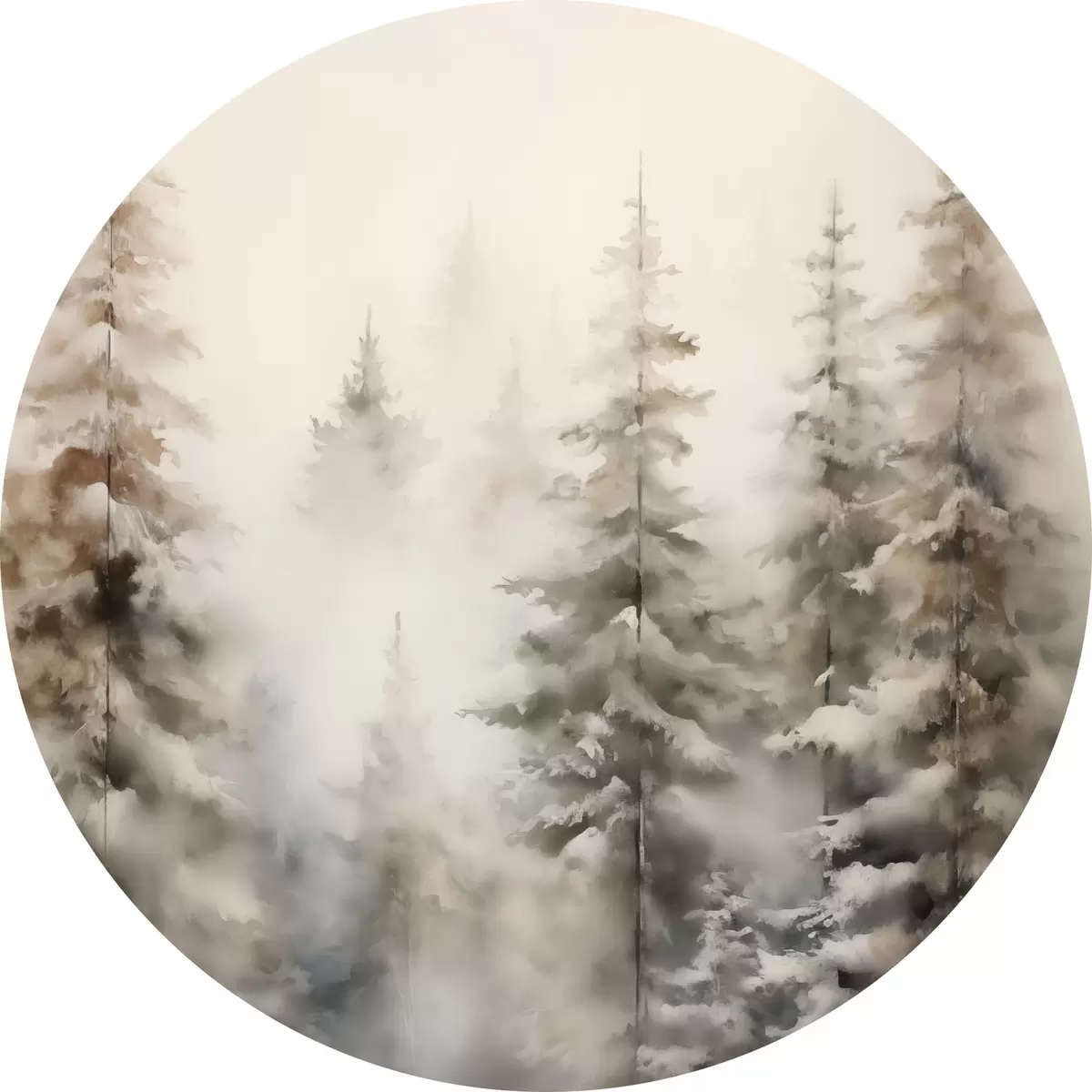 Ronde schilderijen Hoge dennenbomen bedekt met sneeuw, staande in een mistig bos, een zacht, gedempt winters tafereel Nr r46701