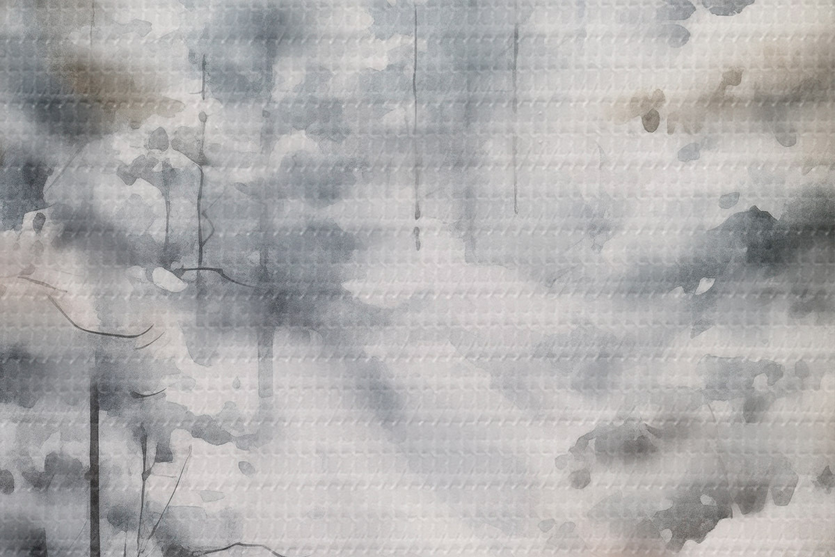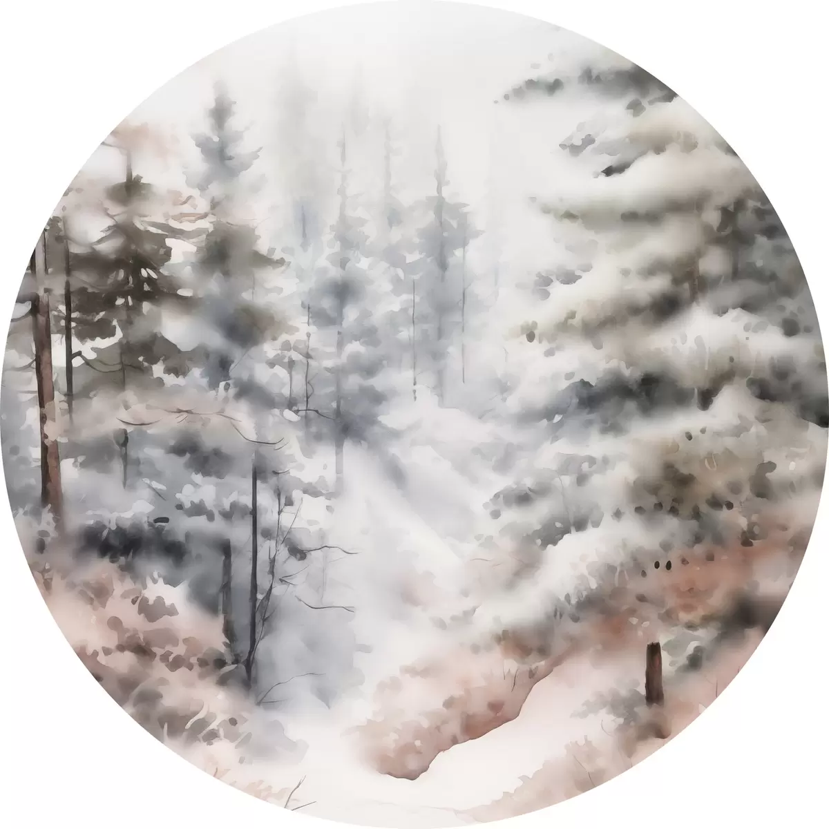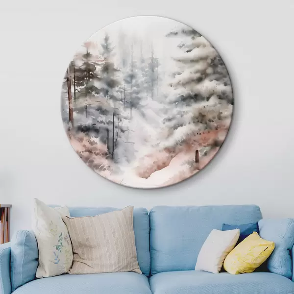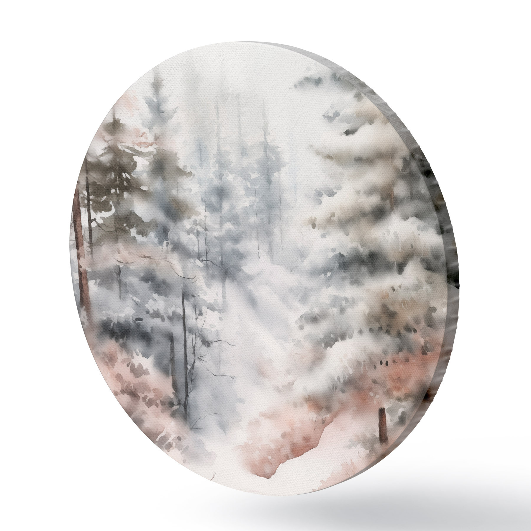 Ronde schilderijen Hoge dennenbomen bedekt met sneeuw, staande in een mistig bos, een zacht, gedempt winters tafereel Nr r46702
