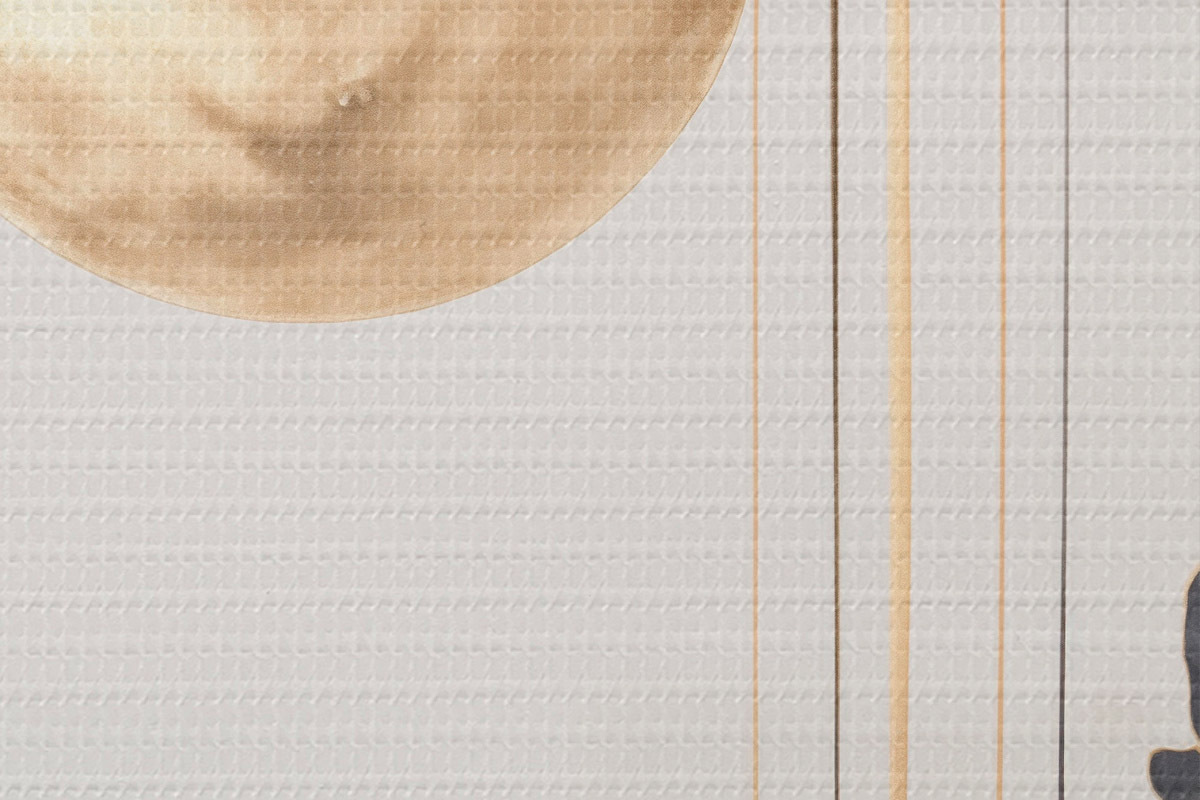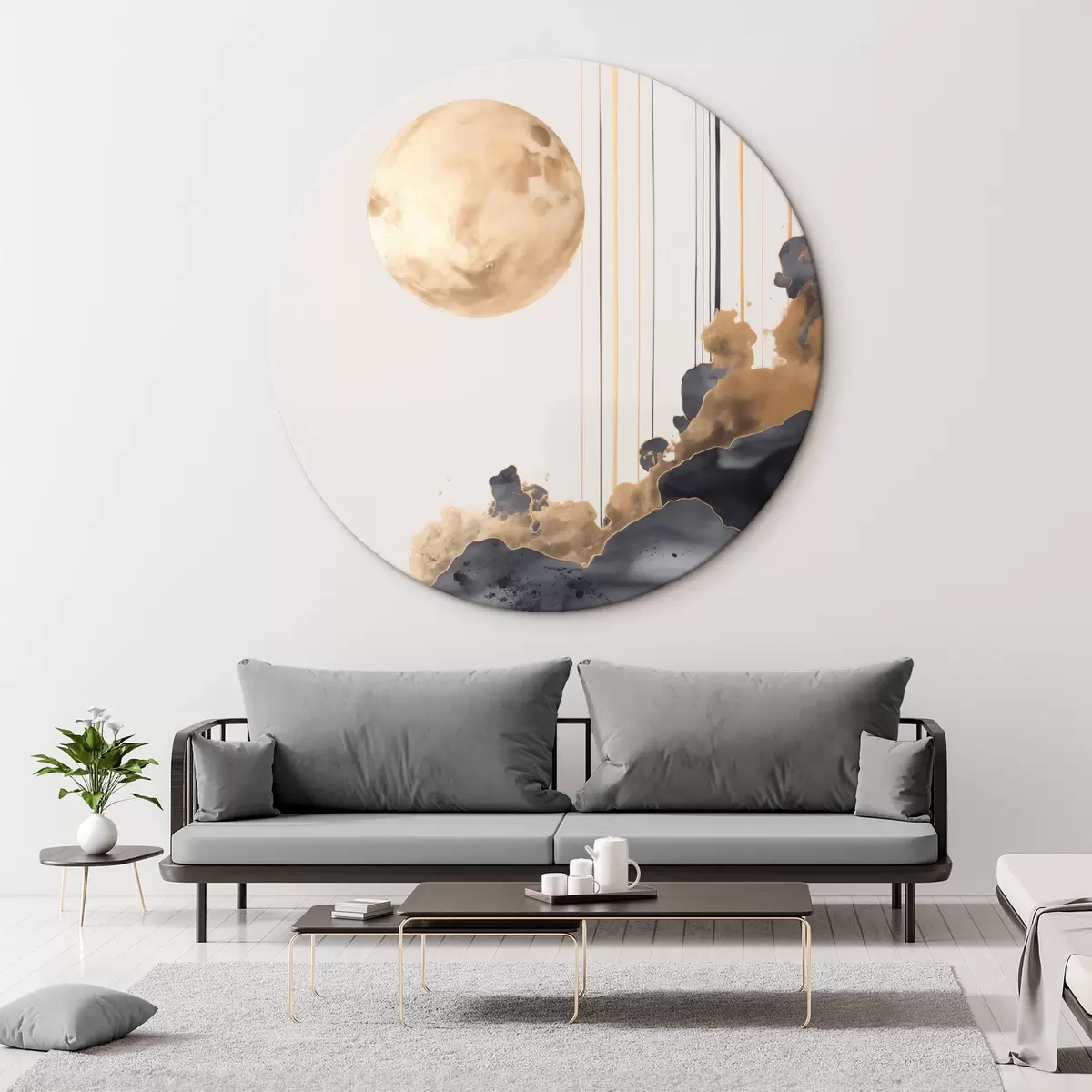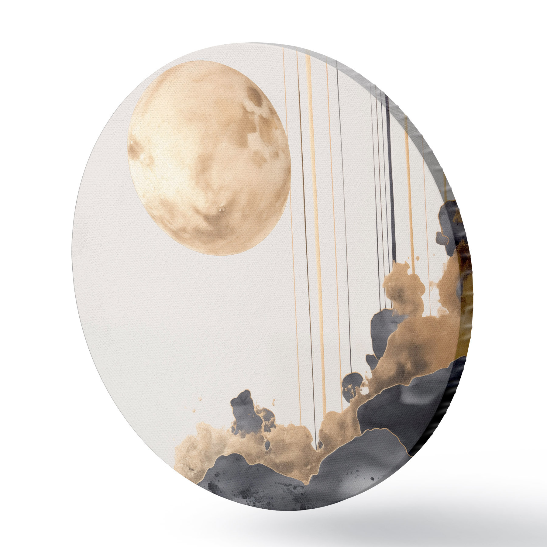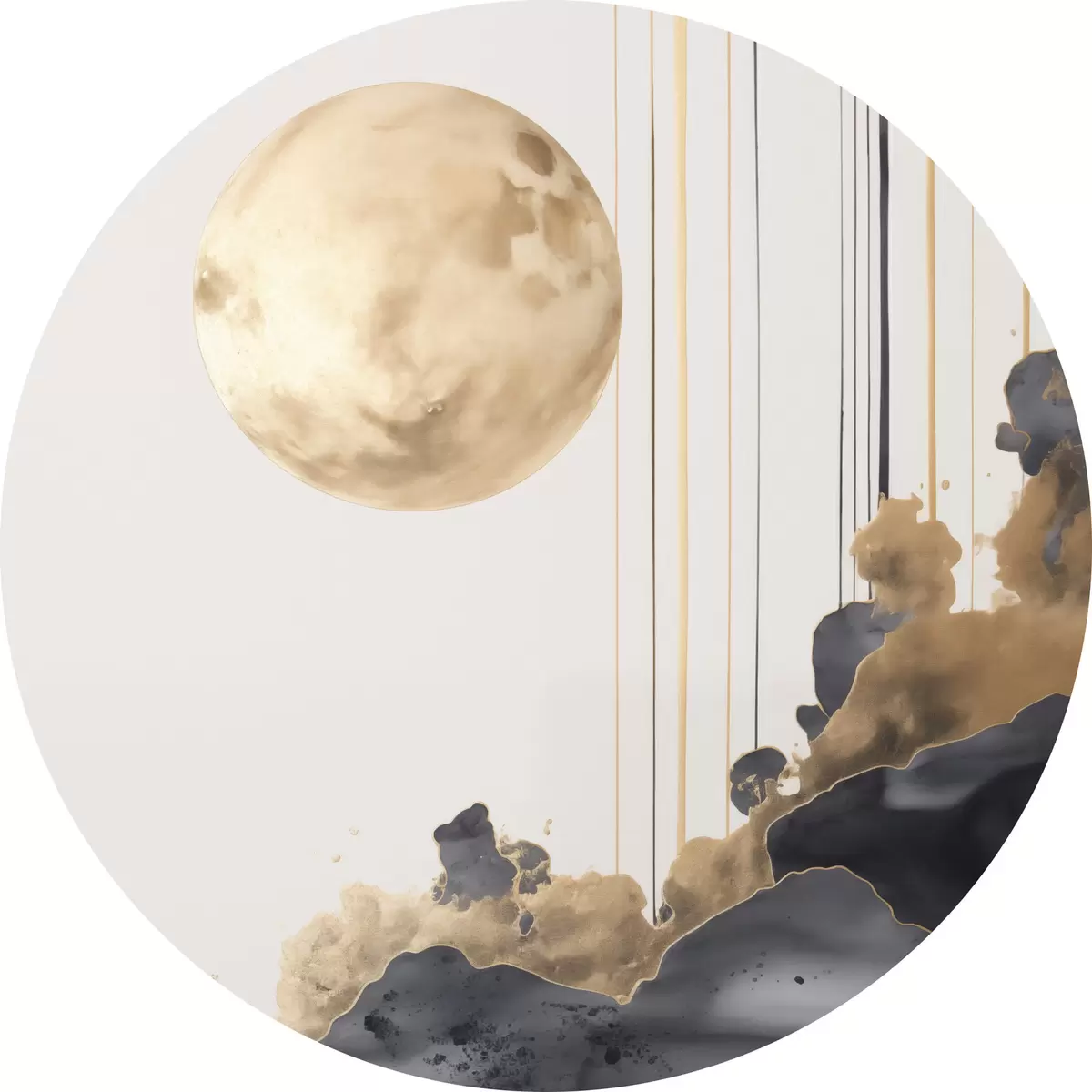 Ronde schilderijen Een volle maan met zwarte en gestructureerde gele wolken, verticale lijnen, abstracte stijl, minimalistisch en modern Nr r46707