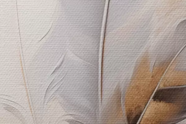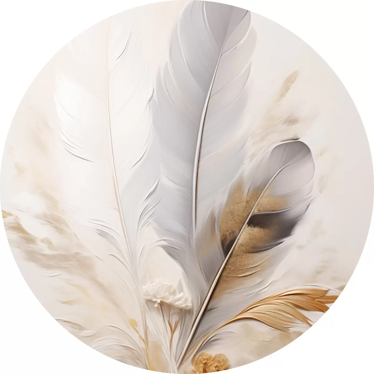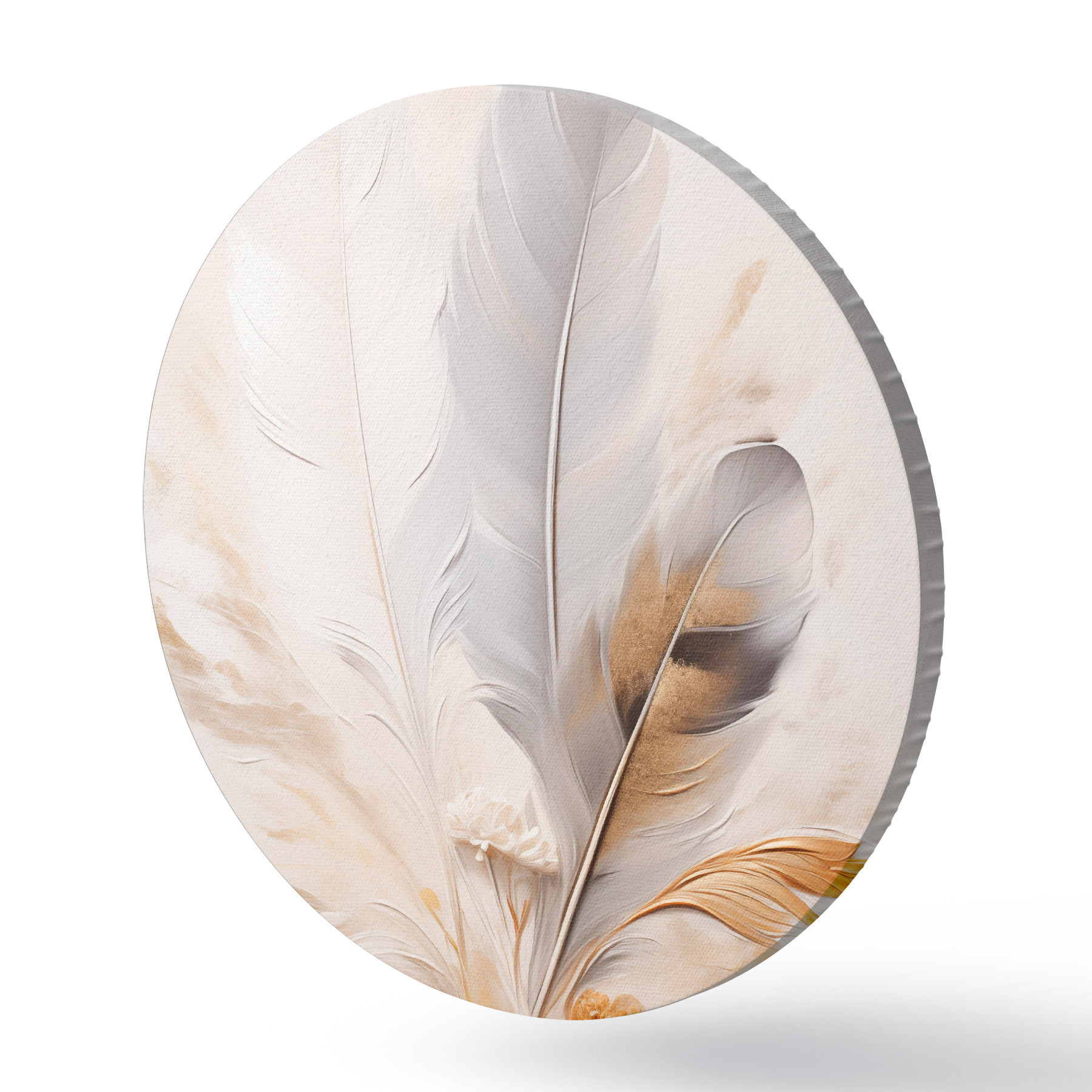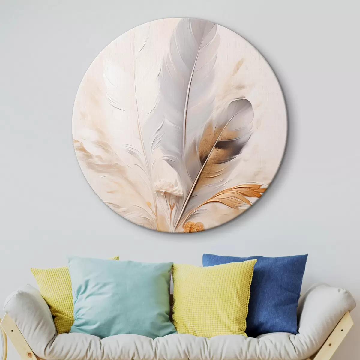 Ronde schilderijen Abstracte veren, omgeven door beige en bruine pluimen, zacht en delicaat, op een lichtbeige achtergrond Nr r46712