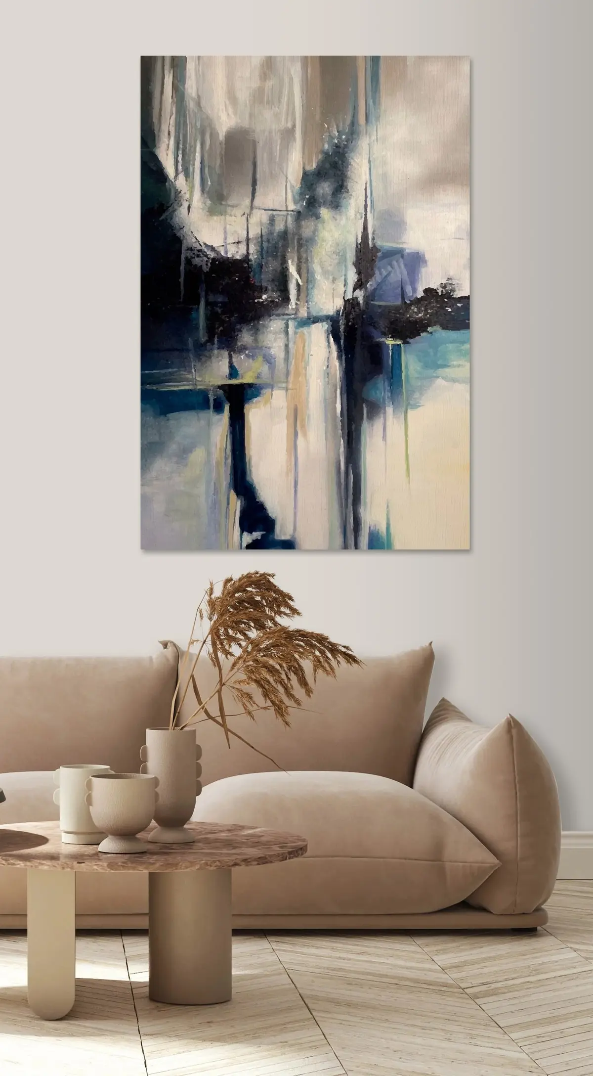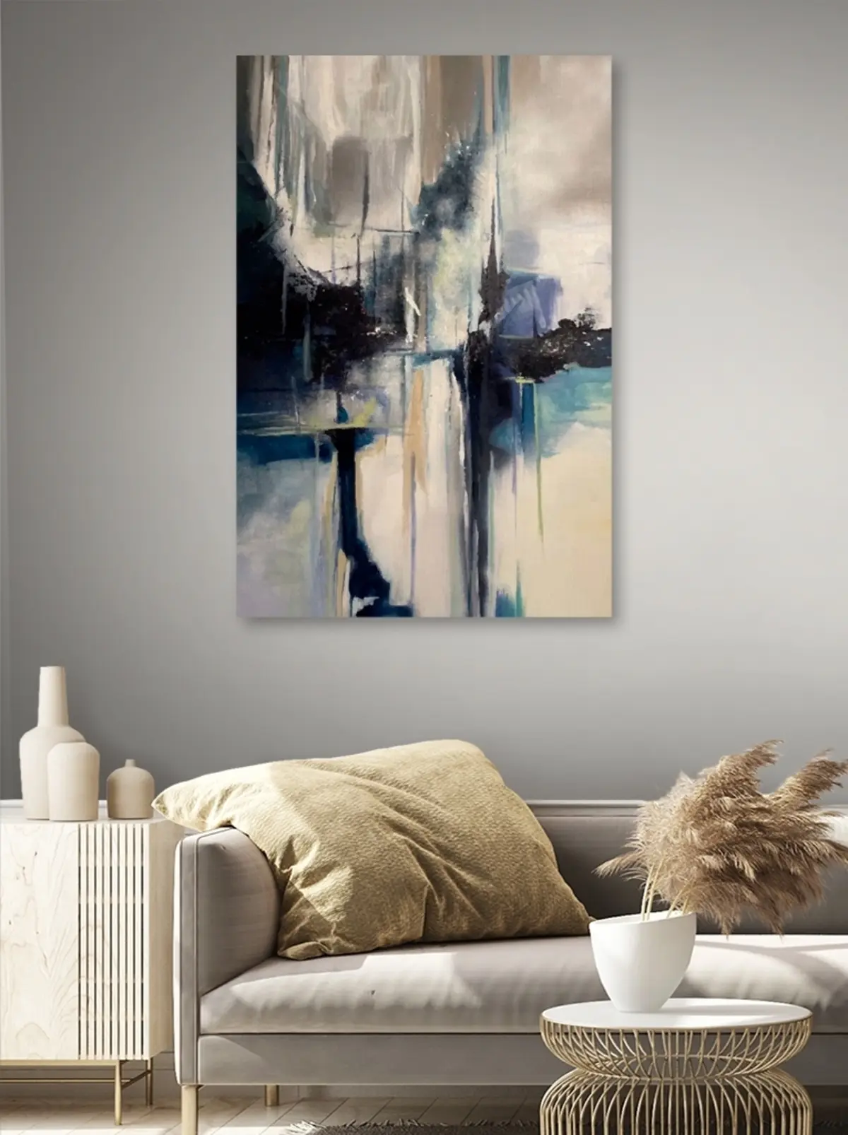 Het schilderij kan direct na ontvangst worden opgehangen. Het schilderij wordt opgespannen op een 2 cm breed houten spieraam.